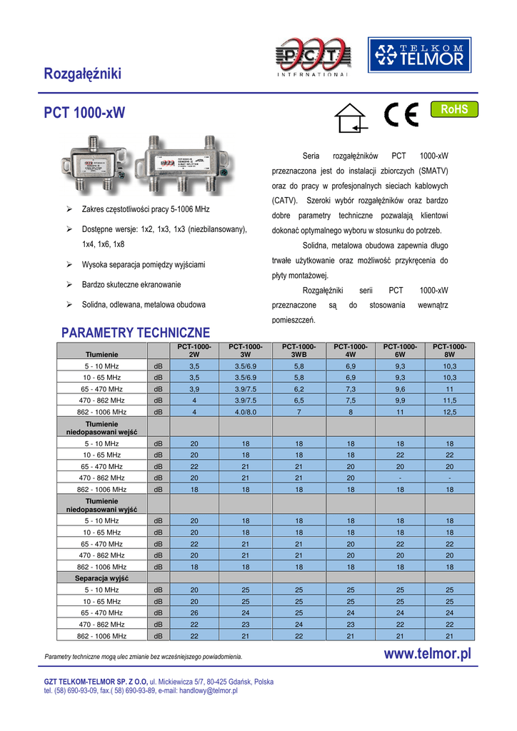 Rozgałęźniki RoHS PCT 1000-xW Seria rozgałęźników PCT 1000-xW przeznaczona jest do instalacji zbiorczych (SMATV) oraz do pracy w profesjonalnych sieciach kablowych (CATV). Zakres częstotliwości pracy 5-1006 MHz Dostępne wersje: 1x2, 1x3, 1x3 (niezbilansowany), Szeroki wybór rozgałęźników oraz bardzo dobre parametry techniczne pozwalają klientowi dokonać optymalnego wyboru w stosunku do potrzeb. 1x4, 1x6, 1x8 Solidna, metalowa obudowa zapewnia długo Wysoka separacja pomiędzy wyjściami Bardzo skuteczne ekranowanie Solidna, odlewana, metalowa obudowa trwałe użytkowanie oraz możliwość przykręcenia do płyty montażowej. Rozgałęźniki przeznaczone są serii do PCT 1000-xW stosowania wewnątrz pomieszczeń. PARAMETRY TECHNICZNE Tłumienie PCT-10002W PCT-10003W PCT-10003WB PCT-10004W PCT-10006W PCT-10008W 5 - 10 MHz dB 3,5 3.5/6.9 5,8 6,9 9,3 10,3 10 - 65 MHz dB 3,5 3.5/6.9 5,8 6,9 9,3 10,3 65 - 470 MHz dB 3,9 3.9/7.5 6,2 7,3 9,6 11 470 - 862 MHz dB 4 3.9/7.5 6,5 7,5 9,9 11,5 862 - 1006 MHz dB 4 4.0/8.0 7 8 11 12,5 Tłumienie niedopasowani wejść 5 - 10 MHz dB 20 18 18 18 18 18 10 - 65 MHz dB 20 18 18 18 22 22 20 65 - 470 MHz dB 22 21 21 20 20 470 - 862 MHz dB 20 21 21 20 - - 862 - 1006 MHz dB 18 18 18 18 18 18 5 - 10 MHz dB 20 18 18 18 18 18 Tłumienie niedopasowani wyjść 10 - 65 MHz dB 20 18 18 18 18 18 65 - 470 MHz dB 22 21 21 20 22 22 470 - 862 MHz dB 20 21 21 20 20 20 862 - 1006 MHz dB 18 18 18 18 18 18 5 - 10 MHz dB 20 25 25 25 25 25 Separacja wyjść 10 - 65 MHz dB 20 25 25 25 25 25 65 - 470 MHz dB 26 24 25 24 24 24 470 - 862 MHz dB 22 23 24 23 22 22 862 - 1006 MHz dB 22 21 22 21 21 21 Parametry techniczne mogą ulec zmianie bez wcześniejszego powiadomienia. GZT TELKOM-TELMOR SP. Z O.O, ul. Mickiewicza 5/7, 80-425 Gdańsk, Polska tel. (58) 690-93-09, fax.( 58) 690-93-89, e-mail: [email protected] www.telmor.pl