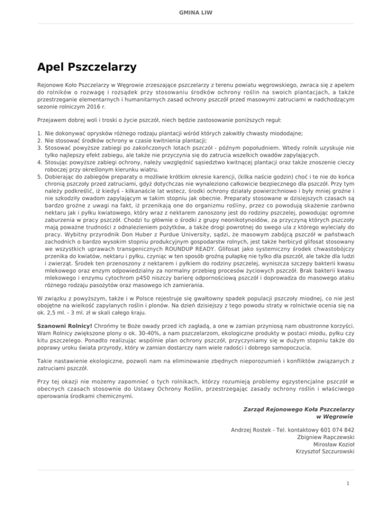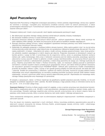 GMINA LIW Apel Pszczelarzy Rejonowe Koło Pszczelarzy w Węgrowie zrzeszające pszczelarzy z terenu powiatu węgrowskiego, zwraca się z apelem do rolników o rozwagę i rozsądek przy stosowaniu środków ochrony roślin na swoich plantacjach, a także przestrzeganie elementarnych i humanitarnych zasad ochrony pszczół przed masowymi zatruciami w nadchodzącym sezonie rolniczym 2016 r. Przejawem dobrej woli i troski o życie pszczół, niech będzie zastosowanie poniższych reguł: 1. Nie dokonywać oprysków różnego rodzaju plantacji wśród których zakwitły chwasty miododajne; 2. Nie stosować środków ochrony w czasie kwitnienia plantacji; 3. Stosować powyższe zabiegi po zakończonych lotach pszczół - późnym popołudniem. Wtedy rolnik uzyskuje nie tylko najlepszy efekt zabiegu, ale także nie przyczynia się do zatrucia wszelkich owadów zapylających. 4. Stosując powyższe zabiegi ochrony, należy uwzględnić sąsiedztwo kwitnącej plantacji oraz także znoszenie cieczy roboczej przy określonym kierunku wiatru. 5. Dobierając do zabiegów preparaty o możliwie krótkim okresie karencji, (kilka naście godzin) choć i te nie do końca chronią pszczoły przed zatruciami, gdyż dotychczas nie wynaleziono całkowicie bezpiecznego dla pszczół. Przy tym należy podkreślić, iż kiedyś - kilkanaście lat wstecz, środki ochrony działały powierzchniowo i były mniej groźne i nie szkodziły owadom zapylającym w takim stopniu jak obecnie. Preparaty stosowane w dzisiejszych czasach są bardzo groźne z uwagi na fakt, iż przenikają one do organizmu rośliny, przez co powodują skażenie zarówno nektaru jak i pyłku kwiatowego, który wraz z nektarem zanoszony jest do rodziny pszczelej, powodując ogromne zaburzenia w pracy pszczół. Chodzi tu głównie o środki z grupy neonikotynoidów, za przyczyną których pszczoły mają poważne trudności z odnalezieniem pożytków, a także drogi powrotnej do swego ula z którego wyleciały do pracy. Wybitny przyrodnik Don Huber z Purdue University, sądzi, że masowym zabójcą pszczół w państwach zachodnich o bardzo wysokim stopniu produkcyjnym gospodarstw rolnych, jest także herbicyd glifosat stosowany we wszystkich uprawach transgenicznych ROUNDUP READY. Glifosat jako systemiczny środek chwastobójczy przenika do kwiatów, nektaru i pyłku, czyniąc w ten sposób groźną pułapkę nie tylko dla pszczół, ale także dla ludzi i zwierząt. Środek ten przenoszony z nektarem i pyłkiem do rodziny pszczelej, wyniszcza szczepy bakterii kwasu mlekowego oraz enzym odpowiedzialny za normalny przebieg procesów życiowych pszczół. Brak bakterii kwasu mlekowego i enzymu cytochrom p450 niszczy barierę odpornościową pszczół i doprowadza do masowego ataku różnego rodzaju pasożytów oraz masowego ich zamierania. W związku z powyższym, także i w Polsce rejestruje się gwałtowny spadek populacji pszczoły miodnej, co nie jest obojętne na wielkość zapylanych roślin i plonów. Na dzień dzisiejszy z tego powodu straty w rolnictwie ocenia się na ok. 2,5 ml. - 3 ml. zł w skali całego kraju. Szanowni Rolnicy! Chrońmy te Boże owady przed ich zagładą, a one w zamian przyniosą nam obustronne korzyści. Wam Rolnicy zwiększone plony o ok. 30-40%, a nam pszczelarzom, ekologiczne produkty w postaci miodu, pyłku czy kitu pszczelego. Ponadto realizując wspólnie plan ochrony pszczół, przyczyniamy się w dużym stopniu także do poprawy uroku świata przyrody, który w zamian dostarczy nam wiele radości i dobrego samopoczucia. Takie nastawienie ekologiczne, pozwoli nam na eliminowanie zbędnych nieporozumień i konfliktów związanych z zatruciami pszczół. Przy tej okazji nie możemy zapomnieć o tych rolnikach, którzy rozumieją problemy egzystencjalne pszczół w obecnych czasach stosownie do Ustawy Ochrony Roślin, przestrzegając zasady ochrony roślin i właściwego operowania środkami chemicznymi. Zarząd Rejonowego Koła Pszczelarzy w Węgrowie Andrzej Rostek - Tel. kontaktowy 601 074 842 Zbigniew Rapczewski Mirosław Kozioł Krzysztof Szczurowski 1 GMINA LIW 2