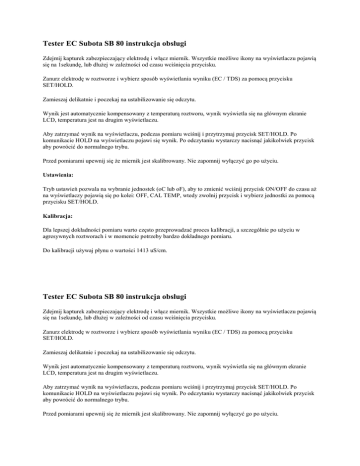 Tester EC Subota SB 80 instrukcja obsługi Zdejmij kapturek zabezpieczający elektrodę i włącz miernik. Wszystkie możliwe ikony na wyświetlaczu pojawią się na 1sekundę, lub dłużej w zależności od czasu wciśnięcia przycisku. Zanurz elektrodę w roztworze i wybierz sposób wyświetlania wyniku (EC / TDS) za pomocą przycisku SET/HOLD. Zamieszaj delikatnie i poczekaj na ustabilizowanie się odczytu. Wynik jest automatycznie kompensowany z temperaturą roztworu, wynik wyświetla się na głównym ekranie LCD, temperatura jest na drugim wyświetlaczu. Aby zatrzymać wynik na wyświetlaczu, podczas pomiaru wciśnij i przytrzymaj przycisk SET/HOLD. Po komunikacie HOLD na wyświetlaczu pojawi się wynik. Po odczytaniu wystarczy nacisnąć jakikolwiek przycisk aby powrócić do normalnego trybu. Przed pomiarami upewnij się że miernik jest skalibrowany. Nie zapomnij wyłączyć go po użyciu. Ustawienia: Tryb ustawień pozwala na wybranie jednostek (oC lub oF), aby to zmienić wciśnij przycisk ON/OFF do czasu aż na wyświetlaczy pojawią się po kolei: OFF, CAL TEMP, wtedy zwolnij przycisk i wybierz jednostki za pomocą przycisku SET/HOLD. Kalibracja: Dla lepszej dokładności pomiaru warto często przeprowadzać proces kalibracji, a szczególnie po użyciu w agresywnych roztworach i w momencie potrzeby bardzo dokładnego pomiaru. Do kalibracji używaj płynu o wartości 1413 uS/cm. Tester EC Subota SB 80 instrukcja obsługi Zdejmij kapturek zabezpieczający elektrodę i włącz miernik. Wszystkie możliwe ikony na wyświetlaczu pojawią się na 1sekundę, lub dłużej w zależności od czasu wciśnięcia przycisku. Zanurz elektrodę w roztworze i wybierz sposób wyświetlania wyniku (EC / TDS) za pomocą przycisku SET/HOLD. Zamieszaj delikatnie i poczekaj na ustabilizowanie się odczytu. Wynik jest automatycznie kompensowany z temperaturą roztworu, wynik wyświetla się na głównym ekranie LCD, temperatura jest na drugim wyświetlaczu. Aby zatrzymać wynik na wyświetlaczu, podczas pomiaru wciśnij i przytrzymaj przycisk SET/HOLD. Po komunikacie HOLD na wyświetlaczu pojawi się wynik. Po odczytaniu wystarczy nacisnąć jakikolwiek przycisk aby powrócić do normalnego trybu. Przed pomiarami upewnij się że miernik jest skalibrowany. Nie zapomnij wyłączyć go po użyciu. Ustawienia: Tryb ustawień pozwala na wybranie jednostek (oC lub oF), aby to zmienić wciśnij przycisk ON/OFF do czasu aż na wyświetlaczy pojawią się po kolei: OFF, CAL TEMP, wtedy zwolnij przycisk i wybierz jednostki za pomocą przycisku SET/HOLD. Kalibracja: Dla lepszej dokładności pomiaru warto często przeprowadzać proces kalibracji, a szczególnie po użyciu w agresywnych roztworach i w momencie potrzeby bardzo dokładnego pomiaru. Do kalibracji używaj płynu o wartości 1413 uS/cm. Tester EC Subota SB 80 instrukcja obsługi Zdejmij kapturek zabezpieczający elektrodę i włącz miernik. Wszystkie możliwe ikony na wyświetlaczu pojawią się na 1sekundę, lub dłużej w zależności od czasu wciśnięcia przycisku. Zanurz elektrodę w roztworze i wybierz sposób wyświetlania wyniku (EC / TDS) za pomocą przycisku SET/HOLD. Zamieszaj delikatnie i poczekaj na ustabilizowanie się odczytu. Wynik jest automatycznie kompensowany z temperaturą roztworu, wynik wyświetla się na głównym ekranie LCD, temperatura jest na drugim wyświetlaczu. Aby zatrzymać wynik na wyświetlaczu, podczas pomiaru wciśnij i przytrzymaj przycisk SET/HOLD. Po komunikacie HOLD na wyświetlaczu pojawi się wynik. Po odczytaniu wystarczy nacisnąć jakikolwiek przycisk aby powrócić do normalnego trybu. Przed pomiarami upewnij się że miernik jest skalibrowany. Nie zapomnij wyłączyć go po użyciu. Ustawienia: Tryb ustawień pozwala na wybranie jednostek (oC lub oF), aby to zmienić wciśnij przycisk ON/OFF do czasu aż na wyświetlaczy pojawią się po kolei: OFF, CAL TEMP, wtedy zwolnij przycisk i wybierz jednostki za pomocą przycisku SET/HOLD. Kalibracja: Dla lepszej dokładności pomiaru warto często przeprowadzać proces kalibracji, a szczególnie po użyciu w agresywnych roztworach i w momencie potrzeby bardzo dokładnego pomiaru. Do kalibracji używaj płynu o wartości 1413 uS/cm.