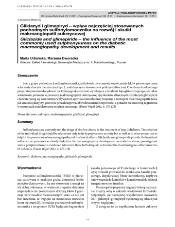 175 FA R M A C J A W S P Ó Ł C Z E S N A 2011; 4: 175-178 ARTYKUŁ POGLĄDOWY/REWIEV PAPER Otrzymano/Submitted: 29.11.2011 • Poprawiono/Corrected: 08.12.2011 • Zaakceptowano/Accepted: 10.12.2011 © Akademia Medycyny Gliklazyd i glimepiryd – wpływ najczęściej stosowanych pochodnych sulfonylomocznika na rozwój i skutki makroangiopatii cukrzycowej Gliclazide and glimepiride – the influence of the most commonly used sulphonylureas on the diabetic macroangiopathy development and results Marta Urbańska, Marzena Dworacka Katedra i Zakład Farmakologii, Uniwersytet Medyczny im. K. Marcinkowskiego, Poznań Streszczenie Leki z grupy pochodnych sulfonylomocznika, jakkolwiek nie stanowią współcześnie leków pierwszego rzutu w leczeniu chorych na cukrzycę typu 2, nadal są często stosowane w praktyce klinicznej. O wyborze konkretnego preparatu powinno decydować nie tylko jego skuteczność wynikająca z działania hipoglikemizującego, ale także właściwości pomocne w prewencji makroangiopatii cukrzycowej i jej skutków klinicznych. Gliklazyd i glimepiryd charakteryzują się korzystnym wpływem na zjawiska nierozłącznie związane z rozwojem makroangiopatii, takie jak stres oksydacyjny, gotowość prozakrzepowa, obwodowa insulinooporność, a ponadto nie stanowią zagrożenia w warunkach niedokrwienia mięśnia sercowego. (Farm Współ 2011; 4: 175-178) Słowa kluczowe: cukrzyca, makroangiopatia, gliklazyd, glimepiryd Summary Sulfonylureas are currently not the drugs of the first choice in the treatment of type 2 diabetes. The selection of the individual drug should be related not only to its hypoglycaemic activity but as well as to other properties so helpful the prevention of macroangiopathy and its clinical effects. Gliclazide and glimepiride provide the beneficial influence on processes so closely linked to the macroangiopathy development as oxidative stress, procoagulant status, peripheral insulin resistance. Moreover, these both drugs do not induce the disadvantageous effects in terms of ischemia. (Farm Współ 2011; 4: 175-178) Keywords: diabetes, macroangiopathy, gliclazide, glimepiride Wprowadzenie kanału potasowego ATP-zależnego w komórkach β wysp trzustki prowadzi do zamknięcia kanału potasowego, depolaryzacji błony komórkowej, napływu jonów wapnia do komórki i w konsekwencji do sekrecji zmagazynowanej insuliny. Poszczególne preparaty tej grupy różnią się znacznie między sobą w zakresie właściwości farmakokinetycznych, ale najczęściej współcześnie stosowane leki - gliklazyd i glimepiryd wyróżniają się także i pod innymi względami. Z uwagi na to, że współczesne leczenie cukrzycy Pochodne sulfonylomocznika (PSM) to pierwsza stosowana w praktyce grupa doustnych leków przeciwcukrzycowych. Są one stosowane z uwagi na ich dobrą tolerancję, w większości łagodne działania niepożądane (te poważniejsze dotyczą leków I generacji już w zasadzie niestosowanych) oraz, co nie jest bez znaczenia, ze względu na stosunkowo niewielki koszt tej terapii [1]. Interakcja pochodnych sulfonylomocznika z receptorem SUR1 będącym fragmentem 175 FA R M A C J A W S P Ó Ł C Z E S N A 2011; 4: 175-178 powinno prowadzić nie tylko do wyrównania zaburzeń w zakresie gospodarki węglowodanowej, ale także do zmniejszenia ryzyka rozwoju przewlekłych powikłań cukrzycy, działania leków przeciwcukrzycowych modyfikujące procesy związane z rozwojem mikroi makroangiopatii cukrzycowej wzbudzają szczególne zainteresowanie. żenie peroksydazy, a podwyższa stężenie dysmutazy nadtlenkowej w erytrocytach, zwiększając całkowitą zdolność antyoksydacyjną osocza. Wpływa także korzystnie na właściwości reologiczne krwi: hamuje adhezję monocytów do komórek śródbłonka, powoduje zmniejszenie reaktywności płytek i stymulację syntezy prostacyklin, a poprzez regulowanie aktywności aktywatora plazminogenu - nasila fibrynolizę. Uważa się, te szczególne cechy gliklazyd zawdzięcza obecności unikatowego pierścienia aminoazabicyklooktanowego w strukturze swojej cząsteczki upodabniającego go do witaminy E [5-7]. Wspomnieć należy również o przeciwzapalnym działaniu glimepirydu, stanowiącym istotną składową jego przeciwmiażdżycowego działania [8]. Glimepiryd, w przeciwieństwie do gliklazydu, wywiera także bezpośredni efekt na metabolizm komórek śródbłonka wzmagając wytwarzanie tlenku azotu [9]. Interesujące wydają się również wyniki bezpośredniej oceny antyaterogennego efektu gliklazydu wywieranego niezależnie od jego działania hipoglikemizującego. Wykazano bowiem, że stosowanie tego leku wiedzie do zmniejszenia przyrostu grubości błony wewnętrznej tętnicy szyjnej – wykładnika zaawansowania miażdżycy [10]. Gliklazyd i glimepiryd a patomechanizm makroangiopatii cukrzycowej Makroangiopatia cukrzycowa – proces pod względem histopatologicznym identyczny z miażdżycą stanowi główną przyczynę zwiększonej chorobowości i śmiertelności wśród chorych na cukrzycę [2]. Niebagatelną rolę w rozwoju tego powikłania naczyniowego odgrywa nieenzymatyczna glikacja białek oraz stres oksydacyjny. Wykazano, że produkty zaawansowanej glikacji, wśród nich karboksymetylolizyna, na skutek wiązania się ze swoistym receptorem usytuowanym m.in. na powierzchni makrofagów, komórek śródbłonka i komórek mięśni gładkich naczyń wyzwalają stres oksydacyjny aktywujący szlak p21ras i fosforylację kinazy białkowej p42/p43 MAPK (Mitogen-Induced Protein Kinase). Prowadzi to ostatecznie do odblokowania czynnika transkrypcyjnego NFκ-B i ekspresji kontrolowanych przezeń genów dla białek o działaniu prozapalnym i prokoagulacyjnym. W konsekwencji obserwuje się zwiększone wytwarzanie cytokin pozapalnych (IL-1α, Il-6, TNF-α), endoteliny-1, osoczowych czynników krzepnięcia i molekuł adhezji naczyń. Uogólniając stwierdzić można, że stres oksydacyjny w przebiegu cukrzycy aktywuje główne 