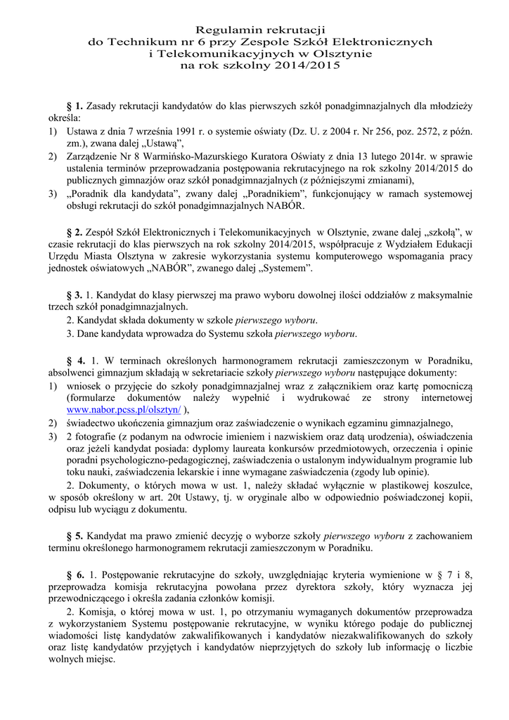 Regulamin rekrutacji do Technikum nr 6 przy Zespole Szkół Elektronicznych i Telekomunikacyjnych w Olsztynie na rok szkolny 2014/2015 § 1. Zasady rekrutacji kandydatów do klas pierwszych szkół ponadgimnazjalnych dla młodzieży określa: 1) Ustawa z dnia 7 września 1991 r. o systemie oświaty (Dz. U. z 2004 r. Nr 256, poz. 2572, z późn. zm.), zwana dalej „Ustawą”, 2) Zarządzenie Nr 8 Warmińsko-Mazurskiego Kuratora Oświaty z dnia 13 lutego 2014r. w sprawie ustalenia terminów przeprowadzania postępowania rekrutacyjnego na rok szkolny 2014/2015 do publicznych gimnazjów oraz szkół ponadgimnazjalnych (z późniejszymi zmianami), 3) „Poradnik dla kandydata”, zwany dalej „Poradnikiem”, funkcjonujący w ramach systemowej obsługi rekrutacji do szkół ponadgimnazjalnych NABÓR. § 2. Zespół Szkół Elektronicznych i Telekomunikacyjnych w Olsztynie, zwane dalej „szkołą”, w czasie rekrutacji do klas pierwszych na rok szkolny 2014/2015, współpracuje z Wydziałem Edukacji Urzędu Miasta Olsztyna w zakresie wykorzystania systemu komputerowego wspomagania pracy jednostek oświatowych „NABÓR”, zwanego dalej „Systemem”. § 3. 1. Kandydat do klasy pierwszej ma prawo wyboru dowolnej ilości oddziałów z maksymalnie trzech szkół ponadgimnazjalnych. 2. Kandydat składa dokumenty w szkole pierwszego wyboru. 3. Dane kandydata wprowadza do Systemu szkoła pierwszego wyboru. § 4. 1. W terminach określonych harmonogramem rekrutacji zamieszczonym w Poradniku, absolwenci gimnazjum składają w sekretariacie szkoły pierwszego wyboru następujące dokumenty: 1) wniosek o przyjęcie do szkoły ponadgimnazjalnej wraz z załącznikiem oraz kartę pomocniczą (formularze dokumentów należy wypełnić i wydrukować ze strony internetowej www.nabor.pcss.pl/olsztyn/ ), 2) świadectwo ukończenia gimnazjum oraz zaświadczenie o wynikach egzaminu gimnazjalnego, 3) 2 fotografie (z podanym na odwrocie imieniem i nazwiskiem oraz datą urodzenia), oświadczenia oraz jeżeli kandydat posiada: dyplomy laureata konkursów przedmiotowych, orzeczenia i opinie poradni psychologiczno-pedagogicznej, zaświadczenia o ustalonym indywidualnym programie lub toku nauki, zaświadczenia lekarskie i inne wymagane zaświadczenia (zgody lub opinie). 2. Dokumenty, o których mowa w ust. 1, należy składać wyłącznie w plastikowej koszulce, w sposób określony w art. 20t Ustawy, tj. w oryginale albo w odpowiednio poświadczonej kopii, odpisu lub wyciągu z dokumentu. § 5. Kandydat ma prawo zmienić decyzję o wyborze szkoły pierwszego wyboru z zachowaniem terminu określonego harmonogramem rekrutacji zamieszczonym w Poradniku. § 6. 1. Postępowanie rekrutacyjne do szkoły, uwzględniając kryteria wymienione w § 7 i 8, przeprowadza komisja rekrutacyjna powołana przez dyrektora szkoły, który wyznacza jej przewodniczącego i określa zadania członków komisji. 2. Komisja, o której mowa w ust. 1, po otrzymaniu wymaganych dokumentów przeprowadza z wykorzystaniem Systemu postępowanie rekrutacyjne, w wyniku którego podaje do publicznej wiadomości listę kandydatów zakwalifikowanych i kandydatów niezakwalifikowanych do szkoły oraz listę kandydatów przyjętych i kandydatów nieprzyjętych do szkoły lub informację o liczbie wolnych miejsc. § 7. 1. Z zastrzeżeniem ust. 2 – 4, o przyjęciu kandydata do szkoły decyduje suma punktów uzyskanych w postępowaniu rekrutacyjnym według następujących zasad: 1) liczba punktów uzyskanych z przeliczenia wyników egzaminu gimnazjalnego: a) liczba % z języka polskiego x 0,2 ……………..…..... do 20 punktów b) liczba % z historii i wiedzy o społeczeństwa x 0,2 ..... do 20 punktów c) liczba % z matematyki x 0,2 ………………………... do 20 punktów … max 100 pkt., d) liczba % z przedmiotów przyrodniczych: biologii, geografii, fizyki i chemii x 0,2 …….…..….. do 20 punktów e) liczba % z języka obcego nowożytnego poziom podstawowy x 0,2 ………………………...... do 20 punktów 2) liczba punktów uzyskanych z przeliczenia ocen z 4 przedmiotów na świadectwie ukończenia gimnazjum: a) liczbowo określona ocena z j. polskiego x 3 ………………………….……......... max 18 pkt., b) liczbowo określona ocena z obowiązkowego j. obcego x 3 …………………...… max 18 pkt., c) liczbowo określona z ocena matematyki x 3 ……………………………….….… max 18 pkt., d) liczbowo określona ocena z przedmiotu wskazanego przez komisję w kolumnie 4 poniższej tabeli x 3 .................................................................................................................. max 18 pkt., Symbol oddziału 1A-G W roku szkolnym 2014/2015 utworzone zostaną następujące oddziały Planowane przedmioty nauczane w zakresie Język obcy *: Punktowany przedmiot rozszerzonym wskazany przez szkolną 1) pierwszy komisję rekrutacyjną lub planowany zawód 2) drugi Technik elektronik, technik elektryk, technik j. angielski j. obcy mechatronik, technik telekomunikacji, technik j. niemiecki matematyka teleinformatyk, technik urządzeń i systemów fizyka energetyki odnawialnej * - jeden z języków obcych powinien być kontynuacją języka obcego nauczanego w gimnazjum 3) świadectwo z wyróżnieniem ………………….………………………..………..................... 8 pkt., 4) uzyskanie do dwóch tytułów finalisty wojewódzkiego konkursu przedmiotowego organizowanego przez kuratora oświaty (jeden przedmiot 6 pkt.) ………………………....……..…….. max 12 pkt., 5) osiągnięcia kandydata wymienione na świadectwie ukończenia gimnazjum w kategoriach: a) konkursy wiedzy (max 2 pkt.) - miejsca 1-5 na szczeblu ogólnopolskim i miejsca 1-3 na szczeblu wojewódzkim ……….....……..…..…. 2 pkt. - miejsca 1-3 na szczeblu powiatowym …………….…..…..……. 1 pkt b) konkursy sportowe (max 2 pkt.) - miejsca 1-5 na szczeblu ogólnopolskim i miejsca