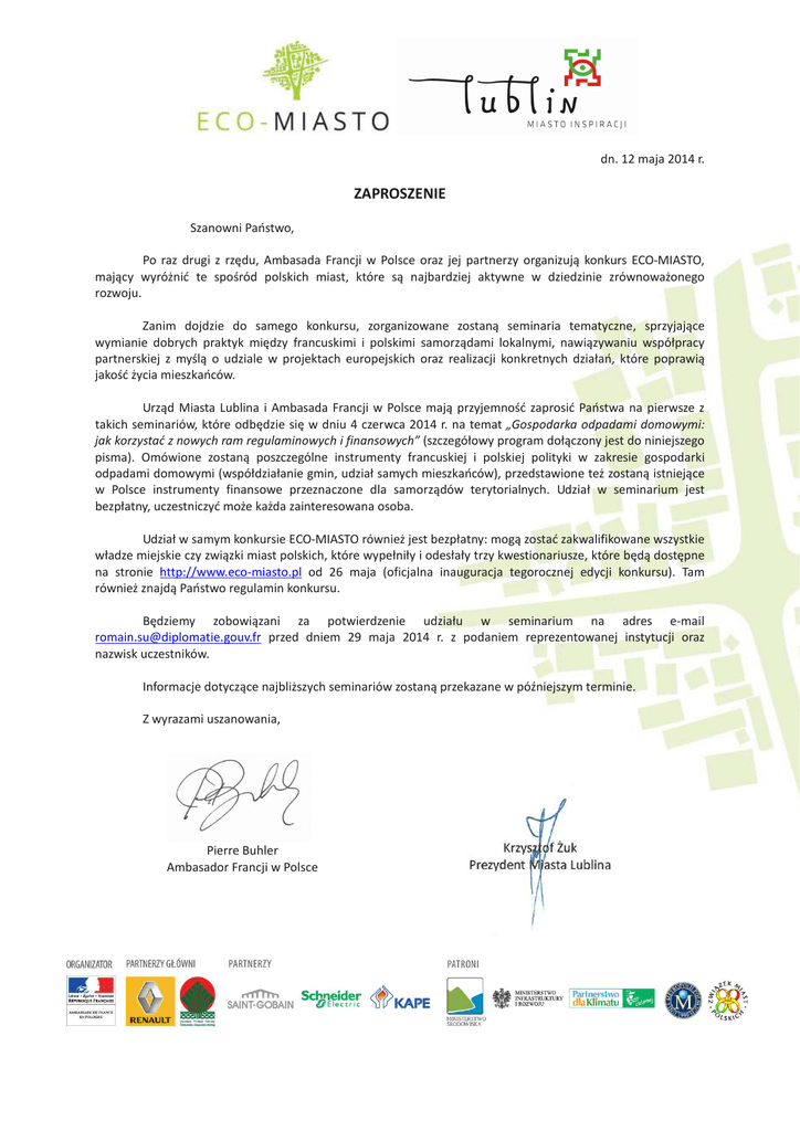 dn. 12 maja 2014 r. ZAPROSZENIE Szanowni Państwo, Po raz drugi z rzędu, Ambasada Francji w Polsce oraz jej partnerzy organizują konkurs ECO-MIASTO, mający wyróżnić te spośród polskich miast, które są najbardziej aktywne w dziedzinie zrównoważonego rozwoju. Zanim dojdzie do samego konkursu, zorganizowane zostaną seminaria tematyczne, sprzyjające wymianie dobrych praktyk między francuskimi i polskimi samorządami lokalnymi, nawiązywaniu współpracy partnerskiej z myślą o udziale w projektach europejskich oraz realizacji konkretnych działań, które poprawią jakość życia mieszkańców. Urząd Miasta Lublina i Ambasada Francji w Polsce mają przyjemność zaprosić Państwa na pierwsze z takich seminariów, które odbędzie się w dniu 4 czerwca 2014 r. na temat „Gospodarka odpadami domowymi: jak korzystać z nowych ram regulaminowych i finansowych” (szczegółowy program dołączony jest do niniejszego pisma). Omówione zostaną poszczególne instrumenty francuskiej i polskiej polityki w zakresie gospodarki odpadami domowymi (współdziałanie gmin, udział samych mieszkańców), przedstawione też zostaną istniejące w Polsce instrumenty finansowe przeznaczone dla samorządów terytorialnych. Udział w seminarium jest bezpłatny, uczestniczyć może każda zainteresowana osoba. Udział w samym konkursie ECO-MIASTO również jest bezpłatny: mogą zostać zakwalifikowane wszystkie władze miejskie czy związki miast polskich, które wypełniły i odesłały trzy kwestionariusze, które będą dostępne na stronie http://www.eco-miasto.pl od 26 maja (oficjalna inauguracja tegorocznej edycji konkursu). Tam również znajdą Państwo regulamin konkursu. Będziemy zobowiązani za potwierdzenie udziału w seminarium na adres e-mail [email protected] przed dniem 29 maja 2014 r. z podaniem reprezentowanej instytucji oraz nazwisk uczestników. Informacje dotyczące najbliższych seminariów zostaną przekazane w późniejszym terminie. Z wyrazami uszanowania, Pierre Buhler Ambasador Francji w Polsce Krzysztof Żuk Prezydent Miasta Lublina