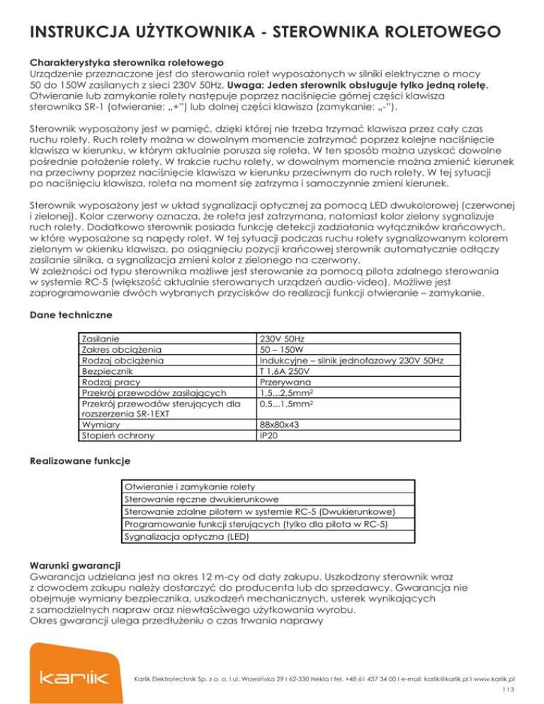 INSTRUKCJA UŻYTKOWNIKA - STEROWNIKA ROLETOWEGO Charakterystyka sterownika roletowego Urządzenie przeznaczone jest do sterowania rolet wyposażonych w silniki elektryczne o mocy 50 do 150W zasilanych z sieci 230V 50Hz. Uwaga: Jeden sterownik obsługuje tylko jedną roletę. Otwieranie lub zamykanie rolety następuje poprzez naciśnięcie górnej części klawisza sterownika SR-1 (otwieranie: „+”) lub dolnej części klawisza (zamykanie: „-”). Sterownik wyposażony jest w pamięć, dzięki której nie trzeba trzymać klawisza przez cały czas ruchu rolety. Ruch rolety można w dowolnym momencie zatrzymać poprzez kolejne naciśnięcie klawisza w kierunku, w którym aktualnie porusza się roleta. W ten sposób można uzyskać dowolne pośrednie położenie rolety. W trakcie ruchu rolety, w dowolnym momencie można zmienić kierunek na przeciwny poprzez naciśnięcie klawisza w kierunku przeciwnym do ruch rolety. W tej sytuacji po naciśnięciu klawisza, roleta na moment się zatrzyma i samoczynnie zmieni kierunek. Sterownik wyposażony jest w układ sygnalizacji optycznej za pomocą LED dwukolorowej (czerwonej i zielonej). Kolor czerwony oznacza, że roleta jest zatrzymana, natomiast kolor zielony sygnalizuje ruch rolety. Dodatkowo sterownik posiada funkcję detekcji zadziałania wyłączników krańcowych, w które wyposażone są napędy rolet. W tej sytuacji podczas ruchu rolety sygnalizowanym kolorem zielonym w okienku klawisza, po osiągnięciu pozycji krańcowej sterownik automatycznie odłączy zasilanie silnika, a sygnalizacja zmieni kolor z zielonego na czerwony. W zależności od typu sterownika możliwe jest sterowanie za pomocą pilota zdalnego sterowania w systemie RC-5 (większość aktualnie sterowanych urządzeń audio-video). Możliwe jest zaprogramowanie dwóch wybranych przycisków do realizacji funkcji otwieranie – zamykanie. Dane techniczne Zasilanie Zakres obciążenia Rodzaj obciążenia Bezpiecznik Rodzaj pracy Przekrój przewodów zasilających Przekrój przewodów sterujących dla rozszerzenia SR-1EXT Wymiary Stopień ochrony 230V 50Hz 50 – 150W Indukcyjne – silnik jednofazowy 230V 50Hz T 1,6A 250V Przerywana 1,5...2,5mm2 0,5...1,5mm2 88x80x43 IP20 Realizowane funkcje Otwieranie i zamykanie rolety Sterowanie ręczne dwukierunkowe Sterowanie zdalne pilotem w systemie RC-5 (Dwukierunkowe) Programowanie funkcji sterujących (tylko dla pilota w RC-5) Sygnalizacja optyczna (LED) Warunki gwarancji Gwarancja udzielana jest na okres 12 m-cy od daty zakupu. Uszkodzony sterownik wraz z dowodem zakupu należy dostarczyć do producenta lub do sprzedawcy. Gwarancja nie obejmuje wymiany bezpiecznika, uszkodzeń mechanicznych, usterek wynikających z samodzielnych napraw oraz niewłaściwego użytkowania wyrobu. Okres gwarancji ulega przedłużeniu o czas trwania naprawy Karlik Elektrotechnik Sp. z o. o. I ul. Wrzesińska 29 I 62-330 Nekla I tel. +48 61 437 34 00 I e-mail: [email protected] I www.karlik.pl 1I3 INSTRUKCJA UŻYTKOWNIKA - STEROWNIKA ROLETOWEGO INSTRUKCJA MONTAŻU Sposób montażu 1. Wyłączyć bezpieczniki sieciowe instalacji domowej. 2. Za pomocą wkrętaka podważyć i zdjąć klawisz sterownika, a następnie ramkę. 3. Odizolować na długości 7mm przewody zasilające instalacji elektrycznej i posługując się zamieszczonym schematem podłączyć pod listwy zaciskowe (przewód fazowy pod zacisk „L”, przewód wyjściowy do sterowania w kierunku „Otwieranie” pod zacisk „↑”,przewód wyjściowy do sterowania w kierunku „Zamykanie” pod zacisk „↓”). 4. Za pomocą wkrętów mocujących lub łapek rozporowych zamontować sterownik w puszce instalacyjnej (listwą zaciskową do dołu – co zapewni prawidłowy sposób działania). 5. Zamontować ramkę, a następnie klawisz sterownika (okienkiem do góry). Klawisz wciskamy kciukami po bokach, w miejscu zatrzasków, do momentu charakterystycznego kliknięcia. 6. Załączyć bezpieczniki sieciowe instalacji domowej (jeżeli do sterownika podłączone jest obciążenie to obecność napięcia sygnalizowana jest optycznie za pomocą LED). Wymiana bezpiecznika 1. Wyłączyć bezpieczniki sieciowe instalacji domowej. 2. Za pomocą wkrętaka podważyć i zdjąć klawisz sterownika. 3. Za pomocą wkrętaka podważyć i wyjąć z gniazda oprawkę z bezpiecznikiem. 4. Wymienić przepaloną wkładkę bezpiecznikową na taką samą jak przewiduje tabela danych technicznych. 5. Włożyć do gniazda oprawkę z wymienionym bezpiecznikiem. 6. Zamontować klawisz sterownika (okienkiem do góry). 7. Załączyć bezpieczniki sieciowe instalacji domowej (jeżeli do sterownika podłączone jest obciążenie to obecność napięcia sygnalizowana jest optycznie za pomocą LED). Rodzaj usterki Sterownik nie działa Dodatkowe Możliwa przyczyna informacje Sygnalizacja optyczna Brak napięcia zasilającego LED – nie świeci Przepalony bezpiecznik w sterowniku Brak obciążenia (np. uszkodzony układ napędu rolety lub przegrzany silnik) Sterownik nie Sygnalizacja optyczna Uszkodzenie sterownika działa LED - świeci Odwrotne Odwrotnie zamontowany działanie przy sterownik w puszce sterowaniu instalacyjnej ręcznym Wykonać czynności Sprawdzić bezpieczniki instalacji domowej Wymienić bezpiecznik zgodnie z instrukcją Sprawdzić układ napędowy lub odczekać aż silnik ostygnie Przekazać sterownik do Serwisu. Odwrócić o 180° tak aby listwy zaciskowe znajdowały się od dołu sterownika. Karlik Elektrotechnik Sp. z o. o. I ul. Wrzesińska 29 I 62-330 Nekla I tel. +48 61 437 34 00 I e-mail: [email protected] I www.karlik.pl 2I4 INSTRUKCJA UŻYTKOWNIKA - STEROWNIKA ROLETOWEGO INSTRUKCJA OBSŁUGI ORAZ PROGRAMOWANIE SR Sterowanie ręczne Całkowite otwieranie lub zamykanie rolety · Nacisnąć na chwilę górną część klawisza „+” – roleta zacznie się otwierać, co sygnalizowane będzie świeceniem kontrolki LED w kolorze zielonym. Po osiągnięciu pełnego otwarcia roleta się zatrzyma, co sy