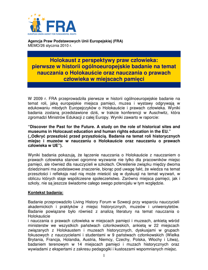 Agencja Praw Podstawowych Unii Europejskiej (FRA) MEMO/26 stycznia 2010 r. Holokaust z perspektywy praw człowieka: pierwsze w historii ogólnoeuropejskie badanie na temat nauczania o Holokauście oraz nauczania o prawach człowieka w miejscach pamięci W 2009 r. FRA przeprowadziła pierwsze w historii ogólnoeuropejskie badanie na temat roli, jaką europejskie miejsca pamięci, muzea i wystawy odgrywają w edukowaniu młodych Europejczyków o Holokauście i prawach człowieka. Wyniki badania zostaną przedstawione dziś, w trakcie konferencji w Auschwitz, która zgromadzi Ministrów Edukacji z całej Europy. Wyniki zawarto w raporcie: “Discover the Past for the Future. A study on the role of historical sites and museums in Holocaust education and human rights education in the EU.” („Odkryć przeszłość przed przyszłością. Badania na temat roli historycznych miejsc i muzeów w nauczaniu o Holokauście oraz nauczaniu o prawach człowieka w UE”). Wyniki badania pokazują, że łączenie nauczania o Holokauście z nauczaniem o prawach człowieka stanowi ogromne wyzwanie nie tylko dla pracowników miejsc pamięci, ale również dla nauczycieli w szkołach. Określenie związku między dwoma dziedzinami ma podstawowe znaczenie, biorąc pod uwagę fakt, że wiedza na temat przeszłości i refleksja nad nią może mieścić się w dyskusji na temat wyzwań, w obliczu których staje współczesne społeczeństwo. Zarówno miejsca pamięci, jak i szkoły, nie są jeszcze świadome całego swego potencjału w tym względzie. Kontekst badania: Badanie przeprowadziło Living History Forum w Szwecji przy wsparciu nauczycieli akademickich i praktyków z miejsc historycznych, muzeów i uniwersytetów. Badanie powiązane było również z analizą literatury na temat nauczania o Holokauście i nauczania o prawach człowieka w miejscach pamięci i muzeach, ankietą wśród ministerstw we wszystkich państwach członkowskich, ankietą w 22 miejscach związanych z Holokaustem i muzeach historycznych, dyskusjami w grupach fokusowych z nauczycielami i studentami w 9 państwach członkowskich (Wielka Brytania, Francja, Holandia, Austria, Niemcy, Czechy, Polska, Włochy i Litwa), badaniem terenowym w 14 miejscach pamięci i muzach historycznych oraz wywiadami z ekspertami z zakresu pedagogiki i kustoszami wspomnianych miejsc. 1 KLUCZOWE WNIOSKI Miejsca pamięci i muzea historyczne nadal istotne w XXI wieku Miejsca pamięci jako miejsca przekazujące wartości moralne i fakty historyczne. Konfrontacja z Holokaustem prowadzi zawsze do dyskusji na temat współczesnych problemów. Wyniki ankiety pokazują jednak, że tylko jedno spośród miejsc objętych badaniem uznaje zwiększanie świadomości na temat praw człowieka za swój najważniejszy cel. Wszystkie inne instytucje uznają za swoje główne zadanie przekazywanie wiedzy historycznej. Związek między nauczeniem o Holokauście a nauczeniem o prawach człowieka Odpowiedzi nauczycieli i studentów wskazywały na nikły związek między nauczaniem o Holokauście a nauczaniem o prawach człowieka na poziomie szkoły. Studenci w grupach fokusowych orzekli, że „prawa człowieka” nie są zagadnieniem częstokrotnie poruszanym w trakcie edukacji szkolnej. „Nigdy nie mieliśmy lekcji na temat praw człowieka. Prawa człowieka nie są tematem na lekcję; chyba że w teorii, ale nie w praktyce”. (studencka grupa fokusowa, Berlin) Kłóciło się to z odpowiedziami ministerstw edukacji w państwach członkowskich UE, które stwierdziły, że nauczanie o prawach człowieka to priorytetowa dziedzina. Ogólnie nauczanie o prawach człowieka nie wydaje się być dobrze ugruntowanym pojęciem, ani na poziomie miejsc pamięci, ani na poziomie szkół. „Lekcje na temat łamania praw człowieka muszą być włączone do programu nauczania, by zapobiec jakimkolwiek tego typu wydarzeniom w przyszłości, umożliwić studentom naukę o błędach popełnionych w przeszłości" (studencka grupa fokusowa, Kopenhaga) Miejsca pamięci i muzea historyczne oferują unikalne doświadczenie edukacyjne „Gdy coś poczujesz, to już nie wyparuje” Wielu z ankietowanych studentów wyznało, że konfrontacja z Holokaustem miała wpływ na ich życie osobiste, szczególnie w przypadku wizyt w miejscach pamięci. Studenci postrzegają miejsca pamięci jako miejsca, które mogą wywierać na nich niezatarte wrażenie. 2 „Miejsce pamięci naprawdę pozwala poczuć atmosferę, która jest zasadnicza dla procesu uczenia. Gdy coś poczujesz, to już nie wyparuje (grupa fokusowa nauczycieli, Amsterdam). Miejsca upamiętniające ofiary nazizmu są świadectwem zbrodni narodowego socjalizmu oraz konsekwencji dyskryminacji rasowej i antysemickiej, odczłowieczenia, a w końcu pozbawienia istot ludzkich prawa do życia. Studenci podkreślali spotkania z osobami, które przetrwały te okrucieństwa, jako wydarzenia wywierające na nich szczególne wrażenie. Autentyczność miejsc pamięci Wyniki ankiety pokazują, że autentyczność miejsc pamięci ma dwa podstawowe skutki dla studentów. Z jednej strony, tworzy ona atmosferę emocjonalnego przywiązania, która pobudza do refleksji i zachęca odwiedzających do szukania kolejnych informacji. Z drugiej strony jednak, emocjonalne doświadczenie i oczekiwania dotyczące specyficznych zasad zachowania w miejscach pamięci niekiedy sprawiały, że studenci czuli się niepewnie, a także blokowały komunikację i refleksję. „Autentyczne miejsca są kluczowe dla nauczania o Holokauście, tym bardziej gdy prezentują puste przestrzenie, gdy na płaszczyźnie fizycznej przywołują studentom to, co się wydarzyło, np. zimna pogoda i śnieg w czasie zimy, gdy dowodzą, czym jest zaprzeczenie życia” (grupa fokusowa nauczycieli, Mediolan) Czynniki sukcesu Miejsca objęte ankietą podały następujące czynniki, które przyczyniają się do sukcesu działalności edukacyjnej: • motywacja pracowników miejsc pamięci i muzeów