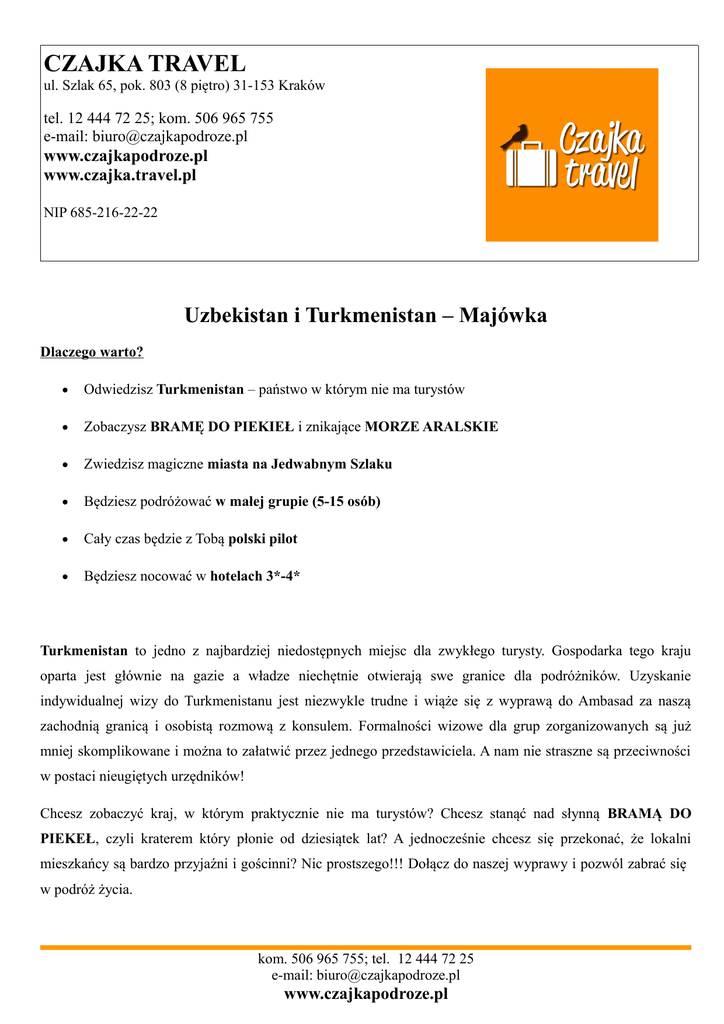 CZAJKA TRAVEL ul. Szlak 65, pok. 803 (8 piętro) 31-153 Kraków tel. 12 444 72 25; kom. 506 965 755 e-mail: [email protected] www.czajkapodroze.pl www.czajka.travel.pl NIP 685-216-22-22 Uzbekistan i Turkmenistan – Majówka Dlaczego warto? Odwiedzisz Turkmenistan – państwo w którym nie ma turystów Zobaczysz BRAMĘ DO PIEKIEŁ i znikające MORZE ARALSKIE Zwiedzisz magiczne miasta na Jedwabnym Szlaku Będziesz podróżować w małej grupie (5-15 osób) Cały czas będzie z Tobą polski pilot Będziesz nocować w hotelach 3*-4* Turkmenistan to jedno z najbardziej niedostępnych miejsc dla zwykłego turysty. Gospodarka tego kraju oparta jest głównie na gazie a władze niechętnie otwierają swe granice dla podróżników. Uzyskanie indywidualnej wizy do Turkmenistanu jest niezwykle trudne i wiąże się z wyprawą do Ambasad za naszą zachodnią granicą i osobistą rozmową z konsulem. Formalności wizowe dla grup zorganizowanych są już mniej skomplikowane i można to załatwić przez jednego przedstawiciela. A nam nie straszne są przeciwności w postaci nieugiętych urzędników! Chcesz zobaczyć kraj, w którym praktycznie nie ma turystów? Chcesz stanąć nad słynną BRAMĄ DO PIEKEŁ, czyli kraterem który płonie od dziesiątek lat? A jednocześnie chcesz się przekonać, że lokalni mieszkańcy są bardzo przyjaźni i gościnni? Nic prostszego!!! Dołącz do naszej wyprawy i pozwól zabrać się w podróż życia. kom. 506 965 755; tel. 12 444 72 25 e-mail: [email protected] www.czajkapodroze.pl Oprócz niedostępnego Turkmenistanu zwiedzimy też sąsiedni Uzbekistan – gdzie wśród piasków pustyni zachowały się miasta, których sama nazwa porusza wyobraźnię podróżników od setek lat: Samarkanda, Chiwa i Buchara to perły architektury w samym środku Azji Środkowej. Leżąc na Jedwabnym Szlaku przez ponad 2 tysiące lat otwierały swe bramy dla karawan kupców. Ich mury, meczety, medresy i pałace były świadkami rozkwitu i upadku jednego z najpotężniejszych imperiów w dziejach świata - imperium Timura Chromego zwanego również Tamerlanem. Współczesność też odbiła piętno na Uzbekistanie - nad umierającym Morzem Aralskim- zobaczymy jak szybko człowiek może zniszczyć to, co natura budowała tysiące lat. Zapraszamy do dwóch krajów Jedwabnego Szlaku: Uzbekistanu i Turkmenistanu. Daj się porwać do innego świata, gdzie życie toczy się wolniej, gdzie czeka na Ciebie bogata historia zaklęta w każdym ziarenku piasku i gdzie przed Tobą było niewielu turystów. PROGRAM 1 dzień: Wylot z Warszawy (przesiadka w Moskwie, Stambule lub innym porcie lotniczym) do Taszkientu. 2 dzień: TASZKIENT - NUKUS Przylot do Taszkientu w godzinach wczesnoporannych. Transfer do hotelu na nocleg. Zwiedzanie Taszkientu – stolicy Uzbekistanu, która odbudowana po trzęsieniu ziemi w latach 60-tych ubiegłego stulecia, różni się od innych uzbeckich miast. Przespacerujemy się labiryntem wąskich uliczek starego miasta, zobaczymy meczety i medresy oszczędzone przez sowieckich architektów: medresa Barak Chana z XVI w., Meczet Piątkowy, Mauzoleum Kaffal Szaszi - poety i filozofa z XVI w. Zatrzymamy się na bazarze Charsu – gdzie oprócz zakupów będzie można zobaczyć handlowców w tradycyjnych strojach. Na koniec spojrzymy też na nowoczesną część miasta: Plac Niepodległości, pomnik Timura i otaczające go ogrody. Po obiedzie – krajowy lot do Nukus (1godz. 45 min). Nocleg w Nukus. 3 dzień: NUKUS – MOJNAK - NUKUS Po wczesnym śniadaniu przejazd do dawnej osady rybackiej – Mojnak, która kiedyś leżała nad Morzem Aralskim a obecnie znajduje się ponad 100 km od linii brzegowej. Zobaczymy tam „cmentarzysko statków” czyli opuszczone wraki niszczejące w piasku. Następnie udamy się do Muzeum Historii Morza Aralskiego. Po powrocie do Nukus zobaczymy Państwowe Muzeum Sztuki Republiki Karakałpackiej, gdzie zgromadzono największą kolekcję rosyjskiej sztuki awangardowej. Nocleg w Nukus. kom. 506 965 755; tel. 12 444 72 25 e-mail: [email protected] www.czajkapodroze.pl 4 dzień: NUKUS - CHIWA Po śniadaniu przejazd do Chiwy - miasta skansenu położonego nad rzeką Amu-Daria, która swe niegdysiejsze bogactwo zawdzięczała położeniu na Jedwabnym Szlaku. Po drodze zobaczymy starożytne fortece: Toprak Kala z I w., Ayaz Kala – kompleks 3 fortów datowanych na VI i VII w., które były kiedyś częścią fortyfikacji na skraju pustyni Kyzył Kum. Na koniec dotrzemy do twierdzy Djanbas Kala. Nocleg w Chiwie. 5 dzień: CHIWA Zwiedzanie Chiwy, zobaczymy m.in.: mury Iczan Kala, czyli starego miasta, fortecę Kunja Ark, Meczet Piątkowy, który słynie z ponad 200 drewnianych kolumn podtrzymujących strop; mauzoleum Pahlawona Mahmuda – patrona Chiwy, Pałac Letni oraz minaret Kalta Minor. Nocleg w Chiwie. 6 dzień: CHIWA – DASZOGUZ – WROTA DO PIEKIEŁ Przejazd na granicę między Uzbekistanem a Turkmenistanem. Po załatwieniu formalności wjazdowych na obydwu granicach jedziemy do miasta Daszoguz, skąd dalej do Kunia-Urgencz wpisanego w całości na listę światowego dziedzictwa UNESCO. Zwiedzanie miasta, m.in.: mauzoleum sułtana Tekesz, mauzoleum Turabek-Khanum, niesamowity minaret Kutlug-Timur o wysokości 60 metrów. Następnie udamy się w okolice Derwaza aby zobaczyć „Wrota do piekieł”. W latach 50-tych XX wieku podczas odwiertów w tym rejonie nastąpił wybuch gazu a w jego wyniku zapadł się spory kawałek ziemi, pozostawiając otwór o średnicy 70 metrów. Aby uniknąć katastrofy spowodowanej ulatniającym się gazem, naukowcy postanowili podpalić krater. Założono, że gaz spali się w ciągu kilku dni, a tymczasem płonie do dziś. Nocleg niedaleko Derwaza. 7 dzień: DERWAZA - ASZCHABAD Przejazd do stolicy Turkmenistanu – Aszchabad. Zwiedzanie miasta, które jako stosunkowo młode jest przykładem połączenia niedalekiej pustyni z działalnością człowieka. Stolica dość szybko się rozwija oferując swoim go