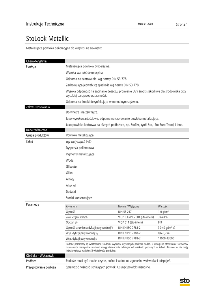 Instrukcja Techniczna Stan: 01.2003 Strona 1 StoLook Metallic Metalizująca powłoka dekoracyjna do wnętrz i na zewnątrz. Charakterystyka Funkcja Metalizująca powłoka dyspersyjna. Wysoka wartość dekoracyjna. Odporna na szorowanie wg normy DIN 53 778. Zachowująca jedwabistą gładkość wg normy DIN 53 778. Wysoka odporność na zacinanie deszczu, promienie UV i środki szkodliwe dla środowiska przy wysokiej paroprzepuszczalności. Odporna na środki dezynfekujące w normalnym stężeniu. Zakres stosowania Do wnętrz i na zewnątrz. Jako wysokowartościowa, odporna na szorowanie powłoka metalizująca. Jako powłoka końcowa na różnych podłożach, np. StoTex, tynki Sto, Sto-Euro Trend, i inne. Dane techniczne Grupa produktów Powłoka metalizująca Skład wg wytycznych VdL: Dyspersja polimerowa Pigmenty metalizujące Woda Glikoeter Glikol Alifaty Alkohol Dodatki Środki konserwujące Parametry Kryterium Norma / Wytyczne Wartość Gęstość DIN 53 217 1,0 g/cm3 Zaw. części stałych VIQP 033/VILS 001 (Sto intern) 39-41% Odczyn pH VIQP 011 (Sto intern) 8-9 Gęstość strumienia dyfuzji pary wodnej V DIN EN ISO 7783-2 30-40 g/(m2 d) Wsp. dyfuzji pary wodnej sd DIN EN ISO 7783-2 0,6-0,7 m Wsp. dyfuzji pary wodnej m DIN EN ISO 7783-2 11000-13000 Podane parametry są wartościami średnimi wyników uzyskanych podczas badań. Z uwagi na stosowanie surowców naturalnych rzeczywiste wartości mogą nieznacznie odbiegać od wielkości podanych w tabeli. Różnice te nie mają jednak wpływu na jakość i właściwości produktu. Obróbka - Wskazówki Podłoże Podłoże musi być trwałe, czyste, nośne i wolne od zgorzelin, wykwitów i odspojeń. Przygotowanie podłoża Sprawdzić nośność istniejących powłok. Usunąć powłoki nienośne. Instrukcja Techniczna Stan: 01.2003 Strona 2 StoLook Metallic Metalizująca powłoka dekoracyjna do wnętrz i na zewnątrz. Świeżo nałożone tynki pozostawić do wyschnięcia na co najmniej 14 dni. Tynki grupy P II i P III: Na tynki o normatywnej nasiąkliwości nanosić bezpośrednio; tynki nasiąkliwe gruntować StoPlex W. Tynki gotowe i gipsowe grupy P IV i PV: Tynki gipsowe z powłoką wypalaną wypolerować i odkurzyć. Nanieść StoPrim Grundex. Płyty gipsowe: Na płyty nasiąkliwe nanieść StoPlex W lub StoPrim Grundex. Płyty gipsowe – kartonowe: Narożniki i złącza płyt wyszpachlować i wyszlifować Miejsca te wzmocnić StoPrim Grundex. Nałożyć StoPlex W. W przypadku płyt z zawartością surowców rozpuszczalnych w wodzie i miejsc odbarwionych pokryć powierzchnię StoPrim Isol Q. Beton: Usunąć ewentualne resztki środków antyadhezyjnych takie jak substancje kredowe czy piaskowe. Gazobeton: Nałożyć StoPrim Plex. Wygładzić przy pomocy StoLevell In F. Płyty drewnopochodne, wiórowe i sklejka: Dokładnie wypolerować i odkurzyć. Nałożyć powłokę StoPrim Isol Q. Istniejące powłoki nośne: Powierzchnie matowe, słabo nasiąkliwe można obrabiać bezpośrednio. Błyszczące i lakierowane pokrycia zarysować. Powłoki nie nośne: Usunąć powierzchnie małonośne lakierowane, malowane farbą dyspersyjną lub pokryte żywicą syntetyczną. Na grubo porowate, piaskujące jak i nasiąkliwe powłoki nanieść StoPlex W. Pokryte farbą mineralną powierzchnie mechanicznie usunąć i odkurzyć. Pokryć StoPrim Grundex. Powierzchnie pokryte farba klejową: Powierzchnie dokładnie zmyć i nałożyć StoPrim Isol Q. Tapety: Tapety całkowicie usunąć, zmyć klej roślinny i papier, nałożyć StoPrim Grundex. Zapleśniałe powierzchnie: Pleśń usunąć w sposób mechaniczny poprzez szczotkowanie, skrobanie lub ścieranie na mokro. Przemyć powierzchnię StoPrim Fungal i pozostawić do wyschnięcia. Powierzchnie pokryte plamami nikotyny, sadzy i tłuszczu: Nałożyć izolująca powłokę StoPrim Isol Q. Małe ubytki: Naprawić zgodnie ze wskazówkami przy pomocy StoLevell In F i zagruntować. Doradztwo techniczne: W praktyce można spotkać się z przypadkami, które nie są opisane w niniejszej karcie. Jeśli do tego dojdzie przygotowanie powierzchni powinno być poprzedzone kontaktem z naszymi doradcami technicznymi, którzy zawsze chętnie służą pomocą. Temperatura obróbki Minimalna temperatura obróbki i podłoża +5°C Układ warstw Gruntowanie: W zależności od podłoża Wskazówka: W celu uzyskania jednolitego efektu metalizującego wymagane jest wykonanie powłoki pośredniej w kolorze dopasowanym do powłoki metalizującej Warstwa pośrednia (wnętrza): StoColor Latex 3000 w dopasowanym odcieniu kolorystycznym (redukcja smug) Warstwa pośrednia (na zewnątrz): StoColor Top w dopasowanym odcieniu kolorystycznym (redukcja smug) Instrukcja Techniczna Stan: 01.2003 Strona 3 StoLook Metallic Metalizująca powłoka dekoracyjna do wnętrz i na zewnątrz. Warstwa końcowa: 2 x StoLook Metallic Przygotowanie materiału Zużycie Materiał jest gotowy do użycia. Zastosowanie Zużycie ok. na warstwę 0,15 – 0,20 l/m2 Zużycie zależne jest od podłoża i techniki nanoszenia. Podana wartość jest wielkością orientacyjną. Dokładne wartości zużycia należy ustalić dla danego podłoża. Obróbka Nanoszenie pędzlem, wałkiem. Rozprowadzić równomiernie wałkiem o krótkim włosie. Przed wyschnięciem przewałkować wzdłuż i wszerz wałkiem Sto-Effektwalze. Materiał schnie przez około ok. 8 godzin (przy +20°C i wilgotności względnej 65%). Czyszczenie narzędzi Formy dostawy Opakowanie Wodą natychmiast po użyciu Barwa Perłowa Połysk Jedwabiście matowy Zabarwianie Składowanie Warunki składowania Przy użyciu StoTint Aqua w ilości max 1% Czas składowania Najlepsza jakość w oryginalnym opakowaniu do ... (patrz opakowanie) Wiadro 5 l lub 10 l Opakowania muszą być szczelnie zamknięte. Chronić przed mrozem. Sto-ispo Sp. z o.o. ul. Zabraniecka 15 03-872 Warszawa tel. (0 22) 511 61 00 fax (0 22) 511 61 01 e-mail: [email protected] http://www.sto.pl
