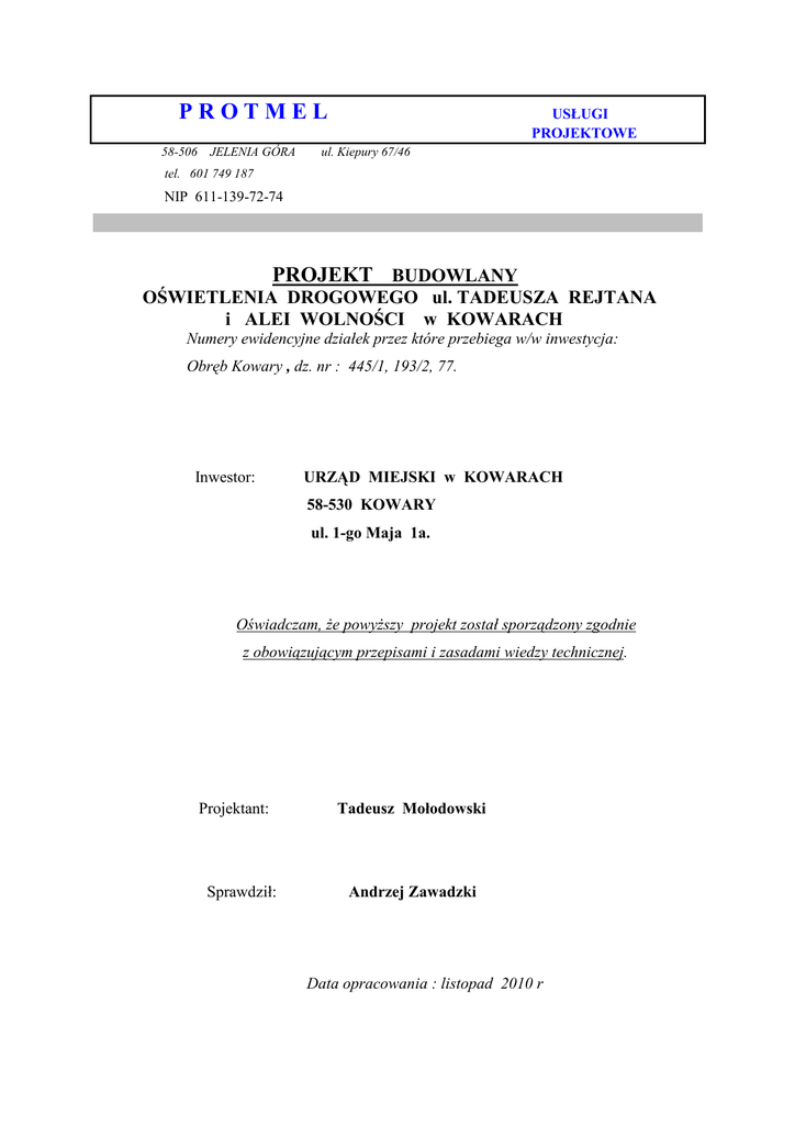 PROTMEL 58-506 JELENIA GÓRA USŁUGI PROJEKTOWE ul. Kiepury 67/46 tel. 601 749 187 NIP 611-139-72-74 PROJEKT BUDOWLANY OŚWIETLENIA DROGOWEGO ul. TADEUSZA REJTANA i ALEI WOLNOŚCI w KOWARACH Numery ewidencyjne działek przez które przebiega w/w inwestycja: Obręb Kowary , dz. nr : 445/1, 193/2, 77. Inwestor: URZĄD MIEJSKI w KOWARACH 58-530 KOWARY ul. 1-go Maja 1a. Oświadczam, że powyższy projekt został sporządzony zgodnie z obowiązującym przepisami i zasadami wiedzy technicznej. Projektant: Sprawdził: Tadeusz Mołodowski Andrzej Zawadzki Data opracowania : listopad 2010 r Wykaz dokumentów i uzgodnień 1. Spis zawartości projektu str. 1 2. Warunki przyłączenia nr 2010/1192 z dnia 16.11.10 wydane przez EnergiaPro SA Oddział w Jeleniej Górze str. 2 3. Opinia Zespołu Uzgadniania Dokumentacji Projektowej nr 618/10 z dnia 30.11.2010 r. str. 3 – 6 4. Decyzja nr 11089/10 Dolnośląskiego Wojewódzkiego Konserwatora Zabytków we Wrocławiu Delegatura w Jeleniej Górze z dn. 23.11.10 str. 7 5. Opis techniczny str. 8 - 9 6. rys. 1 – 3 - Plan zagospodarowania terenu str. 10 - 12 7. rys. 4 str. 13 - Schemat zasilania oświetlenia 8. Informacja do planu bezpieczeństwa i ochrony zdrowia str. 14 - 16 5. OPIS TECHNICZNY 5.1. PODSTAWA OPRACOWANIA Projekt niniejszy opracowany został na zlecenie Urzędu Miejskiego w Kowarach w oparciu o: - plany sytuacyjne geodezyjne w skali 1:500 - aktualne katalogi branżowe - obowiązujące normy i przepisy - norma SEP N SEP-E-004 Elektroenergetyczne i sygnalizacyjne linie kablowe – Projektowanie i budowa - norma SEP N SEP-E-001 ochrona przeciwporażeniowa - norma PN-76/E-02032 - oświetlenie dróg publicznych - wizja lokalna 5.2. ZAKRES OPRACOWANIA Opracowanie obejmuje wykonanie oświetlenia ulicy : Tadeusza Rejtana i Alei Wolności w Kowarach. Projektowane oświetlenie zostanie wykonane jako budowa nowego oświetlenia drogowego zasilanego z projektowanej szafki oświetleniowej SO. Szafkę oświetleniową zasilić należy z zestawu złączowo – pomiarowego ZK-4 + SL zabudowanego przy słupie sieci niskiego napięcia na dz. nr 77 ( róg ul. Rejtana – Kasztanowa ). Projektowane oświetlenie wykonane będzie latarniami z oprawami sodowymi 150 W na słupach oświetleniowych z blachy stalowej profilowanej ocynkowanej o wysokości 8 m z wysięgnikami 1,0 m mocowanych na prefabrykowanych fundamentach betonowych. Projekt obejmuje : - oświetlenie ulic na łącznej długości - linię kablową YAKY 4x25 mm 2 - słupy z blachy stalowej profilowanej 550 mb 610 mb 15 szt 5.3 OŚWIETLENIE DROGOWE Budowa oświetlenia obejmować będzie dwa obwody oświetleniowe wykonane kablem YAKY 4 x 25 mm2 zasilane z projektowanej szafki oświetleniowej SO. Szafkę oświetleniową SO należy zasilić kablem YAKY 4 x x25 mm2 z zestawu złączowo-pomiarowego ZK-4 + SL zabudowanego przy słupie linii napowietrznej nn. na dz. nr 77. Załączaniem oświetlenia sterować będzie zegar astronomiczny. Zabezpieczenie obwodów oświetleniowych wykonać w szafce SO wkładkami 10 A. Do oświetlenia należy zastosować oprawy sodowe 150W zabudowane na słupach oświetleniowych z blachy stalowej profilowanej ocynkowanej o wysokości 8 m z wysięgnikiem 1,0 m mocowanych na prefabrykowanych fundamentach betonowych. Na tabliczkach bezpiecznikowych w latarniach oprawy oświetleniowe zabezpieczyć rozłącznikami izolacyjnymi z bezpiecznikami R 301 z wkładką topikową 6 A . W słupach oświetleniowych od tabliczki bezpiecznikowej do oprawy układać przewody YDY 3 x 2,5mm2 750 V. Projektowany obwód nr 2 zasilać będzie także istniejące 4 latarnie przy Alei Wolności. W tym celu należy do ostatniej latarni zabudowanej przy ulicy wprowadzić projektowany kabel oświetleniowy na zaciski w słupie latarni w miejsce odłączonego kabla z kierunku ulicy Rejtana. Usytuowanie latarń pokazano na rysunkach sytuacyjnych rysunki nr 1 do 3. Moce opraw oraz fazy do których należy podłączyć oprawy pokazano na schemacie zasilania oświetlenia rysunek nr 4. 5.4 LINIA KABLOWA NISKIEGO NAPIĘCIA Projektowane kable należy układać na całej długości w rurach ochronnych Arota φ50 na głębokości 0,6 m. Następnie po nasypaniu 20 cm gruntu rodzimego należy kabel na całej długości trasy przykryć folią koloru niebieskiego. Przejście kabla pod jezdnią wykonać metodą przewiertu bez naruszania nawierzchni. na głębokości 1,0 m od górnej nawierzchni drogi. Przy układaniu kabla zachować od innych urządzeń podziemnych wymagane odległości zgodne z tabelą 1.2. normy SEP N SEP-E-004. Na rurę ochronną kabli należy założyć opaski, umieszczając trwałe opisy: - typ i rodzaj kabla, - przekrój żył kabla i napięcie robocze, - rok ułożenia kabla, - nazwa obiektu zasilania od ..... do ...... Latarnie należy uziemić łącząc płaskownikiem cynk. Fe/Zn 30 x 3 mm układanym w rowie kablowym. Rezystancja uziomu nie powinna przekroczyć 30 Ω . 5.5 OCHRONA PRZECIWPORAŻENIOWA Jako dodatkowy system ochrony od porażeń prądem elektrycznym przyjęto zerowanie. Po wykonaniu robót należy przeprowadzić pomiary skuteczności zerowania linii kablowych oraz pomiary rezystancji uziemienia roboczego dodatkowego. 5.6 UWAGI KOŃCOWE - wytyczyć trasę kabli i oznaczyć kolizje z istniejącym i projektowanym uzbrojeniem terenu a roboty w ich obrębie wykonywać ręcznie. - wykonać pomiary rezystancji uziemień, skuteczności ochrony przeciwporażeniowej. - teren po wykonaniu robót należy doprowadzić do stanu pierwotnego. - dla latarń posadowionych w pobliżu drzew, gałęzie przysłaniające oprawy należy przyciąć. - do protokółu odbioru technicznego należy dołączyć atesty zabudowanych urządzeń, protokóły pomiarów i inwentaryzację geodezyjną. Inwestor : URZĄD MIEJSKI w KOWARACH 58-530 Kowary ul. 1-Maja 1a INFORMACJA DO PLANU BEZPIECZEŃSTWA I OCHRONY ZDROWIA OŚWIETLENIE ULICY TADEUSZA REJTANA i ALEI WOLNOŚCI w KOWARACH 1. Zakres oraz kolejność robot budowlano-mo