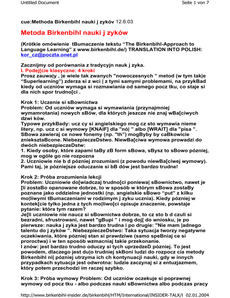 Untitled Document Seite 1 von 7 cue:Methoda Birkenbihl nauki j zykóv 12.6.03 Metoda Birkenbihl nauki j zyków (Krótkie omówienie tBumaczenie tekstu “The Birkenbihl-Approach to Language Learning” z www.birkenbihl.de/) TRANSLATION INTO POLISH: [email protected] Zacznijmy od porównania z tradycyjn nauk j zyka. I. Podej[cie klasyczne: 4 kroki Prosz zauwa|y , |e wiele tak zwanych "nowoczesnych ” metod (w tym tak|e “Superlearning”) zderza si z wci | z tymi samymi problemami, na przykBad kiedy od uczniów wymaga si rozmawiania od samego pocz tku, co staje si dla nich spor trudno[ci . Krok 1: Uczenie si sBownictwa Problem: Od uczniów wymaga si wymawiania (przynajmniej wymamrotania) nowych sBów, dla których jeszcze nie znaj wBa[ciwych dzwi ków. Typowe przykBady: ucz cy si angielskiego mog cz sto wymawia nieme litery, np. ucz c si wymowy [KNAIF] dla "nó| ” albo [WRAIT] dla "pisa ”. SBowa zawieraj ce nowe fonemy (np. "th”) mogByby by caBkowicie znieksztaBcone. NiebezpieczeDstwo. NiewBa[ciwa wymowa prowadzi do dwóch niebezpieczeDstw: 1. Kiedy osoby, które zapami taBy zB form sBowa, sBysz to sBowo pózniej, mog w ogóle go nie rozpozna 2. Uczniowie nie b d pózniej zrozumiani (z powodu niewBa[ciwej wymowy). Pami taj, |e pózniejsze oduczanie si bB dów jest bardzo trudne! Krok 2: Próba zrozumienia lekcji Problem: Uczniowie do[wiadczaj trudno[ci poniewa| sBownictwo, nawet je [li zostaBo opanowane dobrze, to w sposób w którym sBowa zostaBy poznane jako oddzielne jednostki (np. angielskie sBowo “put” z kilku mo|liwymi tBumaczeniami w rodzimym j zyku ucznia). Kiedy pózniej w kontek[cie tylko jedna z tych mo|liwo[ci opisuje znaczenie, powstaje pytanie: która tym razem? Je[li uczniowie nie naucz si sBownictwa dobrze, to cz sto b d czuli si bezradni, sfrustrowani, nawet "gBupi ” i mog doj[ do wniosku, |e po pierwsze: nauka j zyka jest bardzo trudna i po drugie: "Nie mam |adnego talentu do j zyków ”. NiebezpieczeDstwo: Taka sytuacja tworzy negatywne oczekiwania, które pózniej stan si prawdziwe (samo speBniaj ce si proroctwa) i w ten sposób wzmacniaj takie przekonanie. I znów: jest bardzo trudno oduczy si tych uprzedzeD pózniej. To jest powodem, dlaczego jest du|o trudniej skBoni ludzi do rozpocz cia metody Birkenbihl ni| pózniej utrzyma ich ch kontynuacji nauki, gdy w innych przypadkach sytuacja jest odwrotna: ludzie zaczynaj si z entuzjazmem, który potem przechodzi im raczej szybko. Krok 3: Próba wymowy Problem: Od uczniów oczekuje si poprawnej wymowy od pocz tku - albo podczas nauki sBownictwa albo podczas pracy http://www.birkenbihl-insider.de/birkenbihl/HTM/International/INSIDER-TALK/b 02.01.2004 Untitled Document Seite 2 von 7 w klasie. Pomimo |e takie podej[cie jest uwa|ane za szczególnie "nowoczesne ”, to nie jest ono przyjazne dla mózgu. Rozwa|, |e dzieci sBuchaj j zyka przez miesi ce zanim próbuj imitowa niektóre dzwi ki, a my oczekujemy, |e osoby ucz ce si j zyka natychmiast b d powtarzaBy dzwi ki, z którymi si jeszcze nie oswoiBy. NiebezpieczeDstwo: Uczniowie nie tylko wymawiaj sBowa zle (albo nieodpowiednio), ale te| b d B czyBy t niewygodn nieznajomo[ wymowy z uczuciami frustracji. Te nieprzyjemne uczucia s B czone wtedy z uczonym j zykiem albo z nauk j zyka jako tak , a nawet tworz negatywne nastawienie do nauki w ogóle. Wielu nauczycieli i rodziców opisuje to zjawisko jako gBówny powód zBych wyników nauki. Krok 4: Praktyka ( wiczenia gramatyczne) Problem: Oczekuje si |e uczniowie b d przerabia z rado[ci to czym z natury raczej gardz . Nie wi cej ni| 8% ludzi CIESZY si z powodu wiczeD z gramatyki nawet w ich rodzimym j zyku. NiebezpieczeDstwo: Dalsze do[wiadczenia niezdolno[ci i frustracji, które pogB biaj niech do nauczanego j zyka (albo do nauki j zyków w ogóle). II. Podstawowe ró|nice metody Birkenbihl w stosunku do metod tradycyjnych: 1. Uczniowie zaznajamiaj si z ka|dym szczególnym aspektem nauki PRZED praktycznym próbowaniem tego aspektu po raz pierwszy. Na przykBad : Uczniowie wymawiaj sBowa pierwszy raz w CZWARTYM kroku nauki, po peBnym ZROZUMIENIU znaczeD (krok 2) i GRUNTOWNYM ZAZNAJOMIENIU z dzwi kami (krok 3 - bierna nauka, patrz poni|ej). 2. Uczniowie zawsze s zaanga|owani tylko w JEDEN pojedynczy aspekt uczenia si w danym czasie: w kroku 1: Rozumienie ZNACZENIA sBów w kontek[cie (|adnych sBów wyodr bnionych); w kroku 2: A czenie DyWI KU sBów z ich ZNACZENIEM; w kroku 3: Zakotwiczanie tych dzwi ków mocno w PODZWIADOMOZCI podczas BIERNEJ FAZY NAUKI: uczniowie sBuchaj maBych porcji lekcji wielokrotnie robi c w tym czasie inne rzeczy. NIE maj sBucha aktywnie lecz BIERNIE - jest to DRUGOPLANOWA DZIAAALNOZ , która nie zabiera cennego czasu. Wskazane jest aby bierne sBuchanie poszBo nawet dalej: w trakcie ogl dania TV, czytania, uczenia si innego tematu itp. 3. Uczniowie ucz si tylko tego, czego CHC si nauczy . Minimalnym celem jest rozumienie j zyka mówionego, co dla niektórych jest wystarczaj ce (np. dla ogl dania telewizji satelitarnej). Kalda osoba ucz ca si decyduje si indywidualnie, któr z trzech dalszych umiej tno[ci jest zainteresowana: • Mówienie w danym j zyku • Czytanie • Pisanie. Te trzy zadania nie zdarz si przed czwartym krokiem nauki, to jest zanim gdy ROZUMIENIE ZNACZENIA i ROZPOZNAWANIE DyWI KÓW danego tekstu (lekcji) nie stanie si AATWE. III. Metoda Birkenbihl : 4 kroki Krok 1: ROZUMIENIE ZNACZENIA SAÓW PROCEDURA: Lekcja jest prezentowana w postaci tekstu pisanego z http://www.birkenbihl-insider.de/birkenbihl/HTM/International/INSIDER-TALK/b ... 02.01.2004 Untitled Document Seite 3 von 7 tBumaczeniem sBowo po sBowie, przy czym tBumaczenie podane jest pod sBowami. PrzykBad - j zyk docelowy (uczony): wBoski, j zyk zródBowy: polski. Parla Italiano ? ty-mówisz wBoski ? Zadaniem osoby ucz cej si jest po prostu czytanie tBumaczenia sBowa po sBowie (optymalnie z zaznaczaniem przy pomocy mi kkiego kolorowego markera) w celu caBkowitego ogarni cia materiaBu i wizualizacji jego zawarto[ci (z wyk