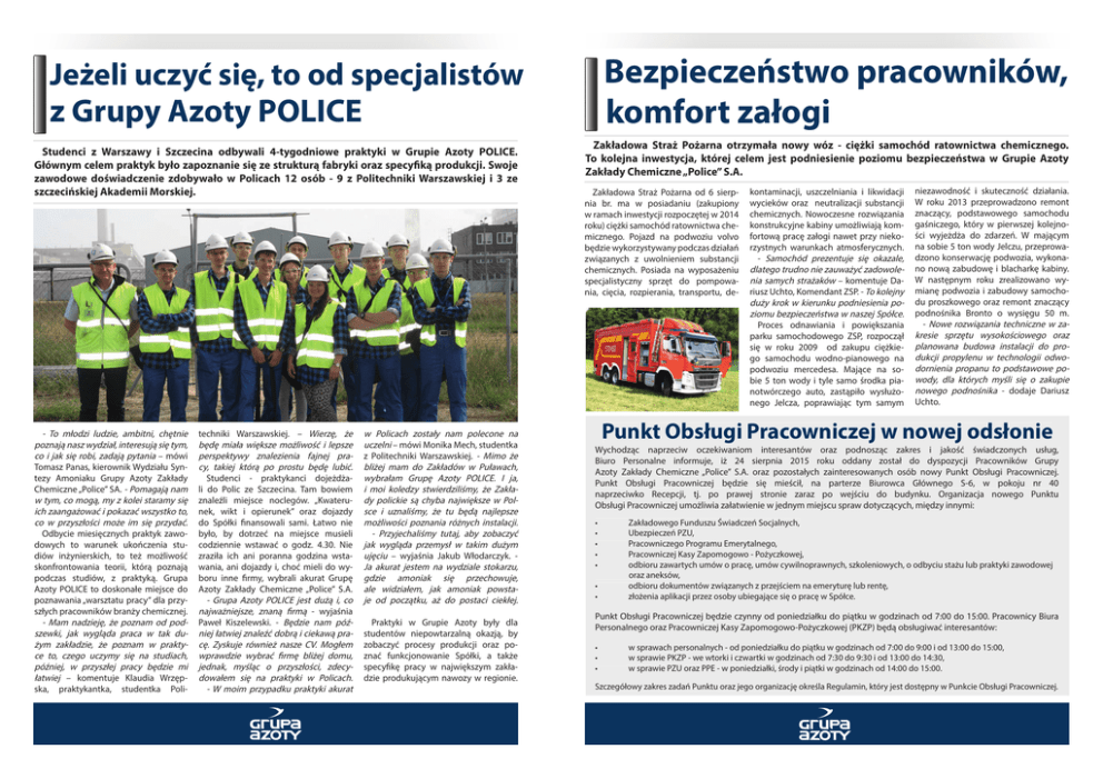 Bezpieczeństwo pracowników, komfort załogi Jeżeli uczyć się, to od specjalistów z Grupy Azoty POLICE Studenci z Warszawy i Szczecina odbywali 4-tygodniowe praktyki w Grupie Azoty POLICE. Głównym celem praktyk było zapoznanie się ze strukturą fabryki oraz specyfiką produkcji. Swoje zawodowe doświadczenie zdobywało w Policach 12 osób - 9 z Politechniki Warszawskiej i 3 ze szczecińskiej Akademii Morskiej. - To młodzi ludzie, ambitni, chętnie poznają nasz wydział, interesują się tym, co i jak się robi, zadają pytania – mówi Tomasz Panas, kierownik Wydziału Syntezy Amoniaku Grupy Azoty Zakłady Chemiczne „Police” SA. - Pomagają nam w tym, co mogą, my z kolei staramy się ich zaangażować i pokazać wszystko to, co w przyszłości może im się przydać. Odbycie miesięcznych praktyk zawodowych to warunek ukończenia studiów inżynierskich, to też możliwość skonfrontowania teorii, którą poznają podczas studiów, z praktyką. Grupa Azoty POLICE to doskonałe miejsce do poznawania „warsztatu pracy” dla przyszłych pracowników branży chemicznej. - Mam nadzieję, że poznam od podszewki, jak wygląda praca w tak dużym zakładzie, że poznam w praktyce to, czego uczymy się na studiach, później, w przyszłej pracy będzie mi łatwiej – komentuje Klaudia Wrzępska, praktykantka, studentka Poli- techniki Warszawskiej. – Wierzę, że będę miała większe możliwość i lepsze perspektywy znalezienia fajnej pracy, takiej którą po prostu będę lubić. Studenci - praktykanci dojeżdżali do Polic ze Szczecina. Tam bowiem znaleźli miejsce noclegów. „Kwaterunek, wikt i opierunek” oraz dojazdy do Spółki finansowali sami. Łatwo nie było, by dotrzeć na miejsce musieli codziennie wstawać o godz. 4.30. Nie zraziła ich ani poranna godzina wstawania, ani dojazdy i, choć mieli do wyboru inne firmy, wybrali akurat Grupę Azoty Zakłady Chemiczne „Police” S.A. - Grupa Azoty POLICE jest dużą i, co najważniejsze, znaną firmą - wyjaśnia Paweł Kiszelewski. - Będzie nam później łatwiej znaleźć dobrą i ciekawą pracę. Zyskuje również nasze CV. Mogłem wprawdzie wybrać firmę bliżej domu, jednak, myśląc o przyszłości, zdecydowałem się na praktyki w Policach. - W moim przypadku praktyki akurat w Policach zostały nam polecone na uczelni – mówi Monika Mech, studentka z Politechniki Warszawskiej. - Mimo że bliżej mam do Zakładów w Puławach, wybrałam Grupę Azoty POLICE. I ja, i moi koledzy stwierdziliśmy, że Zakłady polickie są chyba największe w Polsce i uznaliśmy, że tu będą najlepsze możliwości poznania różnych instalacji. - Przyjechaliśmy tutaj, aby zobaczyć jak wygląda przemysł w takim dużym ujęciu – wyjaśnia Jakub Włodarczyk. Ja akurat jestem na wydziale stokarzu, gdzie amoniak się przechowuje, ale widziałem, jak amoniak powstaje od początku, aż do postaci ciekłej. Praktyki w Grupie Azoty były dla studentów niepowtarzalną okazją, by zobaczyć procesy produkcji oraz poznać funkcjonowanie Spółki, a także specyfikę pracy w największym zakładzie produkującym nawozy w regionie. Zakładowa Straż Pożarna otrzymała nowy wóz - ciężki samochód ratownictwa chemicznego. To kolejna inwestycja, której celem jest podniesienie poziomu bezpieczeństwa w Grupie Azoty Zakłady Chemiczne „Police” S.A. Zakładowa Straż Pożarna od 6 sierpnia br. ma w posiadaniu (zakupiony w ramach inwestycji rozpoczętej w 2014 roku) ciężki samochód ratownictwa chemicznego. Pojazd na podwoziu volvo będzie wykorzystywany podczas działań związanych z uwolnieniem substancji chemicznych. Posiada na wyposażeniu specjalistyczny sprzęt do pompowania, cięcia, rozpierania, transportu, de- kontaminacji, uszczelniania i likwidacji wycieków oraz neutralizacji substancji chemicznych. Nowoczesne rozwiązania konstrukcyjne kabiny umożliwiają komfortową pracę załogi nawet przy niekorzystnych warunkach atmosferycznych. - Samochód prezentuje się okazale, dlatego trudno nie zauważyć zadowolenia samych strażaków – komentuje Dariusz Uchto, Komendant ZSP. - To kolejny duży krok w kierunku podniesienia poziomu bezpieczeństwa w naszej Spółce. Proces odnawiania i powiększania parku samochodowego ZSP, rozpoczął się w roku 2009 od zakupu ciężkiego samochodu wodno-pianowego na podwoziu mercedesa. Mające na sobie 5 ton wody i tyle samo środka pianotwórczego auto, zastąpiło wysłużonego Jelcza, poprawiając tym samym niezawodność i skuteczność działania. W roku 2013 przeprowadzono remont znaczący, podstawowego samochodu gaśniczego, który w pierwszej kolejności wyjeżdża do zdarzeń. W mającym na sobie 5 ton wody Jelczu, przeprowadzono konserwację podwozia, wykonano nową zabudowę i blacharkę kabiny. W następnym roku zrealizowano wymianę podwozia i zabudowy samochodu proszkowego oraz remont znaczący podnośnika Bronto o wysięgu 50 m. - Nowe rozwiązania techniczne w zakresie sprzętu wysokościowego oraz planowana budowa instalacji do produkcji propylenu w technologii odwodornienia propanu to podstawowe powody, dla których myśli się o zakupie nowego podnośnika - dodaje Dariusz Uchto. Punkt Obsługi Pracowniczej w nowej odsłonie Wychodząc naprzeciw oczekiwaniom interesantów oraz podnosząc zakres i jakość świadczonych usług, Biuro Personalne informuje, iż 24 sierpnia 2015 roku oddany został do dyspozycji Pracowników Grupy Azoty Zakłady Chemiczne „Police” S.A. oraz pozostałych zainteresowanych osób nowy Punkt Obsługi Pracowniczej. Punkt Obsługi Pracowniczej będzie się mieścił, na parterze Biurowca Głównego S-6, w pokoju nr 40 naprzeciwko Recepcji, tj. po prawej stronie zaraz po wejściu do budynku. Organizacja nowego Punktu Obsługi Pracowniczej umożliwia załatwienie w jednym miejscu spraw dotyczących, między innymi: • • • • • • • Zakładowego Funduszu Świadczeń Socjalnych, Ubezpieczeń PZU, Pracowniczego Programu Emeryt
