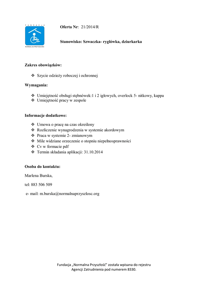 Oferta Nr: 21/2014/R Stanowisko: Szwaczka- ryglówka, dziurkarka Zakres obowiązków: v Szycie odzieży roboczej i ochronnej Wymagania: v Umiejętność obsługi stębnówek:1 i 2 igłowych, overlock 5- nitkowy, kappa v Umiejętność pracy w zespole Informacje dodatkowe: v v v v v v Umowa o pracę na czas określony Rozliczenie wynagrodzenia w systemie akordowym Praca w systemie 2- zmianowym Mile widziane orzeczenie o stopniu niepełnosprawności Cv w formacie pdf Termin składania aplikacji: 31.10.2014 Osoba do kontaktu: Marlena Burska, tel: 883 506 509 e- mail: [email protected] Fundacja „Normalna Przyszłość” została wpisana do rejestru Agencji Zatrudnienia pod numerem 8330.