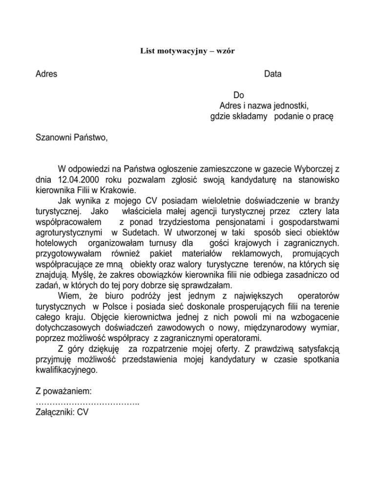 List motywacyjny – wzór Adres Data Do Adres i nazwa jednostki, gdzie składamy podanie o pracę Szanowni Państwo, W odpowiedzi na Państwa ogłoszenie zamieszczone w gazecie Wyborczej z dnia 12.04.2000 roku pozwalam zgłosić swoją kandydaturę na stanowisko kierownika Filii w Krakowie. Jak wynika z mojego CV posiadam wieloletnie doświadczenie w branży turystycznej. Jako właściciela małej agencji turystycznej przez cztery lata współpracowałem z ponad trzydziestoma pensjonatami i gospodarstwami agroturystycznymi w Sudetach. W utworzonej w taki sposób sieci obiektów hotelowych organizowałam turnusy dla gości krajowych i zagranicznych. przygotowywałam również pakiet materiałów reklamowych, promujących współpracujące ze mną obiekty oraz walory turystyczne terenów, na których się znajdują. Myślę, że zakres obowiązków kierownika filii nie odbiega zasadniczo od zadań, w których do tej pory dobrze się sprawdzałam. Wiem, że biuro podróży jest jednym z największych operatorów turystycznych w Polsce i posiada sieć doskonale prosperujących filii na terenie całego kraju. Objęcie kierownictwa jednej z nich powoli mi na wzbogacenie dotychczasowych doświadczeń zawodowych o nowy, międzynarodowy wymiar, poprzez możliwość współpracy z zagranicznymi operatorami. Z góry dziękuję za rozpatrzenie mojej oferty. Z prawdziwą satysfakcją przyjmuję możliwość przedstawienia mojej kandydatury w czasie spotkania kwalifikacyjnego. Z poważaniem: ……………………………….. Załączniki: CV