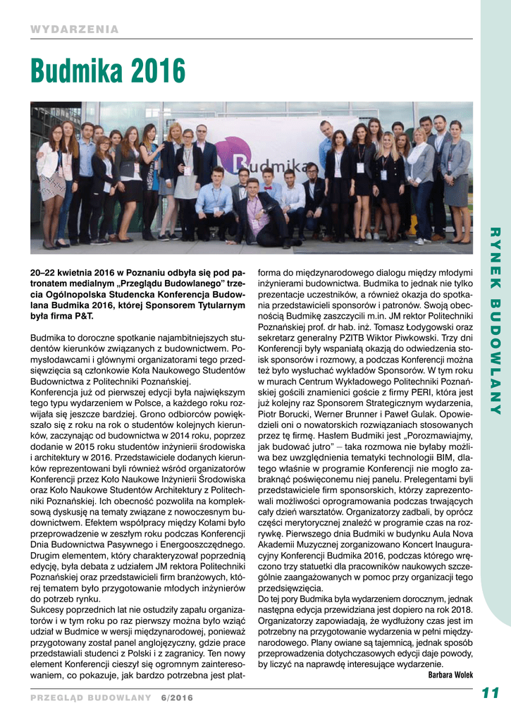 WYDAR ZEN I A Budmika 2016 Budmika to doroczne spotkanie najambitniejszych studentów kierunków związanych z budownictwem. Pomysłodawcami i głównymi organizatorami tego przedsięwzięcia są członkowie Koła Naukowego Studentów Budownictwa z Politechniki Poznańskiej. Konferencja już od pierwszej edycji była największym tego typu wydarzeniem w Polsce, a każdego roku rozwijała się jeszcze bardziej. Grono odbiorców powiększało się z roku na rok o studentów kolejnych kierunków, zaczynając od budownictwa w 2014 roku, poprzez dodanie w 2015 roku studentów inżynierii środowiska i architektury w 2016. Przedstawiciele dodanych kierunków reprezentowani byli również wśród organizatorów Konferencji przez Koło Naukowe Inżynierii Środowiska oraz Koło Naukowe Studentów Architektury z Politechniki Poznańskiej. Ich obecność pozwoliła na kompleksową dyskusję na tematy związane z nowoczesnym budownictwem. Efektem współpracy między Kołami było przeprowadzenie w zeszłym roku podczas Konferencji Dnia Budownictwa Pasywnego i Energooszczędnego. Drugim elementem, który charakteryzował poprzednią edycję, była debata z udziałem JM rektora Politechniki Poznańskiej oraz przedstawicieli firm branżowych, której tematem było przygotowanie młodych inżynierów do potrzeb rynku. Sukcesy poprzednich lat nie ostudziły zapału organizatorów i w tym roku po raz pierwszy można było wziąć udział w Budmice w wersji międzynarodowej, ponieważ przygotowany został panel anglojęzyczny, gdzie prace przedstawiali studenci z Polski i z zagranicy. Ten nowy element Konferencji cieszył się ogromnym zainteresowaniem, co pokazuje, jak bardzo potrzebna jest platPR zeglĄ d bu d ow l an y 6/2016 forma do międzynarodowego dialogu między młodymi inżynierami budownictwa. Budmika to jednak nie tylko prezentacje uczestników, a również okazja do spotkania przedstawicieli sponsorów i patronów. Swoją obecnością Budmikę zaszczycili m.in. JM rektor Politechniki Poznańskiej prof. dr hab. inż. Tomasz Łodygowski oraz sekretarz generalny PZITB Wiktor Piwkowski. Trzy dni Konferencji były wspaniałą okazją do odwiedzenia stoisk sponsorów i rozmowy, a podczas Konferencji można też było wysłuchać wykładów Sponsorów. W tym roku w murach Centrum Wykładowego Politechniki Poznańskiej gościli znamienici goście z firmy PERI, która jest już kolejny raz Sponsorem Strategicznym wydarzenia, Piotr Borucki, Werner Brunner i Paweł Gulak. Opowiedzieli oni o nowatorskich rozwiązaniach stosowanych przez tę firmę. Hasłem Budmiki jest „Porozmawiajmy, jak budować jutro” – taka rozmowa nie byłaby możliwa bez uwzględnienia tematyki technologii BIM, dlatego właśnie w programie Konferencji nie mogło zabraknąć poświęconemu niej panelu. Prelegentami byli przedstawiciele firm sponsorskich, którzy zaprezentowali możliwości oprogramowania podczas trwających cały dzień warsztatów. Organizatorzy zadbali, by oprócz części merytorycznej znaleźć w programie czas na rozrywkę. Pierwszego dnia Budmiki w budynku Aula Nova Akademii Muzycznej zorganizowano Koncert Inauguracyjny Konferencji Budmika 2016, podczas którego wręczono trzy statuetki dla pracowników naukowych szczególnie zaangażowanych w pomoc przy organizacji tego przedsięwzięcia. Do tej pory Budmika była wydarzeniem dorocznym, jednak następna edycja przewidziana jest dopiero na rok 2018. Organizatorzy zapowiadają, że wydłużony czas jest im potrzebny na przygotowanie wydarzenia w pełni międzynarodowego. Plany owiane są tajemnicą, jednak sposób przeprowadzenia dotychczasowych edycji daje powody, by liczyć na naprawdę interesujące wydarzenie. R YNE K BUDOWLANY 20–22 kwietnia 2016 w Poznaniu odbyła się pod patronatem medialnym „Przeglądu Budowlanego” trzecia Ogólnopolska Studencka Konferencja Budowlana Budmika 2016, której Sponsorem Tytularnym była firma P&T. Barbara Wolek 11