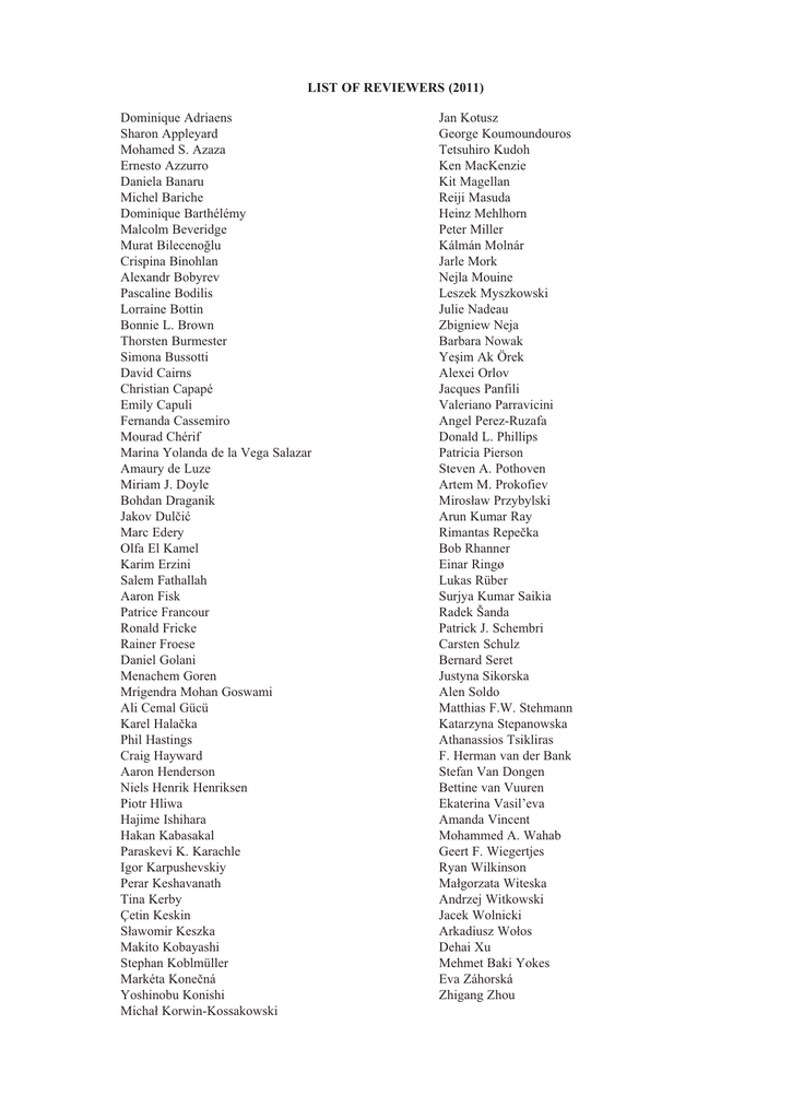 LIST OF REVIEWERS (2011) Dominique Adriaens Sharon Appleyard Mohamed S. Azaza Ernesto Azzurro Daniela Banaru Michel Bariche Dominique Barthélémy Malcolm Beveridge Murat Bilecenoğlu Crispina Binohlan Alexandr Bobyrev Pascaline Bodilis Lorraine Bottin Bonnie L. Brown Thorsten Burmester Simona Bussotti David Cairns Christian Capapé Emily Capuli Fernanda Cassemiro Mourad Chérif Marina Yolanda de la Vega Salazar Amaury de Luze Miriam J. Doyle Bohdan Draganik Jakov Dulčić Marc Edery Olfa El Kamel Karim Erzini Salem Fathallah Aaron Fisk Patrice Francour Ronald Fricke Rainer Froese Daniel Golani Menachem Goren Mrigendra Mohan Goswami Ali Cemal Gücü Karel Halačka Phil Hastings Craig Hayward Aaron Henderson Niels Henrik Henriksen Piotr Hliwa Hajime Ishihara Hakan Kabasakal Paraskevi K. Karachle Igor Karpushevskiy Perar Keshavanath Tina Kerby Çetin Keskin Sławomir Keszka Makito Kobayashi Stephan Koblmüller Markéta Konečná Yoshinobu Konishi Michał Korwin-Kossakowski Jan Kotusz George Koumoundouros Tetsuhiro Kudoh Ken MacKenzie Kit Magellan Reiji Masuda Heinz Mehlhorn Peter Miller Kálmán Molnár Jarle Mork Nejla Mouine Leszek Myszkowski Julie Nadeau Zbigniew Neja Barbara Nowak Yeşim Ak Örek Alexei Orlov Jacques Panfili Valeriano Parravicini Angel Perez-Ruzafa Donald L. Phillips Patricia Pierson Steven A. Pothoven Artem M. Prokofiev Mirosław Przybylski Arun Kumar Ray Rimantas Repečka Bob Rhanner Einar Ringø Lukas Rüber Surjya Kumar Saikia Radek Šanda Patrick J. Schembri Carsten Schulz Bernard Seret Justyna Sikorska Alen Soldo Matthias F.W. Stehmann Katarzyna Stepanowska Athanassios Tsikliras F. Herman van der Bank Stefan Van Dongen Bettine van Vuuren Ekaterina Vasil’eva Amanda Vincent Mohammed A. Wahab Geert F. Wiegertjes Ryan Wilkinson Małgorzata Witeska Andrzej Witkowski Jacek Wolnicki Arkadiusz Wołos Dehai Xu Mehmet Baki Yokes Eva Záhorská Zhigang Zhou