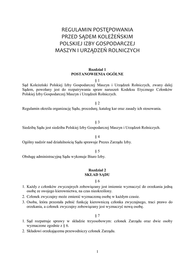 REGULAMIN POSTĘPOWANIA PRZED SĄDEM KOLEŻEŃSKIM POLSKIEJ IZBY GOSPODARCZEJ MASZYN I URZĄDZEŃ ROLNICZYCH Rozdział 1 POSTANOWIENIA OGÓLNE §1 Sąd Koleżeński Polskiej Izby Gospodarczej Maszyn i Urządzeń Rolniczych, zwany dalej Sądem, powołany jest do rozpatrywania spraw naruszeń Kodeksu Etycznego Członków Polskiej Izby Gospodarczej Maszyn i Urządzeń Rolniczych. §2 Regulamin określa organizację Sądu, procedurę, katalog kar oraz zasady ich stosowania. §3 Siedzibą Sądu jest siedziba Polskiej Izby Gospodarczej Maszyn i Urządzeń Rolniczych. §4 Ogólny nadzór nad działalnością Sądu sprawuje Prezes Zarządu Izby. §5 Obsługę administracyjną Sądu wykonuje Biuro Izby. Rozdział 2 SKŁAD SĄDU §6 1. Każdy z członków zwyczajnych zobowiązany jest imiennie wyznaczyć do orzekania jedną osobę ze swojego kierownictwa, na czas nieokreślony. 2. Członek zwyczajny może zmienić wyznaczoną osobę w każdym czasie. 3. Osoba, która przestała pełnić funkcję kierowniczą członka zwyczajnego, traci prawo do orzekania, a członek zwyczajny zobowiązany jest wyznaczyć nową osobę. §7 1. Sąd rozpatruje sprawy w składzie trzyosobowym: członek Zarządu oraz dwie osoby wyznaczone zgodnie z § 6. 2. Składowi orzekającemu przewodniczy członek Zarządu. 1 §8 1. Członkiem składu orzekającego nie może być osoba związana w jakikolwiek sposób z obwinionym, którego sprawa dotyczy. 2. Członkowie składu orzekającego wyznaczeni przez członków zwyczajnych nie mogą być powiązani z firmą członka Zarządu, który przewodniczy składowi orzekającemu. §9 Skład orzekający wyznacza Prezes Zarządu według kolejności alfabetycznej nazwisk w ten sposób, że pierwszą sprawę rozpatrują osoby pierwsze na liście alfabetycznej, drugą sprawę kolejne, następną kolejne i tak dalej. § 10 Osoba powołana do składu orzekającego może odmówić tylko w przypadkach określonych w § 8, uzasadniając swoje stanowisko. W takim przypadku Prezes Zarządu wyznacza kolejną osobę z listy. Jeżeli jednak uzasadnienie osoby wyznaczonej przez członka zwyczajnego Prezes Zarządu uzna za nieprzekonywujące. może domagać się od członka zwyczajnego dokonania zmiany wyznaczonej osoby. § 11 Biuro Izby zobowiązane jest prowadzić alfabetyczną listę osób, o których mowa w § 6, z odnotowywaniem spraw, w których osoby te orzekały. Rozdział 3 POSTĘPOWANIE § 12 Sąd podejmuje czynności na wniosek każdego członka Izby a także członka władz Izby. § 13 Po wpłynięciu wniosku Prezes Zarządu wyznacza skład orzekający. § 14 Z zastrzeżeniem postanowień § 16, skład orzekający działa bez odbywania posiedzeń, przy wykorzystaniu środków komunikowania się na odległość, chyba że przewodniczący uzna odbycie posiedzenia za konieczne. § 15 1. Skład orzekający zobowiązany jest do wyjaśnienia sprawy poprzez: 1) zwrócenie się do obwinionego o udzielenie wyjaśnień, 2) zwrócenie się do innych osób i podmiotów, które mogą posiadać informacje lub dokumenty dotyczące sprawy będącej przedmiotem postępowania. 2. Wystąpienia składu orzekającego mogą być dokonywane w formie pisemnej oraz elektronicznej. 3. Każdy z członków składu orzekającego może samodzielnie pozyskiwać informację poprzez bezpośredni kontakt z osobami udzielającymi informacji. W takim przypadku członek ten zobowiązany jest sporządzić notatkę i przekazać ją pozostałym członkom składu orzekającego. 2 § 16 1. Gdy przewodniczący uzna, że sprawa została dostatecznie wyjaśniona, zwołuje posiedzenie składu orzekającego w celu wydania orzeczenia, zapraszając również obwinionego. 2. Orzeczenie może zostać wydane wyłącznie po naradzie całego składu orzekającego. 3. Jeżeli obwiniony stawił się na posiedzenie, ma on prawo przedstawienia swojego stanowiska przed naradą składu orzekającego. 1. 2. 3. 4. § 17 Orzeczenie zapada zwykła większością głosów. Orzeczenie sporządza się w formie pisemnej. Orzeczenie inno zawierać: 1) datę i miejsce, 2) skład zespołu orzekającego, 3) oznaczenie obwinionego, 4) określenie zarzucanego czynu, 5) rozstrzygnięcie sprawy. Pod orzeczeniem zobowiązani są podpisać się wszyscy członkowie składu orzekającego. Przegłosowany członek składu orzekającego może pod orzeczeniem zaznaczyć swoje zdanie odrębne. § 18 Odpis orzeczenia doręcza się obwinionemu. Rozdział 4 KARY § 19 1. Karami są: 1) upomnienie, 2) nagana. 2. Karę upomnienia stosuje się za przewinienia mniejszej wagi, karę nagany za poważniejsze przewinienia oraz za ponowne przewinienia mniejszej wagi. § 20 W przypadku rażącego lub nagminnego naruszania Kodeksu etycznego, niezależnie od zastosowanej kary Sąd może: 1) w przypadku ukarania członka zwyczajnego Izby: złożyć do Rady Izby wniosek o zmianę charakteru członkostwa z zwyczajnego na nadzwyczajny, 2) złożyć do Rady wniosek o wykluczenie ukaranego członka Izby, 3) w przypadku ukaranie członka Zarządu lub przedstawiciela członków nadzwyczajnych w Radzie Izby: złożyć do Rady wniosek o zawieszenie tego członka Zarządu lub przedstawiciela członków nadzwyczajnych członków w Radzie Izby, 4) w razie ukarania pracownika: złożyć do pracodawcy wniosek o zastosowanie kar dyscyplinarnych przewidzianych w Kodeksie pracy. 3 § 21 Zastosowane kary podaje się do wiadomości wszystkim członkom Izby, po ich uprawomocnieniu. Rozdział 5 ODWOŁANIE § 22 Ukarany przez Sąd może w terminie 14 dni od daty otrzymania orzeczenia złożyć odwołanie do Rady Izby. W przypadku złożenia odwołania korespondencyjnie, decyduje data nadania przesyłki. § 23 Odwołanie wymaga formy pisemnej oraz uzasadnienia. § 24 1. Odwołanie składa się w Biurze Izby. 2. Odwołanie wraz z aktami sprawy Biuro Izby zobowiązane jest przedstawić Radzie Izby na najbliższym jej posiedzeniu. § 25 1. Rada Izby zobowiązana jest rozpatrzyć odwołanie na najbliższym posied