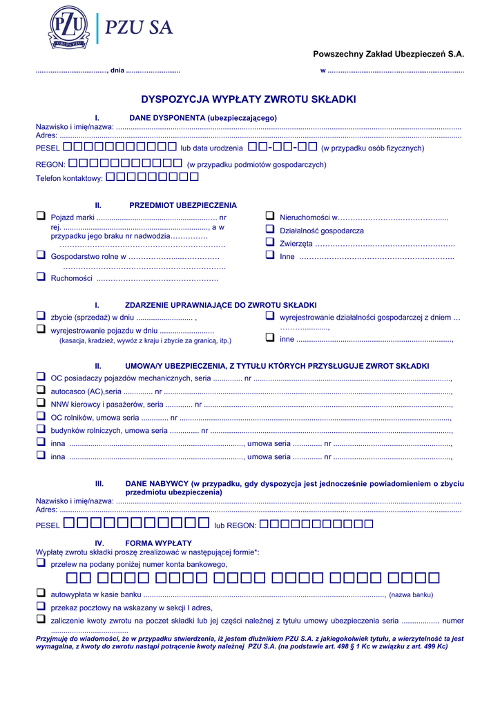 Powszechny Zakład Ubezpieczeń S.A. ......................................, dnia ............................. w ......................................................................... DYSPOZYCJA WYPŁATY ZWROTU SKŁADKI I. DANE DYSPONENTA (ubezpieczającego) Nazwisko i imię/nazwa: ..................................................................................................................................................................... Adres: ................................................................................................................................................................................................ PESEL lub data urodzenia -- (w przypadku osób fizycznych) REGON: (w przypadku podmiotów gospodarczych) Telefon kontaktowy: II. PRZEDMIOT UBEZPIECZENIA Pojazd marki .....................................................…. nr rej. ....................................................................., a w przypadku jego braku nr nadwodzia…………… ………………………………………………………… Gospodarstwo rolne w ………………....…………… ……………………………….………………………. Ruchomości ...………………………………………. I. wyrejestrowanie pojazdu w dniu .......................... (kasacja, kradzież, wywóz z kraju i zbycie za granicą, itp.) Nieruchomości w…………………….……………..... Działalność gospodarcza Zwierzęta ………………….……………………………. Inne …………………………………………………….. ZDARZENIE UPRAWNIAJĄCE DO ZWROTU SKŁADKI zbycie (sprzedaż) w dniu ........................... , II. wyrejestrowanie działalności gospodarczej z dniem … ………............, inne .........................................................................., UMOWA/Y UBEZPIECZENIA, Z TYTUŁU KTÓRYCH PRZYSŁUGUJE ZWROT SKŁADKI OC posiadaczy pojazdów mechanicznych, seria .............. nr .............................................................................................., autocasco (AC),seria .............. nr ........................................................................................................................................., NNW kierowcy i pasażerów, seria ............. nr ......................................................................................................................, OC rolników, umowa seria ............. nr ................................................................................................................................., budynków rolniczych, umowa seria .............. nr ..................................................................................................................., inna ..................................................................................., umowa seria .............. nr ........................................................, inna ..................................................................................., umowa seria .............. nr ........................................................, III. DANE NABYWCY (w przypadku, gdy dyspozycja jest jednocześnie powiadomieniem o zbyciu przedmiotu ubezpieczenia) Nazwisko i imię/nazwa: ..................................................................................................................................................................... Adres: ................................................................................................................................................................................................ PESEL lub REGON: IV. FORMA WYPŁATY Wypłatę zwrotu składki proszę zrealizować w następującej formie*: przelew na podany poniżej numer konta bankowego, autowypłata w kasie banku ..................................................................................................................., (nazwa banku) przekaz pocztowy na wskazany w sekcji I adres, zaliczenie kwoty zwrotu na poczet składki lub jej części należnej z tytułu umowy ubezpieczenia seria .................. numer ..................................... Przyjmuję do wiadomości, że w przypadku stwierdzenia, iż jestem dłużnikiem PZU S.A. z jakiegokolwiek tytułu, a wierzytelność ta jest wymagalna, z kwoty do zwrotu nastąpi potrącenie kwoty należnej PZU S.A. (na podstawie art. 498 § 1 Kc w związku z art. 499 Kc) V. OŚWIADCZENIA Uprzedzony(a) o odpowiedzialności za podanie nieprawdziwych informacji o ś w i a d c z a m , że: 1. przedmiot ubezpieczenia, określony w sekcji II nie wchodzi wchodzi nie dotyczy w skład małżeńskiej wspólności majątkowej mojej i mojego współmałżonka/i ……………………………………………………… (imię i nazwisko żony/męża). Wobec powyższego jestem uprawniony do wykonywania czynności w zakresie zwrotu składki. 2. wyraziłem zgodę na skopiowanie oryginałów dokumentów niezbędnych w procesie realizacji zwrotu składki, które przedstawiłem PZU S.A. do wglądu i sporządzone kserokopie dołączone zostały do niniejszej Dyspozycji zgodnie z poniższym wykazem 3. tak nie. Poniższe oświadczenie jest wymagane jedynie w przypadku zwrotu składki z umów ubezpieczenia OC posiadaczy pojazdów mechanicznych, OC rolników (niezależnie od daty ich zawarcia) oraz w przypadku wszystkich innych umów ubezpieczenia, które zostały zawarte przed dniem 10 sierpnia 2007 r. Oświadczam, że w okresie ochrony ubezpieczeniowej wynikającej z ww. umowy ubezpieczenia/umów ubezpieczeń wymienionych w sekcji IV: nie m i a ł o miejsca zdarzenie - w przypadku umowy/umów ubezpieczenia:……………………………. … …………………………………………………………………………………………………………………………………… miało miejsca zdarzenie – w przypadku umowy/umów ubezpieczenia:……………………………