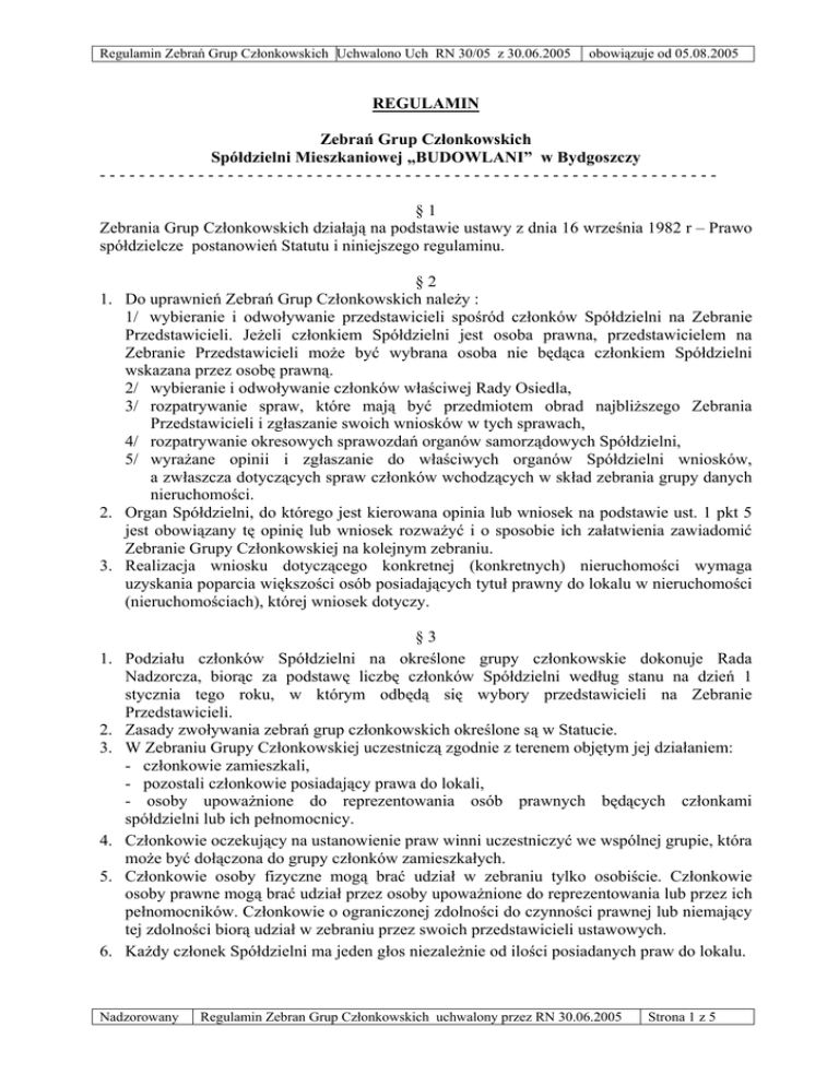 Regulamin Zebrań Grup Członkowskich Uchwalono Uch RN 30/05 z 30.06.2005 obowiązuje od 05.08.2005 REGULAMIN Zebrań Grup Członkowskich Spółdzielni Mieszkaniowej „BUDOWLANI” w Bydgoszczy --------------------------------------------------------------§1 Zebrania Grup Członkowskich działają na podstawie ustawy z dnia 16 września 1982 r – Prawo spółdzielcze postanowień Statutu i niniejszego regulaminu. §2 1. Do uprawnień Zebrań Grup Członkowskich należy : 1/ wybieranie i odwoływanie przedstawicieli spośród członków Spółdzielni na Zebranie Przedstawicieli. Jeżeli członkiem Spółdzielni jest osoba prawna, przedstawicielem na Zebranie Przedstawicieli może być wybrana osoba nie będąca członkiem Spółdzielni wskazana przez osobę prawną. 2/ wybieranie i odwoływanie członków właściwej Rady Osiedla, 3/ rozpatrywanie spraw, które mają być przedmiotem obrad najbliższego Zebrania Przedstawicieli i zgłaszanie swoich wniosków w tych sprawach, 4/ rozpatrywanie okresowych sprawozdań organów samorządowych Spółdzielni, 5/ wyrażane opinii i zgłaszanie do właściwych organów Spółdzielni wniosków, a zwłaszcza dotyczących spraw członków wchodzących w skład zebrania grupy danych nieruchomości. 2. Organ Spółdzielni, do którego jest kierowana opinia lub wniosek na podstawie ust. 1 pkt 5 jest obowiązany tę opinię lub wniosek rozważyć i o sposobie ich załatwienia zawiadomić Zebranie Grupy Członkowskiej na kolejnym zebraniu. 3. Realizacja wniosku dotyczącego konkretnej (konkretnych) nieruchomości wymaga uzyskania poparcia większości osób posiadających tytuł prawny do lokalu w nieruchomości (nieruchomościach), której wniosek dotyczy. 1. 2. 3. 4. 5. 6. §3 Podziału członków Spółdzielni na określone grupy członkowskie dokonuje Rada Nadzorcza, biorąc za podstawę liczbę członków Spółdzielni według stanu na dzień 1 stycznia tego roku, w którym odbędą się wybory przedstawicieli na Zebranie Przedstawicieli. Zasady zwoływania zebrań grup członkowskich określone są w Statucie. W Zebraniu Grupy Członkowskiej uczestniczą zgodnie z terenem objętym jej działaniem: - członkowie zamieszkali, - pozostali członkowie posiadający prawa do lokali, - osoby upoważnione do reprezentowania osób prawnych będących członkami spółdzielni lub ich pełnomocnicy. Członkowie oczekujący na ustanowienie praw winni uczestniczyć we wspólnej grupie, która może być dołączona do grupy członków zamieszkałych. Członkowie osoby fizyczne mogą brać udział w zebraniu tylko osobiście. Członkowie osoby prawne mogą brać udział przez osoby upoważnione do reprezentowania lub przez ich pełnomocników. Członkowie o ograniczonej zdolności do czynności prawnej lub niemający tej zdolności biorą udział w zebraniu przez swoich przedstawicieli ustawowych. Każdy członek Spółdzielni ma jeden głos niezależnie od ilości posiadanych praw do lokalu. Nadzorowany Regulamin Zebran Grup Członkowskich uchwalony przez RN 30.06.2005 Strona 1 z 5 Regulamin Zebrań Grup Członkowskich Uchwalono Uch RN 30/05 z 30.06.2005 obowiązuje od 05.08.2005 7. Członek, który posiada prawo do więcej niż jednego lokalu i lokale te położone są na terenie działania więcej niż jednej grupy członkowskiej, wybiera jedną z grup, w której uczestniczy z prawem głosu i prawem kandydowania do organów Spółdzielni. 8. W Zebraniu Grupy Członkowskiej mają prawo uczestniczenia członkowie Rady Nadzorczej, Zarządu, Rady Osiedla oraz zaproszeni goście. §4 1. Zebranie Grupy Członkowskiej otwiera członek Rady Nadzorczej wybrany przez Radę Nadzorczą oraz przeprowadza wybory prezydium zebrania w składzie: przewodniczący, zastępca przewodniczącego i sekretarz zebrania. §5 1. Zebranie Grupy Członkowskiej powołuje w miarę potrzeby : 1/ Komisję Wyborczą w składzie 2-3 osób dla wykonania czynności związanych z obsługą głosowania a w szczególności : a/ ustalenia alfabetycznej listy kandydatów na przedstawicieli na Zebranie Przedstawicieli lub do Rady Osiedla, b/ dokonania obliczenia wyników głosowania i ogłoszenia tych wyników, c/ wykonywania innych czynności związanych z przeprowadzeniem głosowania. 2/ Komisję Wnioskową w składzie 2-3 osób, której zadaniem jest opracowanie wniosków zgłoszonych przez członków. 2. Każda komisja wybiera ze swego grona przewodniczącego i sekretarza. 3. Komisja spisuje protokół ze swej czynności. Przewodniczący komisji składa Zebraniu Grupy Członkowskiej sprawozdanie z czynności komisji a następnie protokół podpisany przez członków komisji przekazuje sekretarzowi zebrania. §6 1. Po przedstawieniu spraw zamieszczonych w porządku obrad, przewodniczący zebrania otwiera dyskusję, udzielając głosu w kolejności zgłaszania się członków danej grupy. 2. Członkom Rady Nadzorczej, Zarządu i Rady Osiedla przysługuje prawo zabierania głosu poza kolejnością. 3. Przewodniczący zebrania ma prawo zwrócić uwagę mówcy, który odbiega od tematu dyskusji lub przekracza czas ustalony dla przemówień. Nie stosującym się do uwag przewodniczący może odebrać głos. 4. W sprawach formalnych przewodniczący udziela głosu poza kolejnością. Za sprawy formalne uważa się wnioski w przedmiocie sposobu obradowania i głosowania, a w szczególności dotyczące : a/ przerwania dyskusji, b/ ograniczenia czasu przemówień, zamknięcia listy mówców, c/ zarządzenia przerwy w obradach, d/ kolejności i sposobu uchwalania wniosków. W dyskusji nad wnioskami w sprawach formalnych mogą zabierać głos jedynie dwaj mówcy – jeden za i jeden przeciw wnioskowi. 5. Wnioski, a także oświadczenia do protokółu mogą być zgłaszane ustnie. Na żądanie przewodniczącego wnioski i oświadczenia składać należy na piśmie. Przewodniczący może zarządzić zgłaszanie wniosków do Komisji Wnioskowej w ustalonym czasie. 6. Po zamknięciu dyskusji przewodniczący zebran