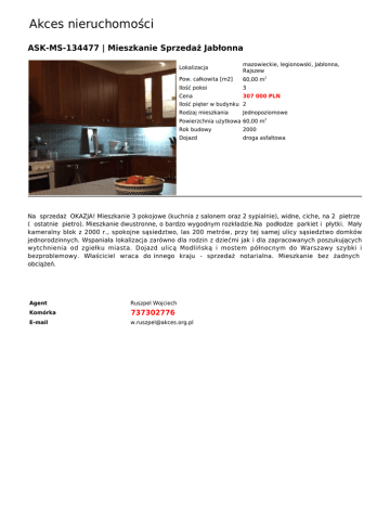 Akces nieruchomości ASK-MS-134477 | Mieszkanie Sprzedaż Jabłonna Lokalizacja mazowieckie, legionowski, Jabłonna, Rajszew Pow. całkowita [m2] 60,00 m2 Ilość pokoi 3 Cena 307 000 PLN Ilość pięter w budynku 2 Rodzaj mieszkania Jednopoziomowe Powierzchnia użytkowa 60,00 m2 Rok budowy 2000 Dojazd droga asfaltowa Na sprzedaż OKAZJA! Mieszkanie 3 pokojowe (kuchnia z salonem oraz 2 sypialnie), widne, ciche, na 2 pietrze ( ostatnie pietro). Mieszkanie dwustronne, o bardzo wygodnym rozkładzie.Na podłodze parkiet i płytki. Mały kameralny blok z 2000 r., spokojne sąsiedztwo, las 200 metrów, przy tej samej ulicy sąsiedztwo domków jednorodzinnych. Wspaniała lokalizacja zarówno dla rodzin z dziećmi jak i dla zapracowanych poszukujących wytchnienia od zgiełku miasta. Dojazd ulicą Modlińską i mostem północnym do Warszawy szybki i bezproblemowy. Właściciel wraca do innego kraju - sprzedaż notarialna. Mieszkanie bez żadnych obciążeń. Agent Ruszpel Wojciech Komórka 737302776 E-mail [email protected]