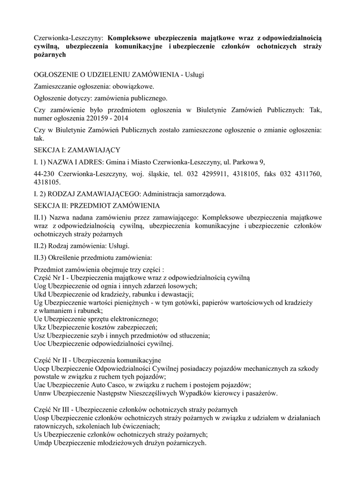 Czerwionka-Leszczyny: Kompleksowe ubezpieczenia majątkowe wraz z odpowiedzialnością cywilną, ubezpieczenia komunikacyjne i ubezpieczenie członków ochotniczych straży pożarnych OGŁOSZENIE O UDZIELENIU ZAMÓWIENIA - Usługi Zamieszczanie ogłoszenia: obowiązkowe. Ogłoszenie dotyczy: zamówienia publicznego. Czy zamówienie było przedmiotem ogłoszenia w Biuletynie Zamówień Publicznych: Tak, numer ogłoszenia 220159 - 2014 Czy w Biuletynie Zamówień Publicznych zostało zamieszczone ogłoszenie o zmianie ogłoszenia: tak. SEKCJA I: ZAMAWIAJĄCY I. 1) NAZWA I ADRES: Gmina i Miasto Czerwionka-Leszczyny, ul. Parkowa 9, 44-230 Czerwionka-Leszczyny, woj. śląskie, tel. 032 4295911, 4318105, faks 032 4311760, 4318105. I. 2) RODZAJ ZAMAWIAJĄCEGO: Administracja samorządowa. SEKCJA II: PRZEDMIOT ZAMÓWIENIA II.1) Nazwa nadana zamówieniu przez zamawiającego: Kompleksowe ubezpieczenia majątkowe wraz z odpowiedzialnością cywilną, ubezpieczenia komunikacyjne i ubezpieczenie członków ochotniczych straży pożarnych II.2) Rodzaj zamówienia: Usługi. II.3) Określenie przedmiotu zamówienia: Przedmiot zamówienia obejmuje trzy części : Część Nr I - Ubezpieczenia majątkowe wraz z odpowiedzialnością cywilną Uog Ubezpieczenie od ognia i innych zdarzeń losowych; Ukd Ubezpieczenie od kradzieży, rabunku i dewastacji; Ug Ubezpieczenie wartości pieniężnych - w tym gotówki, papierów wartościowych od kradzieży z włamaniem i rabunek; Ue Ubezpieczenie sprzętu elektronicznego; Ukz Ubezpieczenie kosztów zabezpieczeń; Usz Ubezpieczenie szyb i innych przedmiotów od stłuczenia; Uoc Ubezpieczenie odpowiedzialności cywilnej. Część Nr II - Ubezpieczenia komunikacyjne Uocp Ubezpieczenie Odpowiedzialności Cywilnej posiadaczy pojazdów mechanicznych za szkody powstałe w związku z ruchem tych pojazdów; Uac Ubezpieczenie Auto Casco, w związku z ruchem i postojem pojazdów; Unnw Ubezpieczenie Następstw Nieszczęśliwych Wypadków kierowcy i pasażerów. Część Nr III - Ubezpieczenie członków ochotniczych straży pożarnych Uosp Ubezpieczenie członków ochotniczych straży pożarnych w związku z udziałem w działaniach ratowniczych, szkoleniach lub ćwiczeniach; Us Ubezpieczenie członków ochotniczych straży pożarnych; Umdp Ubezpieczenie młodzieżowych drużyn pożarniczych. II.4) Wspólny Słownik Zamówień (CPV): 66.51.00.00-8, 66.51.21.00-3, 66.51.41.10-0, 66.51.50.00-3, 66.51.51.00-4, 66.51.52.00-5, 66.51.54.00-7, 66.51.60.00-0, 66.51.61.00-1, 66.51.64.00-4 SEKCJA III: PROCEDURA III.1) TRYB UDZIELENIA ZAMÓWIENIA: Przetarg nieograniczony III.2) INFORMACJE ADMINISTRACYJNE Zamówienie dotyczy projektu/programu finansowanego ze środków Unii Europejskiej: nie SEKCJA IV: UDZIELENIE ZAMÓWIENIA Część NR: 1 Nazwa: Ubezpieczenia majątkowe wraz z odpowiedzialnością cywilną IV.1) DATA UDZIELENIA ZAMÓWIENIA: 28.11.2014 IV.2) LICZBA OTRZYMANYCH OFERT: 2 IV.3) LICZBA ODRZUCONYCH OFERT: 0 IV.4) NAZWA I ADRES WYKONAWCY, KTÓREMU UDZIELONO ZAMÓWIENIA: Towarzystwo Ubezpieczeń i Reasekuracji „WARTA” S.A. Centrum Obsługi Klientów Korporacyjnych z siedzibą w Katowicach, ul. Chmielna 85/87, 00-805 Warszawa IV.5) Szacunkowa wartość zamówienia (bez VAT): 264 000,00 PLN. IV.6) INFORMACJA O CENIE WYBRANEJ OFERTY ORAZ O OFERTACH Z NAJNIŻSZĄ I NAJWYŻSZĄ CENĄ Cena wybranej oferty: 119 522,00 Oferta z najniższą ceną: 119 522,00 / Oferta z najwyższą ceną: 133 531,00 Waluta: PLN. Część NR: 2 Nazwa: Ubezpieczenia komunikacyjne IV.1) DATA UDZIELENIA ZAMÓWIENIA: 28.11.2014 IV.2) LICZBA OTRZYMANYCH OFERT: 3 IV.3) LICZBA ODRZUCONYCH OFERT: 1 IV.4) NAZWA I ADRES WYKONAWCY, KTÓREMU UDZIELONO ZAMÓWIENIA: CONCORDIA POLSKA Towarzystwo Ubezpieczeń Wzajemnych Oddział Katowice, 40-923 Katowice, ul. Mickiewicza 29 IV.5) Szacunkowa wartość zamówienia (bez VAT): 84 000 PLN. IV.6) INFORMACJA O CENIE WYBRANEJ OFERTY ORAZ O OFERTACH Z NAJNIŻSZĄ I NAJWYŻSZĄ CENĄ Cena wybranej oferty: 33 251,00 Oferta z najniższą ceną: 33 251,00 / Oferta z najwyższą ceną: 44 507,00 Waluta: PLN. Część NR: 3 Nazwa: Ubezpieczenie członków ochotniczych straży pożarnych IV.1) DATA UDZIELENIA ZAMÓWIENIA: 28.11.2014 IV.2) LICZBA OTRZYMANYCH OFERT: 2 IV.3) LICZBA ODRZUCONYCH OFERT: 1 IV.4) NAZWA I ADRES WYKONAWCY, KTÓREMU UDZIELONO ZAMÓWIENIA: CONCORDIA POLSKA Towarzystwo Ubezpieczeń Wzajemnych Oddział Katowice, 40-923 Katowice, ul. Mickiewicza 29 IV.5) Szacunkowa wartość zamówienia (bez VAT): 24 000,00 PLN. IV.6) INFORMACJA O CENIE WYBRANEJ OFERTY ORAZ O OFERTACH Z NAJNIŻSZĄ I NAJWYŻSZĄ CENĄ Cena wybranej oferty: 11 000,00 Oferta z najniższą ceną: 11 000,00 / Oferta z najwyższą ceną: 13 206 ,00 Waluta: PLN. Niniejsze ogłoszenie o udzieleniu zamówienia zostało zamieszczone w Biuletynie Zamówień Publicznych w dniu 2.12.2014 r.