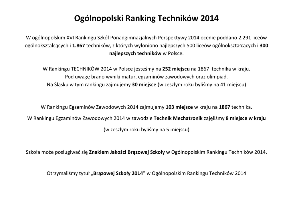 Ogólnopolski Ranking Techników 2014 W ogólnopolskim XVI Rankingu Szkół Ponadgimnazjalnych Perspektywy 2014 ocenie poddano 2.291 liceów ogólnokształcących i 1.867 techników, z których wyłoniono najlepszych 500 liceów ogólnokształcących i 300 najlepszych techników w Polsce. W Rankingu TECHNIKÓW 2014 w Polsce jesteśmy na 252 miejscu na 1867 technika w kraju. Pod uwagę brano wyniki matur, egzaminów zawodowych oraz olimpiad. Na Śląsku w tym rankingu zajmujemy 30 miejsce (w zeszłym roku byliśmy na 41 miejscu) W Rankingu Egzaminów Zawodowych 2014 zajmujemy 103 miejsce w kraju na 1867 technika. W Rankingu Egzaminów Zawodowych 2014 w zawodzie Technik Mechatronik zajęliśmy 8 miejsce w kraju (w zeszłym roku byliśmy na 5 miejscu) Szkoła może posługiwać się Znakiem Jakości Brązowej Szkoły w Ogólnopolskim Rankingu Techników 2014. Otrzymaliśmy tytuł „Brązowej Szkoły 2014” w Ogólnopolskim Rankingu Techników 2014