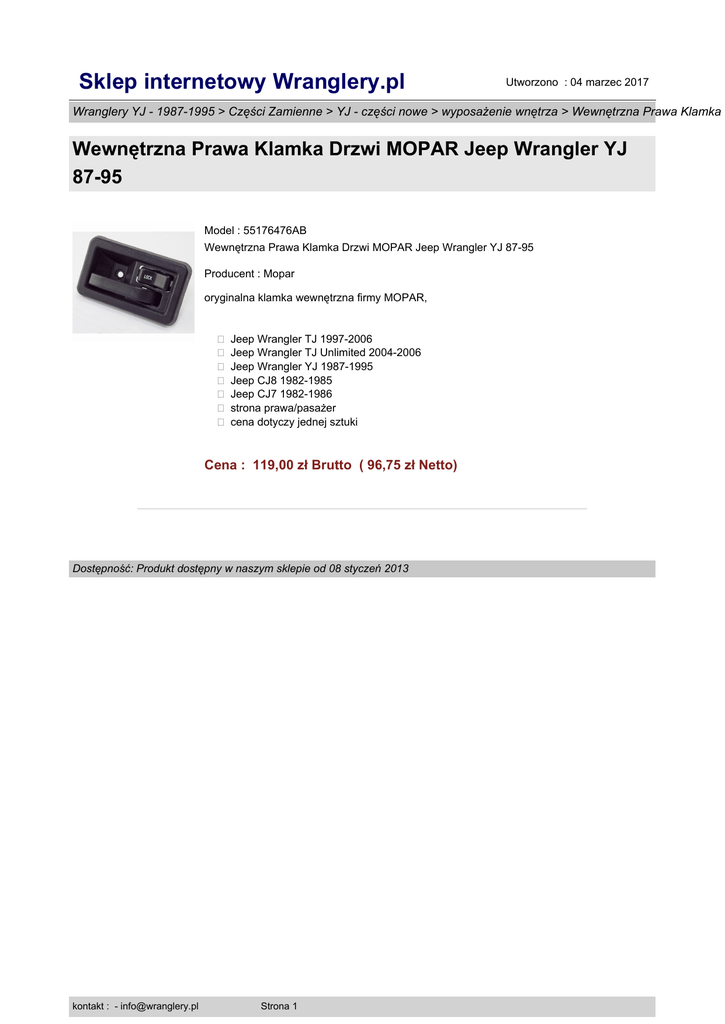 Sklep internetowy Wranglery.pl Utworzono : 04 marzec 2017 Wranglery YJ - 1987-1995 > Części Zamienne > YJ - części nowe > wyposażenie wnętrza > Wewnętrzna Prawa Klamka D Wewnętrzna Prawa Klamka Drzwi MOPAR Jeep Wrangler YJ 87-95 Model : 55176476AB Wewnętrzna Prawa Klamka Drzwi MOPAR Jeep Wrangler YJ 87-95 Producent : Mopar oryginalna klamka wewnętrzna firmy MOPAR, � Jeep Wrangler TJ 1997-2006 � Jeep Wrangler TJ Unlimited 2004-2006 � Jeep Wrangler YJ 1987-1995 � Jeep CJ8 1982-1985 � Jeep CJ7 1982-1986 � strona prawa/pasażer � cena dotyczy jednej sztuki Cena : 119,00 zł Brutto ( 96,75 zł Netto) Dostępność: Produkt dostępny w naszym sklepie od 08 styczeń 2013 kontakt : - [email protected] Strona 1