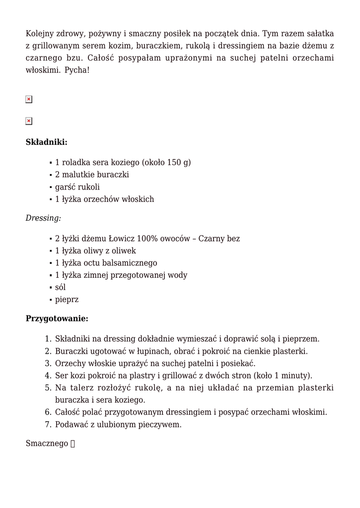 Kolejny zdrowy, pożywny i smaczny posiłek na początek dnia. Tym razem sałatka z grillowanym serem kozim, buraczkiem, rukolą i dressingiem na bazie dżemu z czarnego bzu. Całość posypałam uprażonymi na suchej patelni orzechami włoskimi. Pycha! Składniki: 1 roladka sera koziego (około 150 g) 2 malutkie buraczki garść rukoli 1 łyżka orzechów włoskich Dressing: 2 łyżki dżemu Łowicz 100% owoców – Czarny bez 1 łyżka oliwy z oliwek 1 łyżka octu balsamicznego 1 łyżka zimnej przegotowanej wody sól pieprz Przygotowanie: 1. 2. 3. 4. 5. Składniki na dressing dokładnie wymieszać i doprawić solą i pieprzem. Buraczki ugotować w łupinach, obrać i pokroić na cienkie plasterki. Orzechy włoskie uprażyć na suchej patelni i posiekać. Ser kozi pokroić na plastry i grillować z dwóch stron (koło 1 minuty). Na talerz rozłożyć rukolę, a na niej układać na przemian plasterki buraczka i sera koziego. 6. Całość polać przygotowanym dressingiem i posypać orzechami włoskimi. 7. Podawać z ulubionym pieczywem. Smacznego Dzisiaj przepis na zdrowe i pyszne śniadanie. Jaglanka z uprażonymi na suchej patelni orzechami pekan i mielonym młodym jęczmieniem, zawierającym naturalne substancje przeciwutleniające, bogatym w witaminy i składniki mineralne, a przy okazji nadającym potrawie delikatnego odcienia zieleni Jaglankę podałam z niezwykle zdrowym dżemem z czarnego bzu, znanym z leczniczych właściwości, który wspomaga procesy obronne organizmu. Spróbujcie Składniki: 2 szklanki mleka 1/2 szklanki kaszy jaglanej 1/4 szklanki orzechów pekan 1 pełna łyżeczka młodego jęczmienia około 2 łyżek miodu dżem Łowicz 100% owoców – Czarny Bez Przygotowanie: Orzechy pekan uprażyć na suchej patelni i bardzo drobno posiekać (lub zmielić). Kaszę jaglaną dokładnie opłukać gorącą wodą i przełożyć do garnka. Wlać mleko i zagotować. Ustawić najmniejszy ogień i gotować pod przykryciem około 15 minut, od czasu do czasu mieszając. Następnie dodać miód, młody jęczmień i posiekane orzechy pekan. Dokładnie wymieszać i przełożyć do miseczek. Na wierzch położyć po łyżce dżemu z czarnego bzu. Podawać od razu. Smacznego Prosta pasta na kanapki z ugotowanej ciecierzycy i twarogu z dodatkiem czosnku, odrobiny limonki, oleju sezamowego i świeżej kolendry. To alternatywa dla pasztetów i różnego rodzaju innych smarowideł. Zdrowa, smaczna i bezmięsna. Spróbujcie Składniki: 1 szklanka ugotowanej ciecierzycy 140 g twarogu 1 ząbek czosnku 1/4 szklanki przegotowanej zimnej wody 1,5 łyżki soku z limonki 1 łyżeczka oleju sezamowego 1 łyżka posiekanej kolendry sól pieprz Przygotowanie: Wszystkie składniki oprócz kolendry zmiksować. Dodać posiekaną kolendrę, wymieszać i doprawić solą i pieprzem. W razie potrzeby dodać odrobinę wody więcej. Smacznego Pasta z twarogu, świeżej mięty, bazylii z odrobiną czosnku zapewne urozmaici każde śniadanie. Mając pod ręką świeże zioła można wyczarować pyszny dodatek na kanapki Składniki: 250 g twarogu garstka listków mięty 2 garstki listków bazylii 1/2 ząbka czosnku 1 łyżka majonezu sól pieprz Przygotowanie: Twaróg, miętę, bazylię i przeciśnięty przez praskę czosnek zmiksować. Dodać majonez i wymieszać . Doprawić solą i pieprzem. Smacznego Naleśniki z prażonymi jabłkami, serkiem naturalnym „Apetina” i świeżą miętą to pyszny pomysł na deser lub słodki obiad. Połączenie jabłko-mięta tworzy niepowtarzalny duet, który idealnie ze sobą współgra. Najlepiej użyć jabłek twardych i słodko-kwaśnych np. jonagold lub szara reneta. Polecam Składniki: Naleśniki: 2 jajka 1 szklanka mąki (niepełna) 3/4 szklanki mleka 1/3 szklanki wody 1 łyżka domowego cukru waniliowego 2 łyżki roztopionego masła lub oleju roślinnego szczypta soli Nadzienie: 3 duże jabłka 1 serek naturalny „Apetina” 3 łyżki posiekanej mięty 3 łyżki domowego cukru waniliowego Przygotowanie: Naleśniki: Wszystkie składniki dokładnie miksujemy i odstawiamy na około 20 minut aby ciasto odpoczęło. Jeśli chcemy grubsze naleśniki, dodajemy trochę mąki więcej. Patelnie teflonową rozgrzewamy (można ją delikatnie natłuścić) i wlewamy porcję ciasta podnosząc i kręcąc patelnią tak, aby ciasto pokryło cienką warstwą dno. Smażymy z dwóch stron na średnim ogniu. Nadzienie: Jabłka obieramy, usuwamy gniazda nasienne i kroimy w kosteczkę. Przekładamy na patelnię, dodajemy domowy cukier waniliowy, mieszamy i przykrywamy pokrywką. Smażymy na małym ogniu, aż zmiękną ale nadal będą jędrne (kilka minut, w zależności od gatunku jabłek). Gdy będą prawie gotowe, zdejmujemy pokrywkę aby nadmiar soku odparował. Gotowe jabłka łączymy z serkiem „Apetina”, posiekaną miętą i mieszamy. Ewentualnie dodajemy więcej cukru. Przygotowanym farszem nadziewamy naleśniki. Smacznego Pyszne placuszki z truskawkami, posypane cukrem pudrem. Zamiast truskawek można użyć innych, ulubionych owoców np. jagód. Polecam Składniki na (około 13 placuszków): 1 i 1/2 szklanki mąki 200 g jogurtu naturalnego 1/3 szklanki mleka 2 jajka 2 łyżki cukru 1 płaska łyżka cukru waniliowego 1 łyżeczka proszku do pieczenia 1 łyżeczka sody oczyszczonej 2 łyżki oleju rzepakowego szczypta soli około 400 g truskawek Przygotowanie: Do miseczki wbić jajka, dodać mleko, jogurt, cukier, szczyptę soli, olej i cukier waniliowy. Wymieszać. Dodać przesianą mąkę, sodę oczyszczoną i proszek do pieczenia. Dokładnie wymieszać do połączenia składników. Na patelni teflonowej rozgrzać 1 łyżkę oleju. Nakładać po jednej łyżce ciasta. Po nałożeniu dołożyć na każdego placuszka 0,5 łyżki ciasta (będą grubsze) i lekko wcisnąć przekrojone na pół truskawki. Smażyć na średnim ogniu, aż będą zrumienione. Następnie ustawić mały ogień i odwrócić placki na drugą stronę. Smażyć do zrumienienia. Po usmażeniu posypać