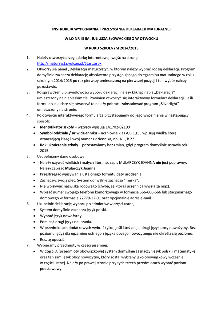 INSTRUKCJA WYPEŁNIANIA I PRZESYŁANIA DEKLARACJI MATURALNEJ W LO NR III IM. JULIUSZA SŁOWACKIEGO W OTWOCKU W ROKU SZKOLNYM 2014/2015 1. 2. 3. 4. 5. 6. 7. Należy otworzyć przeglądarkę internetową i wejść na stronę http://maturzysta.vulcan.pl/Start.aspx Otworzy się panel „Deklaracja maturzysty”, w którym należy wybrać rodzaj deklaracji. Program domyślnie zaznacza deklarację absolwenta przystępującego do egzaminu maturalnego w roku szkolnym 2014/2015 po raz pierwszy umieszczoną na pierwszej pozycji i ten wybór należy pozostawić. Po sprawdzeniu prawidłowości wyboru deklaracji należy kliknąć napis „Deklaracja” umieszczony na niebieskim tle. Powinien otworzyć się interaktywny formularz deklaracji. Jeśli formularz nie chce się otworzyć to należy pobrać i zainstalować program „Silverlight” umieszczony na stronie. Po otwarciu interaktywnego formularza przystępujemy do jego wypełnienia w następujący sposób: Identyfikator szkoły – wszyscy wpisują 141702-02100 Symbol oddziału / nr w dzienniku – uczniowie klas A,B,C,D,E wpisują wielką literę oznaczającą klasę i swój numer z dziennika, np. A 1, B 22. Rok ukończenia szkoły – pozostawiamy bez zmian, gdyż program domyślnie ustawia rok 2015. Uzupełniamy dane osobowe: Należy używać wielkich i małych liter, np. zapis MULARCZYK JOANNA nie jest poprawny. Należy zapisać Mularczyk Joanna. Przestrzegać wpisywania ustalonego formatu daty urodzenia. Zaznaczyć swoją płeć. System domyślnie zaznacza "męska". Nie wpisywać nazwiska rodowego (chyba, że któraś uczennica wyszła za mąż). Wpisać numer swojego telefonu komórkowego w formacie 666-666-666 lub stacjonarnego domowego w formacie 22779-22-01 oraz opcjonalnie adres e-mail. Uzupełnić deklarację wyboru przedmiotów w części ustnej: System domyślnie zaznacza język polski. Wybrać język nowożytny. Pominąć drugi język nauczania. W przedmiotach dodatkowych wybrać tylko, jeśli ktoś zdaje, drugi język obcy nowożytny. Bez poziomu, gdyż dla egzaminu ustnego z języka obcego nowożytnego nie określa się poziomu. Resztę opuścić. Wybieramy przedmioty w części pisemnej: W części A (przedmioty obowiązkowe) system domyślnie zaznaczył język polski i matematykę oraz ten sam język obcy nowożytny, który został wybrany jako obowiązkowy wcześniej w części ustnej. Należy po prawej stronie przy tych trzech przedmiotach wybrać poziom podstawowy. W części B (przedmioty dodatkowe) należy wybrać przynajmniej jeden przedmiot zdawany na poziomie rozszerzonym. W sumie można wybrać do 6-u przedmiotów. Wszystkie przedmioty w tej części zdaje się na poziomie rozszerzonym. Jeśli ktoś ma zamiar zdawać informatykę to obowiązkowo wybiera środowisko komputerowe, programy użytkowe i język programowania. 8. Jeśli ktoś ma opinie lub orzeczenie z poradni, ew. zaświadczenie lekarskie może wystąpić o dostosowanie warunków. Zaznacza to w deklaracji i dostarcza dyrektorowi stosowne dokumenty. 9. Rodzaj deklaracji – pozostawić ustawienia domyślne, czyli wstępna składana do 30 września i zgoda na przetwarzanie danych osobowych. Brak zgody na przetwarzanie danych osobowych jest równoznaczny z rezygnacją przystąpienia do matury. 10. Po dokładnym wprowadzeniu wszystkich danych należy kliknąć ikonę „Akceptuj”. Pokaże się arkusz wypełnionej deklaracji – trzeba całość dokładnie przeczytać i sprawdzić wprowadzone dane. Jeśli zauważymy błędny należy wybrać pierwszy przycisk z lewej strony „Wróć do poprzedniej strony” i dokonać poprawek. Jeżeli wprowadzone dane są prawidłowe to należy kliknąć środkową ikonę „Pobierz plik*.deklaracja” i zapisać ten systemowy plik na twardym dysku swojego komputera. Następnie należy kliknąć ikonę „Pobierz*.pdf” i również zapisać ten plik na twardym dysku komputera. 11. Na dysku komputera zostaną zapisane dwa pliki (systemowy i PDF) o nazwie nazwisko_imię. Nie wolno zmieniać ich nazwy!!! Obydwa pliki należy niezwłocznie przesłać na adres [email protected] 12. Pliki trzeba przesyłać do 30 września 2014 r. Po przesłaniu plików każdy otrzyma drogą elektroniczną potwierdzenie wpłynięcia deklaracji. Deklaracje zostaną wydrukowane przez szkołę w dwóch egzemplarzach i przekazane zdającym do podpisania.