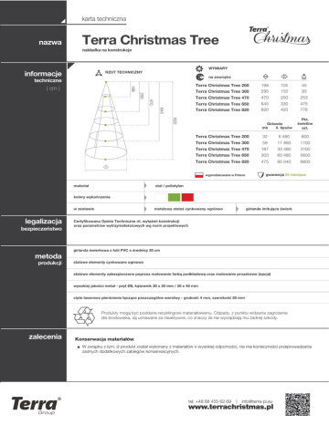 karta techniczna nazwa Terra Christmas Tree nakładka na konstrukcje informacje WYMIARY RZUT TECHNICZNY na zewnątrz techniczne Terra Christmas Tree 200 198 ( cm ) 295 Terra Christmas Tree 300 105 155 45 93 470 645 Terra Christmas Tree 470 470 250 253 Terra Christmas Tree 650 Terra Christmas Tree 820 645 820 330 420 475 776 820 Girlanda mb il. tipsów Pkt. świetlne szt. Terra Christmas Tree 200 32 6 480 600 Terra Christmas Tree 300 59 11 880 1100 Terra Christmas Tree 470 167 33 480 3100 Terra Christmas Tree 650 303 60 480 5600 Terra Christmas Tree 820 475 95 040 8800 wyprodukowane w Polsce materiał 198 295 gwarancja 24 miesiące stal / polietylen kolory wykończenia w zestawie legalizacja bezpieczeństwo metoda produkcji metalowy stelaż cynkowany ogniowo girlanda imitująca świerk Certyfikowana Opinia Techniczna nt. wytężeń konstrukcji oraz parametrów wytrzymałościowych wg norm projektowych girlanda świerkowa z folii PVC o średnicy 30 cm stalowe elementy cynkowane ogniowo stalowe elementy zabezpieczone poprzez malowanie farbą podkładową oraz malowanie proszkowe (opcja) wysokiej jakości metal - pręt Ø8, kątownik 20 x 30 mm / 20 x 40 mm cięte laserowo pierścienie łączące poszczególne warstwy - grubość 4 mm, szerokość 50 mm Produkty mogą być poddane recyklingowi materiałowemu. Odpady, z punktu widzenia zagrożenia dla środowiska, są uznawane za nieaktywne, co znaczy że nie wyrządzają mu żadnej szkody. zalecenia Konserwacja materiałów W związku z tym, iż produkt został wykonany z materiałów o wysokiej odporności, nie ma konieczności przeprowadzania żadnych dodatkowych zabiegów konserwacyjnych. tel: +48 68 455 62 69 | [email protected] Group www.terrachristmas.pl