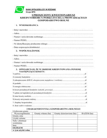 BANK SPÓŁDZIELCZY W RÓŻANIE Grupa BPS UPROSZCZONY KWESTIONARIUSZ KREDYTOBIORCY/PORĘCZYCIELA PROWADZĄCEGO GOSPODARSTWO ROLNE 1. WNIOSKODAWCA - Imię i nazwisko ……………………………………………………………………………… - Adres…………………………………………………………………………………………. - Numer i seria dowodu osobistego……………………………………………………………. - Numer PESEL………………………………………………………………………………… - Nr identyfikacyjny producenta rolnego………………………………………………………. - Data rozpoczęcia działalności………………………………………………………………… 2. WSPÓŁMAŁŻONEK - Imię i nazwisko ……………………………………………………………………………… - Adres…………………………………………………………………………………………. - Numer i seria dowodu osobistego……………………………………………………………. - Numer PESEL………………………………………………………………………………… 3. OŚWIADCZAM, ŻE W OKRESIE KREDYTOWANIA PONIOSĘ NASTĘPUJĄCE KOSZTY: 1) paliwa……………………………………………………………………………………..zł 2) remonty budynków………………………………………………………………………..zł 3) ubezpieczenia (KRUS, ubezpieczenia majątkowe i osobiste)..............................................zł 4) podatki…………………………………………………………………………………….zł 5) energia elektryczna………………………………………………………………………..zł 6) koszt posiadanych kredytów (odsetki, prowizje)………………………………………….zł 7) spłata rat kapitałowych posiadanych kredytów…………………………………………....zł 8) inne koszty osobiste……………………………………………………………………….zł 9) koszty utrzymania rodziny…………………………………………………………………zł 7. Dopłaty bezpośrednie………………………………………………………………………zł 8. Ilość osób w rodzinie………………………………………………………………………. CHARAKTERYSTYKA GOSPODARSTWA ROLNEGO Użytkowane grunty Wyszczególnienie Grunty orne Użytki zielone Sady i plantacje wieloletnie Inne OGÓŁEM w tym użytki rolne Grunty własne (ha) Grunty dzierżawione (ha) RAZEM (ha) Struktura zasiewów w okresie kredytowania: Wyszczególnienie Pow.(ha) Ogółem zboża, w tym: ......................... a/ pszenica ..................... b/ pszenżyto ......................... c/ owies .................................. d/ jęczmień .................................. e/ żyto .................................. f/ kukurydza na ziarno .................................. g/ mieszanki zbożowe .................................. h/ inne ……………….. .............. Ogółem okopowe, w tym: a/ ziemniaki ..................................... b/ buraki cukrowe ..................................... c/warzywa w uprawie ..................................... polowej ..................................... d/ uprawy pod osłonami ..................................... e/ ..................................................................... Inne: a/ rzepak c/ rzepik f/ TUZ(łąki) Rośliny ozdobne i szkółkarstwo: a/…………………….. b/ ……………………. Aktualny stan inwentarza: Wyszczególnienie 1. Ogółem bydło: a/ buhaje b/ krowy c/ jałówki (1-2 lata) d/ byczki (1-2 lata) e/ jałówki (pow. 2 lat) f/ cielęta (do 1 roku) g/………………….. szt. .......................... .......................... .......................... .......................... .......................... .......................... .......................... .......................... ........ 1. Ogółem trzoda chlewna: .......................... a/ maciory .......................... b/ lochy hodowlane .......................... c/ prosięta (do 20 kg) .......................... d/ pozostała trzoda .......................... chlewna .......................... .......................... .......... Drób ……………… a/ kury nioski ……………… b/ brojlery kurze ……………… c/ pozostały drób ……………… Inne: a/ owce ……………… b/ kozy ……………… c/ króliki ……………… ......................... ......................... ................... ……………… ………… MAJĄTEK OSOBISTY KREDYTOBIORCY/PORĘCZYCIELA Posiadane nieruchomości: Rodzaj i adres KW nr Wartość Obciążenia w tys. PLN Ubezpieczenie (tak/nie) Maszyny, urządzenia i środki transportu: Typ maszyny, urządzenia, Rok Wartość samochodu produkcji w tys. PLN Ubezpieczenie Obciążenia (tak/nie) Posiadane rachunki bankowe, lokaty, oszczędności, papiery wartościowe: Nazwa i adres Banku Rodzaj posiadanego rachunku Wartość (np. lokaty) w tys. PLN Inny majątek osobisty (proszę opisać): .................................................................................................................................................................................... . 2 Dochody inne niż wykazane w pkt 1 i 2 (proszę opisać): …………………………………………………………………………………………………... INFORMACJA O ZOBOWIĄZANIACH KREDYTOBIORCY/ PORĘCZYCIELA Kredyty i pożyczki: Kwota pozostała do spłaty Nazwa Banku pożyczkodawcy Ostateczny termin spłaty Prawne zabezpieczenie spłaty Stopa % Udzielone poręczenia i inne zobowiązania: Rodzaj zobowiązania Wartość do zapłaty w tys. PLN Termin zakończenia zobowiązania 4. Ośw