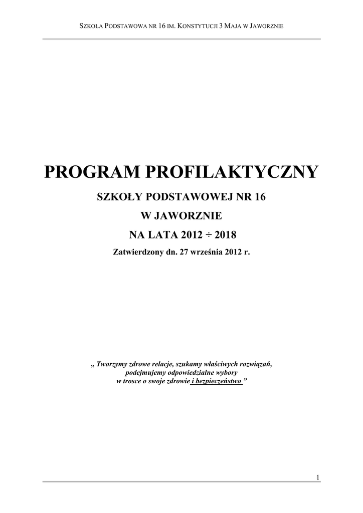 SZKOŁA PODSTAWOWA NR 16 IM. KONSTYTUCJI 3 MAJA W JAWORZNIE PROGRAM PROFILAKTYCZNY SZKOŁY PODSTAWOWEJ NR 16 W JAWORZNIE NA LATA 2012 ÷ 2018 Zatwierdzony dn. 27 września 2012 r. „ Tworzymy zdrowe relacje, szukamy właściwych rozwiązań, podejmujemy odpowiedzialne wybory w trosce o swoje zdrowie i bezpieczeństwo ” 1 SZKOŁA PODSTAWOWA NR 16 IM. KONSTYTUCJI 3 MAJA W JAWORZNIE CELE PROFILAKTYKI Program profilaktyki ma na celu kształtowanie postaw zdrowego i bezpiecznego stylu życia bez potrzeby stosowania używek i agresji, kształtowanie umiejętności życiowych, jak również zapobieganie sytuacjom i zachowaniom problemowym w szkole. Celem programu jest pokazanie uczniom, rodzicom, nauczycielom – jak żyć, aby być zdrowym, jak troszczyć się o siebie i swoje otoczenie, ukazywanie zgubnego wpływu nałogów na organizm oraz zwrócenie uwagi na negatywne skutki zachowań agresywnych, które bezpośrednio wpływają na wiele dziedzin naszego życia. Kształtowanie umiejętności bezpiecznego funkcjonowania w szkole i poza szkołą, w środowisku rodzinnym i społecznym. Wyrabianie umiejętności posługiwania się skuteczną komunikacją. Pomoc i wsparcie dla rodziców, uczniów i nauczycieli w radzeniu sobie z trudnościami występującymi w otoczeniu. Założenia programu są zgodne z: Programem wychowawczym szkoły; Szkolnym zestawem programów nauczania; 2 SZKOŁA PODSTAWOWA NR 16 IM. KONSTYTUCJI 3 MAJA W JAWORZNIE CELE SZCZEGÓŁOWE PROGRAMU PROFILAKTYCZNEGO • BEZPIECZEŃSTWO W RUCHU DROGOWYM Kształtowanie właściwych zachowań w drodze do i ze szkoły Stworzenie możliwości uzyskania karty rowerowej Kształtowanie właściwych zachowań na drodze • ZACHOWANIE W SYTUACJACH ZAGROŻEŃ Kształtowanie umiejętności radzenia sobie w sytuacjach: zagrożenia przeciwpożarowego, zagrożeń w domu, zagrożenia podczas wypoczynku, zagrożeń ze strony innych ludzi, ze strony zwierząt, zagrożeń cywilizacyjnych • PROFILAKTYKA ZDROWOTNA, PROFILAKTYKA UZALEŻNIEŃ Wdrażanie do dbania o higienę osobistą Kształtowanie umiejętności organizowania czasu wolnego Kształtowanie postaw właściwego odżywiania i estetyki spożywania posiłków Kształtowanie nawyku prawidłowej postawy ciała Kształtowanie postaw i sposobów radzenia sobie w sytuacjach bezsilności i stresu Kształtowanie postaw asertywnych i tolerancyjnych pozwalających na zachowanie swojej tożsamości i poczucia własnej wartości, umiejętności rozpoznawania swoich emocji i panowanie nad nimi, budowanie właściwych relacji rówieśniczych, kształtowanie umiejętności rozwiązywania konfliktów Kształtowanie postaw empatii i zaufania, przyjaźni, koleżeństwa, dzielenie się różnymi dobrami z innymi, integracja zespołów klasowych Popularyzacja zdrowego trybu życia Współpraca z rodzicami w obszarze profilaktyki – wczesna interwencja – udzielanie pomocy 3 SZKOŁA PODSTAWOWA NR 16 IM. KONSTYTUCJI 3 MAJA W JAWORZNIE • PRAWO I OBOWIĄZKI Upowszechnianie wśród uczniów znajomości prawa i zasad przestrzegania go Zapobieganie wagarom, dyscyplina na zajęciach szkolnych 4 SZKOŁA PODSTAWOWA NR 16 IM. KONSTYTUCJI 3 MAJA W JAWORZNIE BEZPIECZŃSTWO W RUCHU DROGOWYM Cel szczegółowy Sposób realizacji Odbiorca Odpowiedzialny Terminy Dokumentacja Klasy I Wychowawca Wrzesień Wpisy w dzienniku Kształtowanie 1. Spotkanie z policjantem właściwych zachowań 2. Pogadanki z wychowawcą Klasy I-VI 3. Wycieczki przedmiotowe na Klasy I-III lekcyjnym w drodze do i ze szkoły najbliższe skrzyżowanie Stworzenie 1. Wychowanie komunikacyjne możliwości uzyskania realizowane w ramach zajęć karty rowerowej techniki Klasy IV Nauczyciel techniki Cały rok lekcyjnym 2. Spotkanie z instruktorem prawa Dokumentacja jazdy Maj, czerwiec 3. Egzamin na kartę rowerową Kształtowanie 1. Pogadanki przed wycieczkami właściwych zachowań klasowymi dotyczące zasad na drodze poruszania się na drodze, Wpisy w dzienniku zgodnie z rozporządzeniem Klasy I-VI Wychowawca Cały rok Wpisy w dzienniku lekcyjnym korzystania z komunikacji miejskiej 5 SZKOŁA PODSTAWOWA NR 16 IM. KONSTYTUCJI 3 MAJA W JAWORZNIE ZACHOWANIA W SYTUACJACH ZAGROŻEŃ Cel szczegółowy Sposób realizacji Kształtowanie 1. Pogadanka, właściwych zachowań 2. Notatka w zeszycie w sytuacji alarmu przeciwpożarowego Odbiorca Odpowiedzialny Zagrożenie pożarowe Klasy I - VI Wychowawcy Terminy Raz w semestrze informacyjnym, Dokumentacja Dziennik lekcyjny, Zeszyt informacyjny, Zeszyt przedmiotowy 3. Symulacja alarmu w klasach (zachowanie porządku i dyscypliny), Nauczyciel techniki, 4. Ćwiczenia umiejętności Osoby przekazywania informacji odpowiedzialne za (alarmowanie) o zagrożeniu ewakuację, pożarowym, wychowawcy 5. Zapoznanie uczniów z drogą ewakuacyjną szkoły Zapoznanie uczniów z przyczynami pożarów 1. Prelekcja przedstawiciela straży Wychowawcy Ii semestr Dziennik lekcyjny pożarnej, i sposobami 2. Wycieczka do straży pożarnej, bezpiecznego 3. Wykonanie notesu z reagowania w razie Klasy I-III najważniejszymi numerami I semestr 6 SZKOŁA PODSTAWOWA NR 16 IM. KONSTYTUCJI 3 MAJA W JAWORZNIE pożaru. telefonów: policja, straż, pogotowie Uczeń rozpoznaje 1. Pogadanka, zagrożenia, 2. Projekcja filmu tematycznego Zagrożenie w domu Klasy I - VI Wychowawca Na bieżąco Dziennik lekcyjny Klasy IV-V Nauczyciel techniki Cały rok Dziennik lekcyjny, pt.: „Wypadki w domu” przewiduje skutki nierozsądnych zabaw i nieprawidłowego korzystania z urządzeń gospodarstwa domowego. Uczeń zna zasady 1. Pogadanka posługiwania się 2. Metody poglądowe Zeszyt przedmiotowy urządzeniami elektrycznymi i gazowymi. Umiejętność 1. Pogadanka z higienistką, udzielania pierwszej 2. Wykonanie ulotki „pierwsza pomocy w nagłych wypadkach: omdlenia, krwotoki, Klasy IV-VI Wychowawca pomoc w nagłych wypadkach” 3. Szkolenie uczniów w kierunku udzielania pierwszej pomocy Higienistka Cały rok Dziennik lekcyjny, Zeszyt przedmiotowy Nauczyciel te