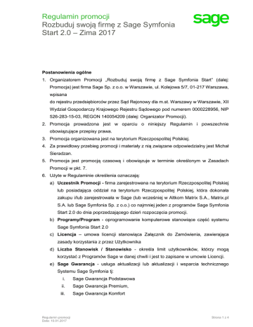 Regulamin promocji Rozbuduj swoją firmę z Sage Symfonia Start 2.0 – Zima 2017 Postanowienia ogólne 1. Organizatorem Promocji „Rozbuduj swoją firmę z Sage Symfonia Start” (dalej: Promocja) jest firma Sage Sp. z o.o. w Warszawie, ul. Kolejowa 5/7, 01-217 Warszawa, wpisana do rejestru przedsiębiorców przez Sąd Rejonowy dla m.st. Warszawy w Warszawie, XII Wydział Gospodarczy Krajowego Rejestru Sądowego pod numerem 0000228956, NIP 526-283-15-03, REGON 140054209 (dalej: Organizator Promocji). 2. Promocja prowadzona jest w oparciu o niniejszy Regulamin i powszechnie obowiązujące przepisy prawa. 3. Promocja organizowana jest na terytorium Rzeczpospolitej Polskiej. 4. Za prawidłowy przebieg promocji i materiały z nią związane odpowiedzialny jest Michał Sieradzan. 5. Promocja jest promocją czasową i obowiązuje w terminie określonym w Zasadach Promocji w pkt. 7. 6. Użyte w Regulaminie określenia oznaczają: a) Uczestnik Promocji - firma zarejestrowana na terytorium Rzeczpospolitej Polskiej lub posiadająca oddział na terytorium Rzeczpospolitej Polskiej, która dokonała zakupu i/lub zarejestrowała w Sage (lub wcześniej w Altkom Matrix S.A., Matrix.pl S.A. lub Sage Symfonia Sp. z o.o.) co najmniej jeden z programów Sage Symfonia Start 2.0 do dnia poprzedzającego dzień rozpoczęcia promocji. b) Programy/Program - oprogramowanie komputerowe stanowiące część systemu Sage Symfonia Start 2.0 c) Licencja – umowa licencji stanowiąca Załącznik do Zamówienia, zawierająca zasady korzystania z przez Użytkownika d) Liczba Stanowisk / Stanowisko - określa limit użytkowników, którzy mogą korzystać z Programów Sage w danej chwili i jest to zapisane w umowie Licencji. e) Sage Gwarancja - usługa aktualizacji lub aktualizacji i wsparcia technicznego Systemu Sage Symfonia tj: i. Sage Gwarancja Podstawowa ii. Sage Gwarancja Premium, iii. Sage Gwarancja Komfort Regulamin promocji Data: 10.01.2017 Strona 1 z 4 f) iv. Sage Gwarancja Prestiż, v. Sage Gwarancja VIP, vi. Sage Gwarancja Podstawowa+, vii. Sage Gwarancja Komfort+, viii. Sage Gwarancja VIP+, System Sage Symfonia Start 2.0- oprogramowanie komputerowe przeznaczone dla małych i średnich przedsiębiorstw, podzielone na moduły główne wraz z usługą Sage Gwarancja tj: Sage Symfonia Start 2.0 Mała Księgowość Sage Symfonia Start 2.0 Handel Sage Symfonia Start 2.0 Faktura Lista aktualnych wersji programów Systemu Symfonia Start 2.0 opublikowana jest na stronach internetowych Sage g) Rozszerzenie - opcja dodatkowa właściwa dla modułu głównego tj. Sage Symfonia e-Box. h) Aktualna cena - cena netto programu lub usługi obowiązująca poza Promocją, wynikająca z cenników produktów i usług Sage zamieszczonych na stronach internetowych Sage. i) Regulamin - oznacza niniejszy regulamin Promocji. Zasady Promocji 7. Promocja obowiązuje w dniach od 10.01.2017 do 28.03.2017 8. Promocja skierowana jest dla obecnych klientów, posiadających licencję programu Sage Symfonia Start 2.0, którzy w Okresie promocyjnym złożą u Organizatora lub sieci Partnerów Sage zamówienie na Programy Sage Symfonia Start 2.0 zgodnie z punktem 9 niniejszego regulaminu. 9. Uczestnik promocji składający Zamówienie: a. Do dnia 24.02.2017 i. na zakup dwóch Programów i/lub Stanowisk oprogramowania Sage Symfonia Start 2.0 otrzyma możliwość zakupu z rabatem wysokości 10% na produkty objęte promocją ii. Przy zakupie trzech Programów i/lub Stanowisk oprogramowania Sage Symfonia Start 2.0 otrzyma możliwość zakupu z rabatem wysokości 15% na produkty objęte promocją Regulamin promocji Data: 10.01.2017 Strona 2 z 4 iii. Przy zakupie czterech Programów i/lub Stanowisk oprogramowania Sage Symfonia Start 2.0 otrzyma możliwość zakupu z rabatem wysokości 20% na produkty objęte promocją b. Do dnia 28.02.2017 i. na zakup dwóch Programów i/lub Stanowisk oprogramowania Sage Symfonia Start 2.0 otrzyma możliwość zakupu z rabatem wysokości 5% na produkty objęte promocją ii. Przy zakupie trzech Programów i/lub Stanowisk oprogramowania Sage Symfonia Start 2.0 otrzyma możliwość zakupu z rabatem wysokości 10% na produkty objęte promocją iii. Przy zakupie czterech Programów i/lub Stanowisk oprogramowania Sage Symfonia Start 2.0 otrzyma możliwość zakupu z rabatem wysokości 15% na produkty objęte promocją 10. Okres trwania i poziom usługi gwarancji jest taki sam jak usługa świadczona dla rozbudowywanego modułu, do którego uczestnik promocji złożył zamówienie zakupu dodatkowego stanowiska. Po roku gwarancja odnawia się na zasadach świadczenia usług abonamentowych Sage i według cennika obowiązującego w dniu odnowienia. 11. Rabaty wymienione w punkcie 9 są udzielane wyłącznie w ramach jednego zamówienia. Postanowienia końcowe 12. Skorzystanie z Promocji oznacza akceptację zasad określonych w niniejszym Regulaminie. 13. Zasady licencjonowania programów określa każdorazowo umowa licencji. 14. Oferty promocyjne nie łączą się z innymi promocjami i rabatami. 15. Promocja nie dotyczy Biur Rachunkowych. 16. Zasady świadczenia Usług abonamentowych Sage zawarte są w odpowiednich regulaminach. Regulaminy świadczenia usług dostępne są odpowiednio na stronie http://www.sage.com.pl/uslugi/regulaminy 17. Z promocji mogą skorzystać Klienci, którzy w Okresie promocyjnym złożą u Organizatora lub sieci Partnerów Sage (lista Partnerów Sage opublikowana jest na stronie internetowej http://www.sage.com.pl/gdzie-kupic) zamówienie na zasadach objętych Promocją. 18. Organizator zastrzega sobie prawo wykluczenia Uczestnika z Promocji ze skutkiem natychmiastowym, w przypadku stwierdzenia naruszenia postanowienia Regulaminu, Regulamin promocji Data: 10.01.2017 Strona 3 z 4 mogącego mieć wpływ na przyznanie rabatu. W takim wypadku Uczestnik promocji będzie zobowiązany do zwrotu przyznanego rabatu. 19. Niniejszy regulamin jest jedynym dokumentem określającym zasady Promocji. 20. Materia