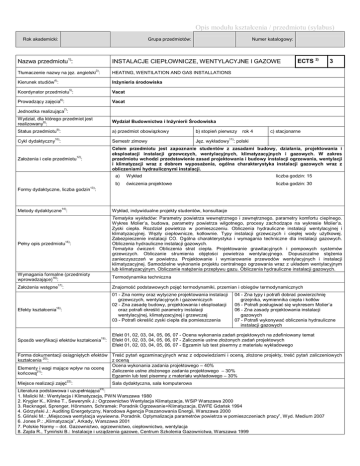 Opis modułu kształcenia / przedmiotu (sylabus) Rok akademicki: Grupa przedmiotów: Nazwa przedmiotu1): Numer katalogowy: INSTALACJE CIEPŁOWNICZE, WENTYLACYJNE I GAZOWE 3) Tłumaczenie nazwy na jęz. angielski : ECTS 2) 3 HEATING, WENTILATION AND GAS INSTALLATIONS 4) Kierunek studiów : Inżynieria środowiska 5) Koordynator przedmiotu : Vacat 6) Prowadzący zajęcia : Vacat 7) Jednostka realizująca : Wydział, dla którego przedmiot jest 8) realizowany : Wydział Budownictwa i Inżynierii Środowiska 9) Status przedmiotu : a) przedmiot obowiązkowy 10) b) stopień pierwszy rok 4 c) stacjonarne 11) Cykl dydaktyczny : Semestr zimowy Założenia i cele przedmiotu : Celem przedmiotu jest zapoznanie studentów z zasadami budowy, działania, projektowania i eksploatacji instalacji grzewczych, wentylacyjnych, klimatyzacyjnych i gazowych. W zakres przedmiotu wchodzi przedstawienie zasad projektowania i budowy instalacji ogrzewania, wentylacji i klimatyzacji wraz z dobrem wyposażenia, ogólna charakterystyka instalacji gazowych wraz z obliczeniami hydraulicznymi instalacji. 12) Jęz. wykładowy : polski a) Wykład liczba godzin: 15 b) ćwiczenia projektowe liczba godzin: 30 13) Formy dydaktyczne, liczba godzin : 14) Metody dydaktyczne : Wykład, indywidualne projekty studentów, konsultacje Pełny opis przedmiotu : Tematyka wykładów: Parametry powietrza wewnętrznego i zewnętrznego, parametry komfortu cieplnego. Wykres Molier’a, budowa, parametry powietrza wilgotnego, procesy zachodzące na wykresie Molier’a. Zyski ciepła. Rozdział powietrza w pomieszczeniu. Obliczenia hydrauliczne instalacji wentylacyjnej i klimatyzacyjnej. Węzły ciepłownicze, kotłownie. Typy instalacji grzewczych i ciepłej wody użytkowej. Zabezpieczenie instalacji CO. Ogólna charakterystyka i wymagania techniczne dla instalacji gazowych. Obliczenia hydrauliczne instalacji gazowych. Tematyka ćwiczeń: Obliczenia strat ciepła. Projektowanie grawitacyjnych i pompowych systemów grzewczych. Obliczanie strumienia objętości powietrza wentylacyjnego. Dopuszczalne stężenia zanieczyszczeń w powietrzu. Projektowanie i wymiarowanie przewodów wentylacyjnych i instalacji klimatyzacyjnej. Samodzielne wykonanie projektu centralnego ogrzewania wraz z układem wentylacyjnym lub klimatyzacyjnym. Obliczanie natężenia przepływu gazu. Obliczenia hydrauliczne instalacji gazowych. Wymagania formalne (przedmioty 16) wprowadzające) : Termodynamika techniczna 15) 17) Założenia wstępne : Znajomość podstawowych pojęć termodynamiki, przemian i obiegów termodynamicznych 01 - Zna normy oraz wytyczne projektowania instalacji grzewczych, wentylacyjnych i gazowniczych 02 - Zna zasadę budowy, projektowania i eksploatacji oraz potrafi określić parametry instalacji wentylacyjnej, klimatyzacyjnej i grzewczej 03 - Potrafi określić zyski ciepła dla pomieszczenia 18) Efekty kształcenia : 19) Sposób weryfikacji efektów kształcenia : 04 - Zna typy i potrafi dobrać powierzchnię grzejnika, wymiennika ciepła i kotłów 05 - Potrafi posługiwać się wykresem Molier’a 06 - Zna zasady projektowania instalacji gazowych 07 - Potrafi wykonywać obliczenia hydrauliczne instalacji gazowych Efekt 01, 02, 03, 04, 05, 06, 07 - Ocena wykonania zadań projektowych na zdefiniowany temat Efekt 01, 02, 03, 04, 05, 06, 07 - Zaliczenie ustne złożonych zadań projektowych Efekt 01, 02, 03, 04, 05, 06, 07 - Egzamin lub test pisemny z materiału wykładowego Forma dokumentacji osiągniętych efektów Treść pytań egzaminacyjnych wraz z odpowiedziami i oceną, złożone projekty, treść pytań zaliczeniowych 20) kształcenia : z oceną Ocena wykonania zadania projektowego – 40% Elementy i wagi mające wpływ na ocenę Zaliczenie ustne złożonego zadania projektowego – 30% 21) końcową : Egzamin lub test pisemny z materiału wykładowego – 30% 22) Miejsce realizacji zajęć : Sala dydaktyczna, sala komputerowa 23) Literatura podstawowa i uzupełniająca : 1. Malicki M.: Wentylacja i Klimatyzacja, PWN Warszawa 1980 2. Krygier K., Klinke T., Sewerynik J.: Ogrzewnictwo Wentylacja Klimatyzacja, WSiP Warszawa 2000 3. Recknagel, Sprenger, Hönmann, Schramek: Poradnik Ogrzewanie+Klimatyzacja, EWFE Gdańsk 1994 4. Górzyński J.: Auditing Energetyczny, Narodowa Agencja Poszanowania Energii, Warszawa 2000 5. Gliński M.: „Miejscowa wentylacja wywiewna. Poradnik. Optymalizacja parametrów powietrza w pomieszczeniach pracy”, Wyd. Medium 2007 6. Jones P.: „Klimatyzacja”, Arkady, Warszawa 2001 7. Polskie Normy – dot. Gazownictwo, ogrzewnictwo, ciepłownictwo, wentylacja 8. Zajda R., Tymiński B.: Instalacje i urządzenia gazowe, Centrum Szkolenia Gazownictwa, Warszawa 1999 24) UWAGI : 25) Wskaźniki ilościowe charakteryzujące moduł/przedmiot : Szacunkowa sumaryczna liczba godzin pracy studenta (kontaktowych i pracy własnej) niezbędna dla osiągnięcia zakładanych efektów 18) 2 kształcenia - na tej podstawie należy wypełnić pole ECTS : 90 h Łączna liczba punktów ECTS, którą student uzyskuje na zajęciach wymagających bezpośredniego udziału nauczycieli akademickich: 1,5 ECTS Łączna liczba punktów ECTS, którą student uzyskuje w ramach zajęć o charakterze praktycznym, takich jak zajęcia laboratoryjne, projektowe, itp.: 2,0 ECTS Tabela zgodności kierunkowych efektów kształcenia efektami przedmiotu Nr /symbol efektu 01 26) Wymienione w wierszu efekty kształcenia: Odniesienie do efektów dla programu kształcenia na kierunku K_W10, K_K01 03 Zna normy oraz wytyczne projektowania instalacji grzewczych, wentylacyjnych i gazowniczych Zna zasadę budowy, projektowania i eksploatacji oraz potrafi określić parametry instalacji wentylacyjnej, klimatyzacyjnej i grzewczej Potrafi określić zyski ciepła dla pomieszczenia 04 Zna typy i potrafi dobrać powierzchnię grzejnika, wymiennika ciepła i kotłów K_U08, K_U17, K_K02 05 Potrafi posługiwać się wykresem h-x K_W10 06 Zna zasady projektowania instalacji gaz