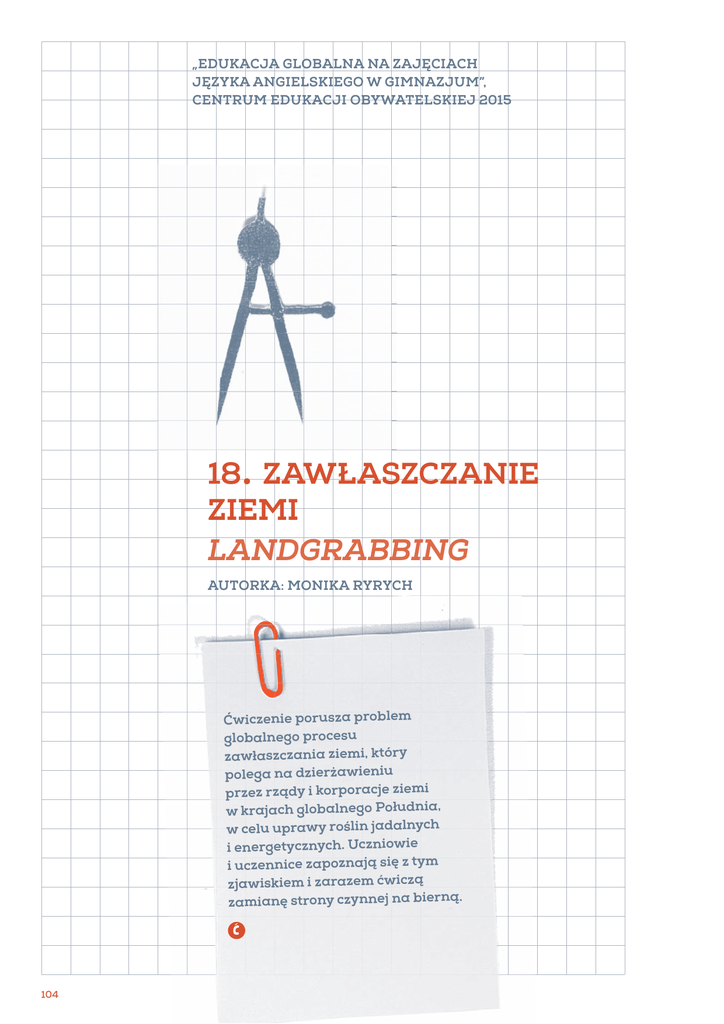 „EDUKACJA GLOBALNA NA ZAJĘCIACH JĘZYKA ANGIELSKIEGO W GIMNAZJUM”, CENTRUM EDUKACJI OBYWATELSKIEJ 2015 18. ZAWŁASZCZANIE ZIEMI LANDGRABBING AUTORKA: MONIKA RYRYCH Ćwiczenie porusza problem globalnego procesu zawłaszczania ziemi, który polega na dzierżawieniu przez rządy i korporacje ziemi w krajach globalnego Południa, w celu uprawy roślin jadalnych i energetycznych. Uczniowie i uczennice zapoznają się z tym zjawiskiem i zarazem ćwiczą zamianę strony czynnej na bierną. Ô 104 18. ZAWŁASZCZANIE ZIEMI LANDGRABBING Zagadnienia Władza polityczna, demokracja i prawa człowieka Pokój i konflikty na świecie Wyjaśnisz przyczyny zawłaszczania ziemi. Poznasz przykłady krajów, w których dochodzi do zawłaszczania ziemi. Czas trwania: 25 minut Zagadnienia językowe: Strona bierna Cele ćwiczenia: Dowiesz się, na czym polega zawłaszczanie ziemi. Związek z podstawą programową: 1.13, 3.3 Środki dydaktyczne i materiały: Załącznik Słownictwo: citizen - obywatel/ka to grab - złapać, zagrabić lease - dzierżawa farmland - ziemia uprawna biofuels - agropaliwa military troops - wojsko 5 0 :5 5 5 5 PRZEBIEG ĆWICZENIA 1. Przypomnij uczniom i uczennicom zasady tworzenia strony biernej. 2. Opowiedz klasie o zawłaszczaniu ziemi, nowym zjawisku globalnym, w którym firmy i rządy państw dzierżawią ziemię w krajach globalnego Południa (landgrabbing). 6?55 5 5 Zawłaszczanie ziemi (landgrabbing) to nowe zjawisko globalne, w którym korporacje i rządy państw dzierżawią ziemię w krajach globalnego Południa. Ziemie są wykorzystywane do uprawy dużych ilości roślin jadalnych i energetycznych (na agropaliwa) przez rządy i firmy, którym tej ziemi braknie. Ziemia jest dzierżawiona zgodnie z prawem, na mocy umów z rządami państw globalnego Połunia i po cenach negocjowanych z tymi państwami. Ponieważ w wielu rejonach świata własność ziemi nie jest prawnie regulowana, często dochodzi do zmuszenia rdzennej ludności do opuszczenia swoich terytoriów, pozbawienia ich ziemi uprawnej i środków do życia. Ludzie muszą migrować, szukać nowych terenów lub osiedlają się w miastach. Zjawisko zawłaszczania ziemi sprawia, że dostęp do wody, gruntów uprawnych, lasów i pastwisk staje się ograniczony, więc bardziej prawdopodobne są konflikty na tym tle. Zawłaszczeniu ziemi sprzyjają takie problemy jak rosnąca liczba ludzi oraz zmiany klimatu, które sprawiają, że ziemia staje się towarem trudno dostępnym, pustynnieje lub jest bardziej zgrożona powodziami. Kolejnym czynnikiem jest popyt na agropaliwa, zintensyfikowany przez regulacje, które miały na celu zastąpienie paliw kopalnych paliwami z roślin. 9?55 5 10 9:55 5 5 3. Rozdaj każdemu kopię karty pracy z ćwiczeniem dotyczącym zawłaszczania ziemi (załącznik nr 1) i poleć uczniom i uczennicom, żeby pracowali w parach lub indywidualnie. Poproś o przeczytanie tekstu i przekształcenie wyróżnionych zdań na stonę bierną. 4.Przecztajcie odpowiedzi na forum klasy. Załącznik: Załącznik nr 1 - Exercise: Landgrabbers Źródła: Publikacja Instytutu Globalnej Odpowiedzialności „Ręce precz”: http://bit.ly/igoreceprecz Artykuł ”Afryka do wynajęcia” Wprost 51-52/2013 (1608): http://bit.ly/afrykadowynajecia 18. ZAWŁASZCZANIE ZIEMI 105 ZAŁĄCZNIK NR 1 – EXERCISE LANDGRABBERS Read the text and transform the sentences and fragments in bold into Passive Voice. In 2013 a Chinese company informed, they will buy 3 million hectares of land in Ukraine. The company wants to grow wheat for the Chinese market. Local farmers didn’t accept selling their land. But a lot of Ukrainian land already was sold to other countries and companies. Why does the Chinese company want to buy land in Ukraine? Chinese government is not able to grow enough food in China, because there are more and more people there, so the country needs to import huge amounts of food. They buy land in Africa, Asia and South America too. When a government or a company buys a lot of land, people who used to live there are forced to move away. Recently in the Omo Valley in Ethiopia, the government has sold majority of farmlands to foreign companies. As a result of this the state forced local farmers to migrate away from their households. Similar situations took place in other parts of Africa, e.g. a British producer of biofuels bought lots of farmlands in Mozambique. This practice is called landgrabbing, because someone claims for themselves the land, which was farmed by local people for generations. In the 1980s companies were buying land in exotic countries to grow spices and fruit. Today they grow basic products: wheat, rice, corn, soy. This is because there are more and more people in the world and because climate change causes more farmland to be too wet or too dry. As a result land becomes more expensive and food prices increase. But some communities protest against landgrabbing. In Madagascar, the president wanted to sell 1,3 million hectares to a corporation from South Korea. People protested and forced their president to release his office. There are more examples in the Philippines or in Argentina. Source: Wprost 51-52/2013 (1608) 106 18. ZAWŁASZCZANIE ZIEMI
