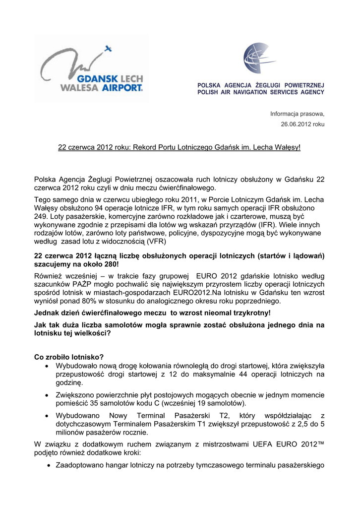 22 czerwca 2012 roku: Rekord Portu Lotniczego Gdańsk im. Lecha Wałęsy!