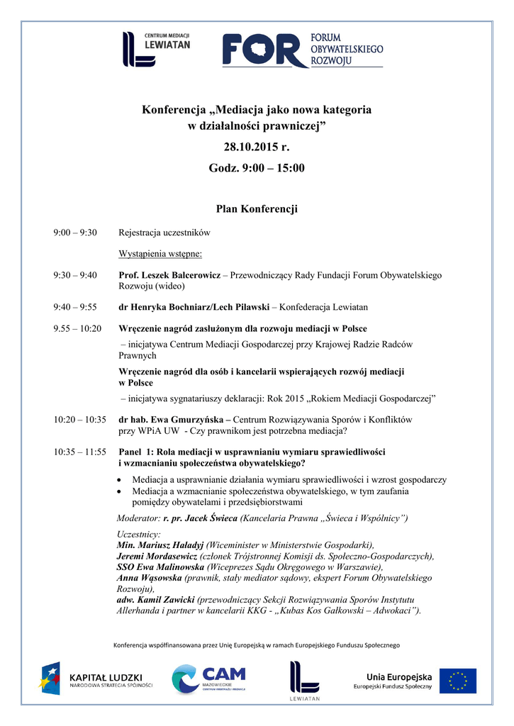Konferencja „Mediacja jako nowa kategoria w działalności prawniczej” 28.10.2015 r. Godz. 9:00 – 15:00 Plan Konferencji 9:00 – 9:30 Rejestracja uczestników Wystąpienia wstępne: 9:30 – 9:40 Prof. Leszek Balcerowicz – Przewodniczący Rady Fundacji Forum Obywatelskiego Rozwoju (wideo) 9:40 – 9:55 dr Henryka Bochniarz/Lech Pilawski – Konfederacja Lewiatan 9.55 – 10:20 Wręczenie nagród zasłużonym dla rozwoju mediacji w Polsce – inicjatywa Centrum Mediacji Gospodarczej przy Krajowej Radzie Radców Prawnych Wręczenie nagród dla osób i kancelarii wspierających rozwój mediacji w Polsce – inicjatywa sygnatariuszy deklaracji: Rok 2015 „Rokiem Mediacji Gospodarczej” 10:20 – 10:35 dr hab. Ewa Gmurzyńska – Centrum Rozwiązywania Sporów i Konfliktów przy WPiA UW - Czy prawnikom jest potrzebna mediacja? 10:35 – 11:55 Panel 1: Rola mediacji w usprawnianiu wymiaru sprawiedliwości i wzmacnianiu społeczeństwa obywatelskiego? Mediacja a usprawnianie działania wymiaru sprawiedliwości i wzrost gospodarczy Mediacja a wzmacnianie społeczeństwa obywatelskiego, w tym zaufania pomiędzy obywatelami i przedsiębiorstwami Moderator: r. pr. Jacek Świeca (Kancelaria Prawna „Świeca i Wspólnicy”) Uczestnicy: Min. Mariusz Haładyj (Wiceminister w Ministerstwie Gospodarki), Jeremi Mordasewicz (członek Trójstronnej Komisji ds. Społeczno-Gospodarczych), SSO Ewa Malinowska (Wiceprezes Sądu Okręgowego w Warszawie), Anna Wąsowska (prawnik, stały mediator sądowy, ekspert Forum Obywatelskiego Rozwoju), adw. Kamil Zawicki (przewodniczący Sekcji Rozwiązywania Sporów Instytutu Allerhanda i partner w kancelarii KKG - „Kubas Kos Gałkowski – Adwokaci”). Konferencja współfinansowana przez Unię Europejską w ramach Europejskiego Funduszu Społecznego 11:55 – 12:10 Przerwa kawowa 12:10 - 12:20 Prezes KRRP Dariusz Sałajewski. 12:20 - 12:30 Prezes Centrum Mediacyjnego przy NRA adw. Katarzyna Przyłuska –Ciszewska 12:30 – 14:00 Panel 2: Mediacja jako nowa kategoria w działalności prawniczej. Moderator: mec. Roman Rewald (Prezes Centrum Mediacji działającego przy Konfederacji Lewiatan) Uczestnicy: Louis B. Buchman (Partner, admitted to the Bars of Paris and New York and to the Dubai International Financial Center courts), Prof. dr. Renate Dendorfer (Prawnik, Arbitrator and Commercial Mediator- Harvard University, FernUni Hagen), Joern Gendner (Senior Legal Bombardier Transportation), Leonardo d’Urso (współwłasciciel ADR Center Roma) , Mauritius Wijffels (adwokat, królewski mediator z Holandii). 14:00 – 14:15 Zakończenie konferencji 14:15 Lunch Partnerzy: Patron medialny: Konferencja współfinansowana przez Unię Europejską w ramach Europejskiego Funduszu Społecznego