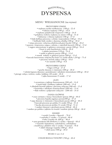 TAURACJA RES DYSPENSA MENU WIELKANOCNE (na wynos) PRZYSTAWKI ZIMNE • wędzona szynka wielkanocna (100 g) - 22 zł • baleron wędzony (100 g) - 18 zł • wędzone polędwiczki wieprzowe (100 g) - 24 zł • polędwica wołowa wędzona na zimno (100 g) - 31 zł • kabanosy z własnej wędzarni (100 g) - 27 zł • biała kiełbasa pieczona z cebulą i majerankiem (100 g) - 18 zł • kiełbaski białe cienkie z duszoną cebulką (100 g) - 20 zł • mięsa pieczone: cielęcina,schab,boczek,pierś kaczki (100 g) - 20 zł • pasztety: wieprzowy,z zająca, z jelenia, z wątróbek kaczych (100 g) - 19 zł • węgorz marynowany w galaretce cytrynowej porcja (200 g) - 34 zł • łosoś w sosie bazyliowym (100 g) - 20 zł • sałatka jarzynowa (150 g) - 14 zł • nóżki w galarecie porcja (200 g) - 13 zł • ozorek wołowy w galarecie porcja (200 g) - 15 zł • kurczak faszerowany cielęciną bez kości (½ sztuki około 1,20 kg) - 75 zł • pieczony mostek cielęcy (100 g) - 18 zł • sos tatarski (100 g) - 8 zł PRZYSTAWKI CIEPŁE • bigos (250 g) - 27 zł • grzyby duszone w śmietanie (200 g) - 20 zł • młoda kapusta duszona z pomidorami i młodymi ziemniakami (200 g) - 20 zł • pierogi: cielęce, wołowe, ruskie, kołduny (20 sztuk) - 20 zł • jajka faszerowane (5 sztuk) - 17 zł ZUPY • szczawiowa z jajkiem faszerowanym (200 ml) - 14 zł • żurek biały z kiełbasą i jajkiem (200 ml) - 19 zł • chłodnik litewski jajkiem i pieczoną cielęciną (200 ml) - 15 zł • botwinka z młodymi ziemniaczkami (200 ml) - 13 zł • flaki wołowe z pulpetami cielęcymi - (200 ml) - 24 zł DANIA GŁÓWNE • zrazy zawijane z kaszą i buraczkami (porcja 200 g) - 40 zł • pieczona łopatka jagnięca porcja(200 g) - 47 zł • zając duszony w śmietanie z buraczkami porcja (200 g) - 48 zł • kurczak pieczony po polsku (½ sztuki 350 g) - 41 zł • kaczka pieczona po polsku (½ sztuki 350 g) - 51 zł • sandacz duszony z grzybami porcja (200 g) - 48 zł • sandacz po polsku z jajkiem na twardo i masłem (porcja 200 g) - 46 zł DESERY • sernik (1sztuka = 8porcji) - 70 zł • szarlotka (1 sztuka = 12 porcji) - 80 zł • keks (1sztuka ok. 600 g) - 80 zł • tarta gruszkowa lub śliwkowa (1 sztuka = 8porcji) - 60 zł • mazurki: kajmakowy, czekoladowy, czekoladowy z konfiturą z płatków róży (1 sztuka = 8 porcji) - 70 zł • chleb własnego wypieku (500 g) - 20 zł • chleb jasny (500 g) - 20 zł BUŁKI (1 szt.) 3 zł CHLEB BEZGLUTENOWY (700 g) - 40 zł