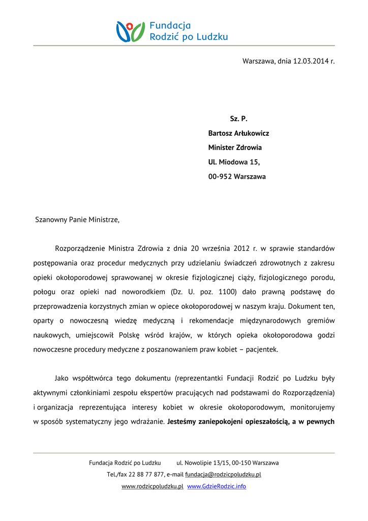 Warszawa, dnia 12.03.2014 r. Sz. P. Bartosz Arłukowicz Minister Zdrowia Ul. Miodowa 15, 00-952 Warszawa Szanowny Panie Ministrze, Rozporządzenie Ministra Zdrowia z dnia 20 września 2012 r. w sprawie standardów postępowania oraz procedur medycznych przy udzielaniu świadczeń zdrowotnych z zakresu opieki okołoporodowej sprawowanej w okresie fizjologicznej ciąży, fizjologicznego porodu, połogu oraz opieki nad noworodkiem (Dz. U. poz. 1100) dało prawną podstawę do przeprowadzenia korzystnych zmian w opiece okołoporodowej w naszym kraju. Dokument ten, oparty o nowoczesną wiedzę medyczną i rekomendacje międzynarodowych gremiów naukowych, umiejscowił Polskę wśród krajów, w których opieka okołoporodowa godzi nowoczesne procedury medyczne z poszanowaniem praw kobiet – pacjentek. Jako współtwórca tego dokumentu (reprezentantki Fundacji Rodzić po Ludzku były aktywnymi członkiniami zespołu ekspertów pracujących nad podstawami do Rozporządzenia) i organizacja reprezentująca interesy kobiet w okresie okołoporodowym, monitorujemy w sposób systematyczny jego wdrażanie. Jesteśmy zaniepokojeni opieszałością, a w pewnych Fundacja Rodzić po Ludzku ul. Nowolipie 13/15, 00-150 Warszawa Tel./fax 22 88 77 877, e-mail [email protected] www.rodzicpoludzku.pl www.GdzieRodzic.info wypadkach wręcz zaniechaniem realizacji wielu zapisów Rozporządzenia. Jeden z nich dotyczy swobodnego wyboru miejsca porodu przez kobietę. W krajach, do których dzięki Rozporządzeniu, ma szansę dołączyć Polska, poród w warunkach pozaszpitalnych jest oczywistym elementem systemu opieki położniczej (Dania, Holandia, Wielka Brytania) i jest refundowany ze środków publicznych. Rozporządzenie z 20 września 2012 roku daje kobietom w Polsce potencjalnie takie same możliwości. Potencjalnie – ponieważ do tej pory nie zostały opracowane prawne regulacje, dzięki którym poród domowy byłby dostępny dla kobiet w ramach powszechnego ubezpieczenia. Ta sytuacja łamie zarówno zapisy Rozporządzenia, jak i Konstytucji RP a także, podpisanej przez Polskę, Konwencji o Ochronie Praw Człowieka i Podstawowych Wolności. Oba te dokumenty podkreślają prawo każdego człowieka do ochrony prawnej życia prywatnego, rodzinnego, czci i dobrego imienia oraz do decydowania o swoim życiu osobistym. W świetle tych zapisów zadaniem państwa jest zapewnienie odpowiednich gwarancji prawnych, realizujących to arbitralne prawo jednostki. Oznacza to więc, że państwo powinno zapewnić przyszłym matkom, według ich wyboru, realną możliwość urodzenia dziecka w warunkach szpitalnych lub pozaszpitalnych. Poród w domu lub w domu narodzin powinien odbywać się na tych samych prawach co poród w szpitalu, wraz z możliwością podejmowania przez rodzącą decyzji związanych z jego przebiegiem. Europejski Trybunał Praw Człowieka, w orzeczeniu z dnia 14 grudnia 2010 r., 67545/09, w wygranej przez Annę Ternovszky sprawie przeciwko państwu węgierskiemu, wskazał jednoznacznie, iż pojęcie „życia prywatnego” obejmuje swoim szerokim zakresem znaczeniowym prawo do poszanowania decyzji o posiadaniu albo nieposiadaniu dziecka, a co za tym idzie, również prawa do podjęcia decyzji o byciu rodzicem i wyboru okoliczności, w których jednostka staje się rodzicem. Okoliczności bowiem, w których dochodzi do porodu, stanowią bezspornie element życia prywatnego. W ww. sprawie ETPC stanął na stanowisku, że Fundacja Rodzić po Ludzku ul. Nowolipie 13/15, 00-150 Warszawa Tel./fax 22 88 77 877, e-mail [email protected] www.rodzicpoludzku.pl www.GdzieRodzic.info w przypadku gdy państwo dokonuje w prawnie regulowanym obszarze wyborów związanych z wykonywaniem prawa do prywatności, powinno zapewnić odpowiednią ochronę tego prawa w ramach regulacji prawnej, w szczególności poprzez zapewnienie dostępności i przewidywalności przepisów w taki sposób, aby jednostki mogły pokierować odpowiednio swoim postępowaniem. Odpowiednia opieka nad kobietą w okresie ciąży, porodu i połogu wpisana w prawo pacjentek do wyboru miejsca porodu (w warunkach szpitalnych lub pozaszpitalnych), będzie w Rzeczpospolitej Polskiej rzeczywista i powszechna tylko wtedy, gdy państwo zapewni na ten cel środki pieniężne, a także zagwarantuje odpowiednie procedury i zaplecze medyczne pozwalające na realizację przepisów prawa. Aktualne realia wywiązywania się państwa z realizacji przedmiotowego prawa nie odpowiadają standardom przestrzegania prawa, co więcej – bezczynność w tym zakresie jest jego łamaniem. Kierując na Pana ręce niniejsze pismo oczekujemy, iż jako Minister Zdrowia podejmie Pan niezwłoczne działania na rzecz pełnego wdrożenia Rozporządzenia z dnia 20 września 2012 roku, tak aby prawo do wyboru miejsca porodu stało się prawem realnym, powszechnym, zaś odpowiednia opieka nad kobietą w okresie porodu była realizowana także w warunkach pozaszpitalnych. W załączeniu przesyłam petycję w sprawie prawa wyboru miejsca do porodu podpisaną przez 612 osób. Z poważaniem, Joanna Pietrusiewicz Fundacja Rodzić po Ludzku ul. Nowolipie 13/15, 00-150 Warszawa Tel./fax 22 88 77 877, e-mail [email protected] www.rodzicpoludzku.pl www.GdzieRodzic.info Petycję poparli min: 1. prof. dr hab. Danuta Hübner 2. dr Barbara Labuda 3. prof. dr hab. Małgorzata Fuszera 4. dr Ewa Osiatyńska -Woydyło 5. prof. dr hab. Eleonora Zielińska 6. prof. UW dr hab. Magdalena Środa 7. dr hab. Monika Płatek 8. Piotr Pacewicz 9. Wanda Nowicka 10. dr Agnieszka Graff 11. Agnieszka Grzybek 12. Marek Zieliński 13. Krystyna Kacpura Fundacja Rodzić po Ludzku ul. Nowolipie 13/15, 00-150 Warszawa Tel./fax 22 88 77 877, e-mail [email protected] www.rodzicpoludzku.pl www.GdzieRodzic.info