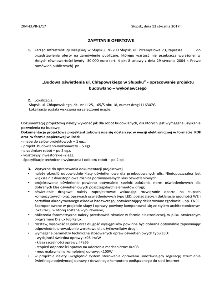ZIM-EI.VII-2/17 Słupsk, dnia 12 stycznia 2017r. ZAPYTANIE OFERTOWE 1. Zarząd Infrastruktury Miejskiej w Słupsku, 76-200 Słupsk, ul. Przemysłowa 73, zaprasza do przedstawienia oferty na zamówienie publiczne, którego wartość nie przekracza wyrażonej w złotych równowartości kwoty 30 000 euro (art. 4 pkt 8 ustawy z dnia 29 stycznia 2004 r. Prawo zamówień publicznych) pn.: ,,Budowa oświetlenia ul. Chłapowskiego w Słupsku” - opracowanie projektu budowlano – wykonawczego 2. Lokalizacja: Słupsk, ul. Chłapowskiego, dz. nr 1125, 165/5 obr. 18, numer drogi 116307G Lokalizacja została wskazana na załączonej mapie. Dokumentację projektową należy wykonać jak dla robót budowlanych, dla których jest wymagane uzyskanie pozwolenia na budowę. Dokumentację projektową projektant zobowiązuje się dostarczyć w wersji elektronicznej w formacie PDF oraz w formie papierowej w ilości: - mapa do celów projektowych – 1 egz. - projekt budowlano-wykonawczy – 5 egz. - przedmiary robót – po 2 egz. - kosztorysy inwestorskie -2 egz. - Specyfikacje techniczne wykonania i odbioru robót – po 2 kpl. 3. Wytyczne do opracowania dokumentacji projektowej • należy określić odpowiednie klasy oświetleniowe dla przebudowanych ulic. Niedopuszczalna jest większa niż dwustopniowa różnica porównywalnych klas oświetleniowych; • projektowane oświetlenie powinno optymalnie spełnić założenia norm oświetleniowych dla dobranych klas oświetleniowych poszczególnych elementów drogi; • oświetlenie drogowe należy zaprojektować wskazując rozwiązanie oparte na słupach kompozytowych oraz oprawach oświetleniowych typu LED, posiadających deklarację zgodności WE i certyfikat akredytowanego ośrodka badawczego, potwierdzający deklarowane zgodności - np. ENEC. Zaproponowane w projekcie słupy i oprawy powinny komponować się ze stylem architektonicznym lokalizacji, w której zostaną wybudowane; • obliczenia fotometryczne należy przedstawić również w formie elektronicznej, w pliku otwieranym programem Dialux lub Relux; • rozstaw, wysokość słupów oraz długość wysięgników powinna być dobrana optymalnie zapewniając odpowiednie prowadzenie wzrokowe dla użytkowników drogi; • wymagane parametry techniczne stosowanych opraw oświetleniowych typu LED: - wydajność świetlna oprawy: >95 lm/W - klasa szczelności oprawy: IP≥65 - stopień odporności oprawy na uderzenia mechaniczne: IK≥08 - moc maksymalna kompletnej oprawy: <100W • w projekcie należy uwzględnić system sterowania oprawami umożliwiający regulację strumienia świetlnego pojedynczej oprawy z dowolnego komputera podłączonego do sieci internet. 4. Termin wykonania zamówienia: 31 maja 2017 r. 5. Projektant musi przedstawić do zatwierdzenia przez Zamawiającego koncepcję projektu. 6. W zakresie warunków udziału w postępowaniu wskazanym w art. 22 ust. 1 ustawy PZP Zamawiający wymaga, aby Wykonawcy wykazali, iż posiadają wiedzę i doświadczenie. Za spełnienie warunku Zamawiający uzna udokumentowanie wykonania, a w przypadku świadczeń okresowych lub ciągłych również wykonywanie usług w okresie ostatnich trzech lat przed upływem terminu składania ofert, a jeżeli okres prowadzenia działalności jest krótszy – w tym okresie, co najmniej jednej usługi polegającej na wykonaniu projektu budowlano - wykonawczego obejmującego oświetlenie odcinka drogi klasy L lub wyższej. W celu oceny spełnienia warunku udziału w postępowaniu w zakresie wiedzy i doświadczenia Zamawiający żąda wykazu wykonanych, a w przypadku świadczeń okresowych lub ciągłych również wykonywanych usług, w okresie ostatnich trzech lat przed upływem terminu składania ofert, a jeżeli okres prowadzenia działalności jest krótszy – w tym okresie, wraz z podaniem ich wartości, przedmiotu, dat wykonaniami podmiotów na rzecz których usługi zostały wykonane oraz załączeniem dowodów, czy zostały wykonane należycie, zgodnie z treścią załącznika nr 2 do zapytania ofertowego. 7. Osoby uprawnione do porozumiewania się z Wykonawcami : • Tomasz Orłowski – Koordynator Działu Eksploatacji i Inwestycji • Michał Świderek – Inspektor Działu Eksploatacji i Inwestycji 8. Porozumiewanie się Wykonawców z uprawnionymi osobami odbywać się może tylko w godzinach od 7:30 do 15:30 w dni powszednie, od poniedziałku do piątku. 9. Oferta musi być sporządzona zgodnie z treścią wzoru formularza oferty i złożona w języku polskim, pismem czytelnym oraz podpisana przez osobę lub osoby uprawnione do składania oświadczeń woli w imieniu wykonawcy. 10. Treść oferty musi odpowiadać treści zapytania ofertowego. 11. Ofertę składa się, pod rygorem nieważności, w formie pisemnej. 12. Ofertę składa się w jednym egzemplarzu. 13. Zamawiający nie dopuszcza możliwości składania ofert drogą elektroniczną. 14. Oferta na formularzu oferty musi być: 1) złożona w opakowaniu nieprzejrzystym, zamkniętym, uniemożliwiającym jej odczytanie przed otwarciem, 2) zaadresowana na Zarząd Infrastruktury Miejskiej w Słupsku, ul. Przemysłowa 73, 76-200 Słupsk, 3) oznaczona nazwą i adresem Wykonawcy składającego ofertę wraz z numerami telefonów oraz opatrzona napisem: Oferta na zamówienie publiczne, którego wartość nie przekracza wyrażonej w złotych równowartości kwoty 30 000 euro na zadanie pn. ,,Budowa oświetlenia ul. Chłapowskiego w Słupsku” - opracowanie projektu budowlano – wykonawczego. Nie otwierać przed dniem 19 stycznia 2017 r. godz. 10.15. 15. Miejsce oraz termin składania ofert i otwarcia ofert: 1) Składanie ofert Ofertę należy złożyć w Zarządzie Infrastruktury Miejskiej w Słupsku, ul. Przemysłowa 73, 76-200 Słupsk - pok. nr 101 (sekretariat) nie później niż do dnia 19 stycznia 2017 r. do godz. 10.00; 2) Wszystkie oferty otrzymane przez Zamawiającego po terminie podanym w ppkt 1) zostaną, bez otwierania niezwłocznie zwrócone Wy