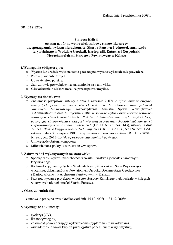 Kalisz, dnia 1 października 2008r. OR.1118-12/08 Starosta Kaliski ogłasza nabór na wolne wieloosobowe stanowisko pracy ds. sporządzania wykazu nieruchomości Skarbu Państwa i jednostek samorządu terytorialnego w Wydziale Geodezji, Kartografii, Katastru i Gospodarki Nieruchomościami Starostwa Powiatowego w Kaliszu 1.Wymagania obligatoryjne: • WyŜsze lub średnie wykształcenie geodezyjne, wyŜsze wykształcenie prawnicze, • Pełnia praw publicznych, • Obywatelstwo polskie, • Stan zdrowia pozwalający na zatrudnienie na stanowisku, • Oświadczenie o niekaralności za przestępstwa umyślne. 2. Wymagania dodatkowe: • Znajomość przepisów: ustawy z dnia 7 września 2007r. o ujawnianiu w księgach wieczystych prawa własności nieruchomości Skarbu Państwa oraz jednostek samorządu terytorialnego, rozporządzenia Ministra Spraw Wewnętrznych i Administracji z dnia 31 stycznia 2008r. w sprawie wykazu oraz wzorów zestawień zbiorczych nieruchomości Skarbu Państwa i jednostek samorządu terytorialnego podlegających ujawnieniu w księgach wieczystych oraz nieruchomości zabudowanych niepozostających w posiadaniu właścicieli (Dz. U. Nr 23, poz. 143), ustawy z dnia 6 lipca 1982r. o księgach wieczystych i hipotece (Dz. U. z 2001r., Nr 124, poz. 1361), ustawy z dnia 21 sierpnia 1997r. o gospodarce nieruchomościami (Dz. U. z 2004r., Nr 261, poz. 2603) kodeksu postępowania administracyjnego, • Umiejętność obsługi komputera, • Mile widziana praktyka w zakresie ww. spraw. 3. Zakres zadań wykonywanych na stanowisku: • Sporządzanie wykazu nieruchomości Skarbu Państwa i jednostek samorządu terytorialnego, • Badanie ksiąg wieczystych w Wydziale Ksiąg Wieczystych Sądu Rejonowego w Kaliszu, dokumentów w Powiatowym Ośrodku Dokumentacji Geodezyjnej i Kartograficznej, w Archiwum Państwowym w Kaliszu, • Przygotowywanie projektów wniosków Starosty Kaliskiego o ujawnienie w księgach wieczystych nieruchomości Skarbu Państwa. 4. Okres zatrudnienia: ● umowa o pracę na czas określony od dnia 15.10.2008r. – 31.12.2008r. 5. Wymagane dokumenty: • • • • Ŝyciorys (CV), list motywacyjny, dokument poświadczający wykształcenie (dyplom lub zaświadczenie), oświadczenie o braku kary za przestępstwa popełnione z winy umyślnej, Wymagane dokumenty aplikacyjne naleŜy składać w Starostwie Powiatowym w Kaliszu pok. 226 w terminie do dnia 14 października 2008r z dopiskiem „Nabór–wykaz nieruchomości” Aplikacje, które wpłyną do Urzędu po wyŜej określonym terminie nie będą rozpatrywane. Informacja o wyniku naboru będzie umieszczona na stronie internetowej Biuletynu Informacji Publicznej (www.bip.powiat.kalisz.pl) oraz na tablicy informacyjnej w Starostwie Powiatowym w Kaliszu. Wymagane dokumenty aplikacyjne: list motywacyjny, CV, powinny być opatrzone klauzulą „WyraŜam zgodę na przetwarzanie moich danych osobowych zawartych w ofercie pracy dla potrzeb niezbędnych do realizacji procesu rekrutacji zgodnie z ustawą z dnia 29.08.1997r. o ochronie danych osobowych (Dz. U. z 2002 Nr 101, poz. 926) oraz ustawą z dnia 22.03.1999r. o pracownikach samorządowych (Dz. U. z 2001r. Nr 142 poz. 1593 z późn. zm.) Zarządzenie Nr 41/2008 Starosty Kaliskiego z dnia 8 sierpnia 2008r. w sprawie przeprowadzenia naboru na trzy wolne wieloosobowe stanowiska pracy ds. sporządzania wykazu nieruchomości Skarbu Państwa i jednostek samorządu terytorialnego w Wydziale Geodezji, Kartografii, Katastru i Gospodarki Nieruchomościami Starostwa Powiatowego w Kaliszu. Na podstawie art. 3a ust. 2 ustawy z dnia 22 marca 1990r. o pracownikach samorządowych (Dz. U z 2001r. Nr 142 poz. 1593 z późn zm.), w związku z § 1 ust. 7 „Systemu zatrudniania pracowników w Starostwie Powiatowym w Kaliszu” stanowiącego załącznik do Zarządzenia Nr 5/2006 Starosty Kaliskiego z dnia 13 lutego 2006r., w sprawie wprowadzenia „ systemu zatrudniania pracowników w Starostwie Powiatowym w Kaliszu” zarządza się, co następuje: §1 Powołuje się komisję w składzie: 1) Andrzej Dolny – Przewodniczący Komisji, 2) Michał Poniatowski – Członek Komisji, 3) Ziemowit Józefiak – Członek Komisji, do przeprowadzenia naboru na trzy wolne wieloosobowe stanowiska pracy ds. sporządzania wykazu nieruchomości Skarbu Państwa i jednostek samorządu terytorialnego w Wydziale Geodezji, Kartografii, Katastru i Gospodarki Nieruchomościami Starostwa Powiatowego w Kaliszu. §2 Komisja ulega rozwiązaniu z dniem zakończenia procedury naboru. §3 Wykonanie zarządzenia powierza się Sekretarzowi Powiatu. §4 Zarządzenie wchodzi w Ŝycie z dniem podpisania. INFORMACJA o wynikach naboru na trzy wolne wieloosobowe stanowiska pracy ds. sporządzania wykazu nieruchomości Skarbu Państwa i jednostek samorządu terytorialnego w Wydziale Geodezji, Kartografii, Katastru i Gospodarki Nieruchomościami Starostwa Powiatowego w Kaliszu 1. W wyniku ogłoszenia o naborze na ww. stanowisko oraz przeprowadzonej rekrutacji zatrudniono: Panią Martę Stasiak Józefina Panią Dominikę Błaszczyk Kalisz Panią Monikę śurawę Kalisz 2. Uzasadnienie wyboru: –Wybór nastąpił w wyniku przeprowadzonego postępowania kwalifikacyjnego w postaci rozmowy kwalifikacyjnej, podczas której wykazały się znajomością oraz prawidłową interpretacją przepisów prawnych niezbędnych do pracy na wyŜej wymienionym stanowisku a takŜe wykształceniem niezbędnym do wykonywania powierzonych czynności. Komisja do przeprowadzenia naboru na wolne stanowisko Kalisz, dnia 26 sierpnia 2008r. PROTOKÓŁ z posiedzenia Komisji do przeprowadzenia naboru na trzy wolne wieloosobowe stanowiska pracy ds. sporządzania wykazu nieruchomości Skarbu Państwa i jednostek samorządu terytorialnego w Wydziale Geodezji, Kartografii, Katastru i Gospodarki Nieruchomościami Starostwa Powiatowego w Kaliszu powołanej Zarządzeniem Nr 41/2008 Starosty Kaliskiego z dnia 8 sierpnia 2008r. dnia 26 sierpnia 2008r.. Komisja 