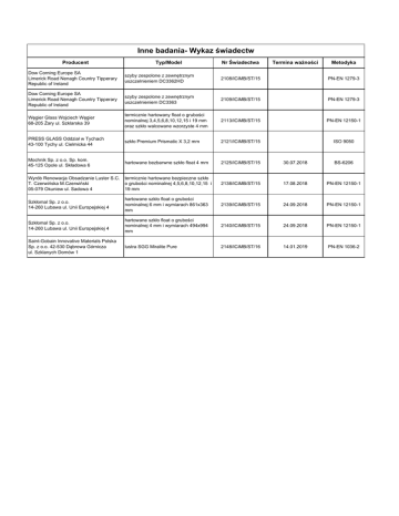 Inne badania- Wykaz świadectw Producent Typ/Model Nr Świadectwa Termina ważności Metodyka Dow Corning Europe SA Limerick Road Nenagh Country Tipperary Republic of Ireland szyby zespolone z zewnętrznym uszczelnieniem DC3362HD 2108/ICiMB/ST/15 PN-EN 1279-3 Dow Corning Europe SA Limerick Road Nenagh Country Tipperary Republic of Ireland szyby zespolone z zewnętrznym uszczelnieniem DC3363 2109/ICiMB/ST/15 PN-EN 1279-3 Węgier Glass Wojciech Węgier 68-205 Żary ul. Szklarska 39 termicznie hartowany float o grubości nominalnej 3,4,5,6,8,10,12,15 i 19 mm oraz szkło walcowane wzorzyste 4 mm 2113/ICiMB/ST/15 PN-EN 12150-1 PRESS GLASS Oddział w Tychach 43-100 Tychy ul. Cielmicka 44 szkło Premium Prismatic X 3,2 mm 2121/ICiMB/ST/15 ISO 9050 Mochnik Sp. z o.o. Sp. kom. 45-125 Opole ul. Składowa 6 hartowane bezbarwne szkło float 4 mm 2125/ICiMB/ST/15 30.07.2018 BS-6206 Wyrób Renowacja Obsadzanie Luster S.C. T. Czerwińska M.Czerwiński 05-079 Okuniew ul. Sadowa 4 termicznie hartowane bezpieczne szkło o grubości nominalnej 4,5,6,8,10,12,15 i 19 mm 2138/ICiMB/ST/15 17.08.2018 PN-EN 12150-1 Szkłomal Sp. z o.o. 14-260 Lubawa ul. Unii Europejskiej 4 hartowane szkło float o grubości nominalnej 6 mm i wymiarach 861x363 mm 2139/ICiMB/ST/15 24.09.2018 PN-EN 12150-1 Szkłomal Sp. z o.o. 14-260 Lubawa ul. Unii Europejskiej 4 hartowane szkło float o grubości nominalnej 4 mm i wymiarach 494x994 mm 2140/ICiMB/ST/15 24.09.2018 PN-EN 12150-1 Saint-Gobain Innovative Materials Polska Sp. z o.o. 42-530 Dąbrowa Górnicza ul. Szklanych Domów 1 lustra SGG Miralite Pure 2148/ICiMB/ST/16 14.01.2019 PN-EN 1036-2