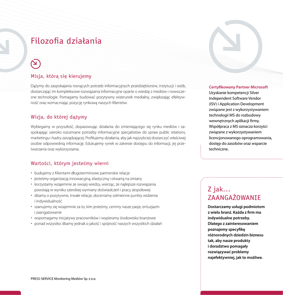 Filozofia działania Misja, którą się kierujemy Dążymy do zaspokajania rosnących potrzeb informacyjnych przedsiębiorstw, instytucji i osób, dostarczając im kompleksowe rozwiązania informacyjne oparte o wiedzę z mediów i nowoczesne technologie. Pomagamy budować pozytywny wizerunek medialny, zwiększając efektywność oraz wzmacniając pozycję rynkową naszych Klientów. Wizja, do której dążymy Wybiegamy w przyszłość, dopasowując działania do zmieniającego się rynku mediów i zaspokajając szeroko rozumiane potrzeby informacyjne specjalistów do spraw public relations, marketingu i kadry zarządzającej. Profilujemy działania, aby jak najszybciej dostarczyć właściwej osobie odpowiednią informację. Edukujemy rynek w zakresie dostępu do informacji, jej przetwarzania oraz wykorzystania. Certyfikowany Partner Microsoft Uzyskanie kompetencji Silver Independent Software Vendor (ISV) i Application Development związane jest z wykorzystywaniem technologii MS do rozbudowy wewnętrznych aplikacji firmy. Współpraca z MS oznacza korzyści związane z wykorzystywaniem licencjonowanego oprogramowania, dostęp do zasobów oraz wsparcie techniczne. Wartości, którym jesteśmy wierni budujemy z Klientami długoterminowe partnerskie relacje jesteśmy organizacją innowacyjną, elastyczną i otwartą na zmiany korzystamy wzajemnie ze swojej wiedzy, wierząc, że najlepsze rozwiązania powstają w wyniku szerokiej wymiany doświadczeń i pracy zespołowej dbamy o pozytywne, trwałe relacje, doceniamy odmienne punkty widzenia i indywidualność szanujemy się wzajemnie za to, kim jesteśmy, cenimy nasze pasje, entuzjazm i zaangażowanie wspomagamy inicjatywy pracowników i wspieramy środowisko branżowe ponad wszystko dbamy jednak o jakość i spójność naszych wszystkich działań PRESS-SERVICE Monitoring Mediów Sp. z o.o. Z jak… ZAANGAŻOWANIE Dostarczamy usługi podmiotom z wielu branż. Każda z firm ma indywidualne potrzeby. Dlatego z zainteresowaniem poznajemy specyfikę różnorodnych dziedzin biznesu tak, aby nasze produkty i doradztwo pomagały rozwiązywać problemy najefektywniej, jak to możliwe. BLISKO 50 LAT DOŚWIADCZENIA , TRADYCJI I DOSKONALENIA USŁUG DOŚWIADCZENIE Media intelligence To autorska filozofia, zgodnie z którą oferujemy sprofilowane usługi, wskazując naszym Klientom istotne informacje z mediów oraz sposoby, w jaki mogą je wykorzystać. Podstawowe usługi monitoringu mediów wzbogacamy o dogłębne analizy publikacji, obiektywnie oceniające pozycję medialną. Dodatkowo tworzymy nowoczesne rozwiązania technologiczne, umożliwiające sprawne zarządzanie pozyskaną informacją. Służymy również wsparciem merytorycznym, prowadząc działania o charakterze doradczym i szkoleniowym. S jak… SOLIDNOŚĆ Gazela Biznesu to nagroda dla firm cechujących się zwinnością, elastycznością, czujnością, refleksem i umiejętnością dostosowania do szybko zmieniających się warunków otoczenia. Tytuł przyznawany jest firmom o nieskazitelnej reputacji, uczciwości wobec kontrahentów, pracowników i Skarbu Państwa. Dokumentalistyczna agencja informacyjna PRESS-SERVICE Monitoring Mediów jest polską firmą, której podwaliny stanowiły Ośrodek Dokumentacji i Analiz Prasowych Wielkopolskiego Wydawnictwa Prasowego i Wielkopolska Agencja Informacyjna PRESS-SERVICE. Blisko pięćdziesięcioletnia tradycja organizacji, sięgająca roku 1969, daje gwarancję stabilności, wszechstronnej znajomości rynku mediów oraz pozwala Klientom czerpać informacje z naj większego w Polsce archiwum medialnego. Obecnie spółka PRESS-SERVICE Monitoring Mediów jest krajowym liderem w dziedzinie kompleksowego monitoringu mediów oraz wiodącym podmiotem w tej branży na rynku europejskim. Firma świadczy usługi dla największych koncernów, agencji PR, przedsiębiorstw oraz instytucji publicznych. Oś działalności firmy stanowią usługi precyzyjnego wyszukiwania i wyboru informacji medialnych z rozpowszechnionych wcześniej publikacji. Klienci otrzymują wyniki kompleksowego moni toringu w postaci dedykowanych serwisów informacyjnych. Specjalnością PRESS-SERVICE Monitoring Mediów są audyty medialne oraz wielopoziomowe raporty medialne niezbędne w profesjonalnym zarządzaniu wizerunkiem. Autorskie przeglądy mediów udostępniane są ich odbiorcom za pośrednictwem zaawanso wanych technologii informatycznych. Spersonalizowany portal Inforia jest innowacyjnym narzędziem, umożliwiającym nie tylko przegląd, ale również analizę pozyskanych informacji. Inforia pozwala także na sprawną komunikację i zarządzanie danymi. Działania media relations wspiera system Effecto – kluczowe na polskim rynku rozwiązanie, służące do pomiaru medialności i efektywności komunikatów. Tworząc specjalistyczne narzędzia IT dla Klientów, bazujemy na technologii Microsoftu. Efektywne wewnętrzne zarządzanie przedsiębiorstwem przekłada się na pozytywną ocenę spółki. PRESS-SERVICE Monitoring Mediów został uznany za jedną z najdynamiczniej rozwijających się firm w kategorii małych i średnich przedsiębiorstw oraz uzyskał tytuł „Gazeli Biznesu”. PARTNERSTWO PRESS-SERVICE Monitoring Mediów jest znaną i cenioną marką, postrzeganą w branży mediów, PR i marketingu w kategoriach niekwestionowanego autorytetu. Jako ekspert w dziedzinie monitoringu i analiz medialnych chętnie dzielimy się wiedzą oraz doświadczeniem. Prowadzimy warsztaty oraz wspieramy merytorycznie największe konferencje, debaty i seminaria, dostarczając specjalistycznych badań, raportów i opracowań. Obejmujemy patronat merytoryczny nad różnego rodzaju projektami i inicjatywami, m.in. Poz nań PR, PR Regionów czy Konkurs dla Studentów na Najlepsze Prace Dyplomowe z Zakresu Public Relations. Tworzymy teorię PR, będąc współautorem wielu opracowań i publikacji, m.in. „Leksykonu Public Relations” oraz książek „Badania i pomiar efektów w public
