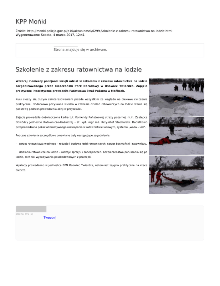 KPP Mońki Źródło: http://monki.policja.gov.pl/p10/aktualnosci/6299,Szkolenie-z-zakresu-ratownictwa-na-lodzie.html Wygenerowano: Sobota, 4 marca 2017, 12:41 Strona znajduje się w archiwum. Szkolenie z zakresu ratownictwa na lodzie Wczoraj monieccy policjanci wzięli udział w szkoleniu z zakresu ratownictwa na lodzie zorganizowanego przez Biebrzański Park Narodowy w Osowiec Twierdza. Zajęcia praktyczne i teoretyczne prowadziła Państwowa Straż Pożarna w Mońkach. Kurs cieszy się dużym zainteresowaniem przede wszystkim ze względu na ciekawe ćwiczenia praktyczne. Dodatkowo pozyskana wiedza w zakresie działań ratowniczych na lodzie stanie się podstawą podczas prowadzenia akcji w przyszłości. Zajęcia prowadziła doświadczona kadra tut. Komendy Państwowej straży pożarnej, m.in. Zastępca Dowódcy Jednostki Ratowniczo-Gaśniczej - st. kpt. mgr inż. Krzysztof Stachurski. Dodatkowo przeprowadzono pokaz alternatywnego rozwiązania w ratownictwie lodowym, systemu „woda – lód”. Podczas szkolenia szczegółowo omawiane były następujące zagadnienia: · sprzęt ratownictwa wodnego – rodzaje i budowa łodzi ratowniczych, sprzęt bosmański i ratowniczy, · działania ratownicze na lodzie – rodzaje sprzętu i zabezpieczeń, bezpieczeństwo poruszania się po lodzie, techniki wydobywania poszkodowanych z przerębli. Wykłady prowadzono w jednostce BPN Osowiec Twierdza, natomiast zajęcia praktyczne na rzece Biebrza. Ocena: 0/5 (0) Tweetnij