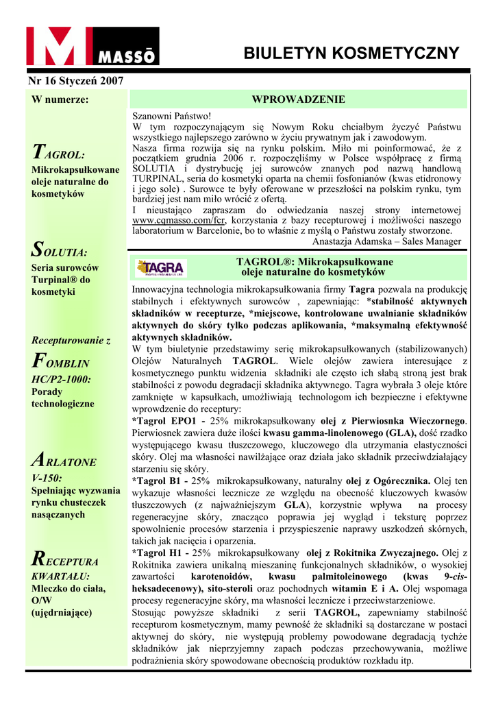 BIULETYN KOSMETYCZNY Nr 16 Styczeń 2007 W numerze: TAGROL: Mikrokapsułkowane oleje naturalne do kosmetyków SOLUTIA: Seria surowców Turpinal® do kosmetyki Recepturowanie z FOMBLIN HC/P2-1000: Porady technologiczne ARLATONE V-150: Spełniając wyzwania rynku chusteczek nasączanych RECEPTURA KWARTAŁU: Mleczko do ciała, O/W (ujędrniające) WPROWADZENIE Szanowni Państwo! W tym rozpoczynającym się Nowym Roku chciałbym życzyć Państwu wszystkiego najlepszego zarówno w życiu prywatnym jak i zawodowym. Nasza firma rozwija się na rynku polskim. Miło mi poinformować, że z początkiem grudnia 2006 r. rozpoczęliśmy w Polsce współpracę z firmą SOLUTIA i dystrybucję jej surowców znanych pod nazwą handlową TURPINAL, seria do kosmetyki oparta na chemii fosfonianów (kwas etidronowy i jego sole) . Surowce te były oferowane w przeszłości na polskim rynku, tym bardziej jest nam miło wrócić z ofertą. I nieustająco zapraszam do odwiedzania naszej strony internetowej www.cqmasso.com/fcr, korzystania z bazy recepturowej i możliwości naszego laboratorium w Barcelonie, bo to właśnie z myślą o Państwu zostały stworzone. Anastazja Adamska – Sales Manager TAGROL®: Mikrokapsułkowane oleje naturalne do kosmetyków Innowacyjna technologia mikrokapsułkowania firmy Tagra pozwala na produkcję stabilnych i efektywnych surowców , zapewniając: *stabilność aktywnych składników w recepturze, *miejscowe, kontrolowane uwalnianie składników aktywnych do skóry tylko podczas aplikowania, *maksymalną efektywność aktywnych składników. W tym biuletynie przedstawimy serię mikrokapsułkowanych (stabilizowanych) Olejów Naturalnych TAGROL. Wiele olejów zawiera interesujące z kosmetycznego punktu widzenia składniki ale często ich słabą stroną jest brak stabilności z powodu degradacji składnika aktywnego. Tagra wybrała 3 oleje które zamknięte w kapsułkach, umożliwiają technologom ich bezpieczne i efektywne wprowdzenie do receptury: *Tagrol EPO1 - 25% mikrokapsułkowany olej z Pierwiosnka Wieczornego. Pierwiosnek zawiera duże ilości kwasu gamma-linolenowego (GLA), dość rzadko występującego kwasu tłuszczowego, kluczowego dla utrzymania elastyczności skóry. Olej ma własności nawilżające oraz działa jako składnik przeciwdziałający starzeniu się skóry. *Tagrol B1 - 25% mikrokapsułkowany, naturalny olej z Ogórecznika. Olej ten wykazuje własności lecznicze ze względu na obecność kluczowych kwasów tłuszczowych (z najważniejszym GLA), korzystnie wpływa na procesy regeneracyjne skóry, znacząco poprawia jej wygląd i teksturę poprzez spowolnienie procesów starzenia i przyspieszenie naprawy uszkodzeń skórnych, takich jak nacięcia i oparzenia. *Tagrol H1 - 25% mikrokapsułkowany olej z Rokitnika Zwyczajnego. Olej z Rokitnika zawiera unikalną mieszaninę funkcjonalnych składników, o wysokiej zawartości karotenoidów, kwasu palmitoleinowego (kwas 9-cisheksadecenowy), sito-steroli oraz pochodnych witamin E i A. Olej wspomaga procesy regeneracyjne skóry, ma własności lecznicze i przeciwstarzeniowe. Stosując powyższe składniki z serii TAGROL, zapewniamy stabilność recepturom kosmetycznym, mamy pewność że składniki są dostarczane w postaci aktywnej do skóry, nie występują problemy powodowane degradacją tychże składników jak nieprzyjemny zapach podczas przechowywania, możliwe podrażnienia skóry spowodowane obecnością produktów rozkładu itp. Strona 2 Biuletyn Kosmetyczny SOLUTIA: Seria surowców Turpinal® do kosmetyki Mamy przyjemność poinformować Państwa, że nasza firma COMERCIAL QUIMICA MASSÓ S.A. została wyłącznym dystrybutorem firmy SOLUTIA na terytorium Polski, Węgier, Czech, Słowacji, Słowenii i Chorwacji. SOLUTIA ma szerokie portfolio biznesowe. Serie produktów przeznaczone są do stosowania w wielu obszarach przemysłu np. surowce filmotwórcze do wyrobów szklanych, włókna nylonowe, surowce do farmacji oraz produkty specjalne (obejmujące rozwiązania w dziedzinie Personal Care). Surowce Solutia przeznaczone do kosmetyki są znane pod nazwą handlową Turpinal®: • Turpinal® SL - INCI: etidronic acid (roztwór, akt. 58-61%) • Turpinal® 4NL - INCI: tetrasodium etidronate (roztwór, akt. 29-31%) • Turpinal® 2NZ - INCI: disodium etidronate (proszek, akt. 90-96%) • Turpinal® 4NP - INCI: tetrasodium etidronate (proszek akt. 82-88%) Produkty serii Turpinal mieszają się z wodą w każdych proporcjach, mają silne własności kompleksujące wielowartościowe kationy. Znakomite własności kompleksujące w odniesieniu do metali wykorzystywane jest w preparatach zawierających wodę utlenioną lub aktywny tlen w innej postaci. Surowce te nadają się również do stabilizacji produktów zawierających merkaptany, zwiększają także stabilność barwy kostek mydła. Rekomendowane dozowanie Turpinal podczas produkcji to 0,1 – 2%. Recepturowanie z FOMBLIN HC/P2-1000: Porady technologiczne Receptura, którą przedstawiamy w bieżącym wydaniu biuletynu, zawiera FOMBLIN HC/P2-1000 jako emulgator. Surowiec ten przedstawialiśmy już Państwu w poprzednich wydaniach biuletynu: jako związek o uniwersalnym charakterze, skuteczny w małych stężeniach, mający zastosowanie jako: pokrycie pigmentów i proszków mineralnych, w celu nadania wodo- i olejoodporności, składnik ochronny i odżywiający skórę i włosy, emulgator, efektywny w emulsjach O/W w spray’u, o wysokiej zawartości fazy olejowej, składnik polepszający własności sensoryczne, redukujący lepkość i oleistość produktu, środek pianotwórczy, dyspergujący i zwilżający, stosowany w szerokim zakresie pH, składnik systemów kwasowych (nie drażniące żele o pH: 2,5 - 4,0), komponent układów samo-konserwujących (nie zawierających konserwantu). Pomimo całkowitego braku rozpuszczalności w wodzie, stabilne i stężone wodne roztwory Fomblin HC/P2-1000, od bardzo kwaśnych do neutralnych, mogą być przygotowan
