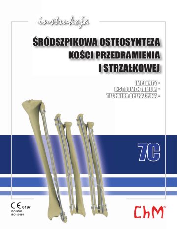 instrukcja ŚRÓDSZPIKOWA OSTEOSYNTEZA KOŚCI PRZEDRAMIENIA I STRZAŁKOWEJ IMPLANTY • INSTRUMENTARIUM • TECHNIKA OPERACYJNA • 7C 0197 ISO 9001 ISO 13485 SPIS TREŚCI I. WSTĘP������������������������������������������������������������������������������������������������������������������������������������������������������������������������� 5 II. IMPLANTY������������������������������������������������������������������������������������������������������������������������������������������������������������������ 6 GWÓŹDŹ DO KOŚCI PRZEDRAMIENIA, STRZAŁKOWEJ I OBOJCZYKA������������������������������������������������������ 6 ELEMENTY BLOKUJĄCE����������������������������������������������������������������������������������������������������������������������������������� 7 III. INSTRUMENTARIUM������������������������������������������������������������������������������������������������������������������������������������������������ 8 IV. TECHNIKA OPERACYJNA������������������������������������������������������������������������������������������������������������������������������������� 11 IV.1. Wstęp�����������������������������������������������������������������������������������������������������������������������������������������������������������11 IV.2. Przygotowanie gwoździa śródszpikowego�������������������������������������������������������������������������������������������������� 13 V.4. Wprowadzenie gwoździa do kanału szpikowego����������������������������������������������������������������������������������������� 14 IV.3. Otwarcie kanału szpikowego����������������������������������������������������������������������������������������������������������������������� 14 IV.5. Blokowanie gwoździa śródszpikowego w odcinku dalszym������������������������������������������������������������������������ 15 IV.6. Blokowanie gwoździa śródszpikowego w odcinku bliższym����������������������������������������������������������������������� 17 IV.7. Wkręcenie śruby zaślepiającej�������������������������������������������������������������������������������������������������������������������� 18 IV.8. Usuwanie gwoździa śródszpikowego���������������������������������������������������������������������������������������������������������� 19 Instrukcja 7C z dnia 04.05.2010r. Ostatni przegląd dnia 10.10.2011r. ChM Sp. z o.o., Lewickie 3b, 16-061 Juchnowiec K., POLSKA tel. +48 85 713-13-20 ÷ 25 fax +48 85 713-13-19 e-mail: [email protected] 3 WSTĘP I. WSTĘP CHARFIX system – ŚRÓDSZPIKOWA OSTEOSYNTEZA KOŚCI PRZEDRAMIENIA I STRZAŁKOWEJ stanowią: ● implanty (gwóźdź śródszpikowy, wkręty blokujące, śruba zaślepiająca lub kompresyjna), ● instrumentarium