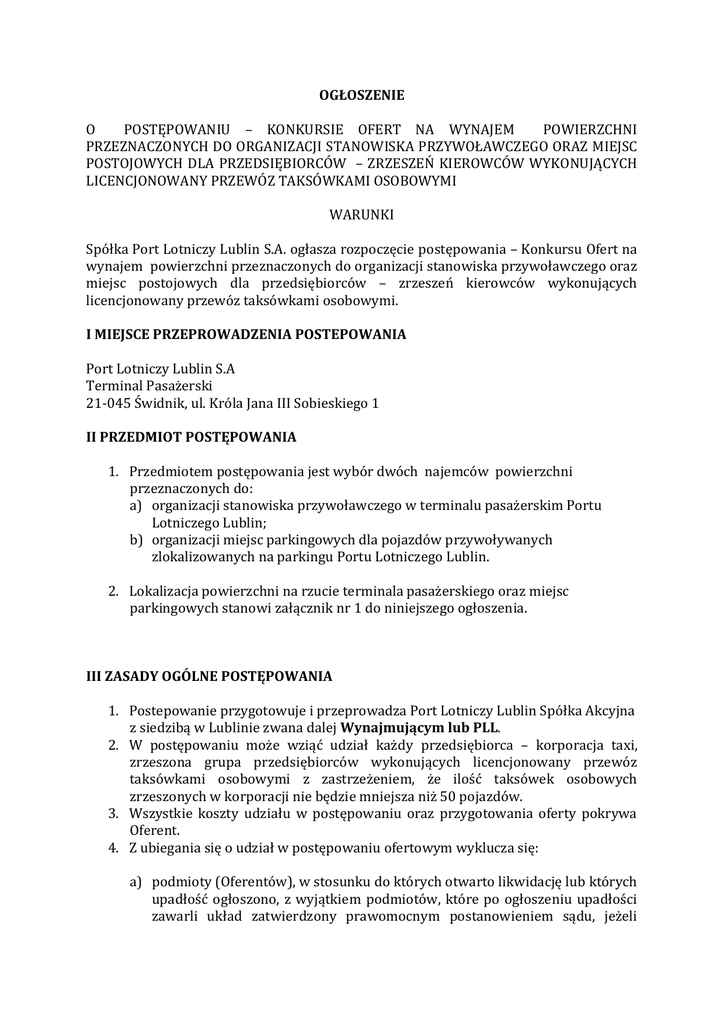 OGŁOSZENIE O POSTĘPOWANIU – KONKURSIE OFERT NA WYNAJEM POWIERZCHNI PRZEZNACZONYCH DO ORGANIZACJI STANOWISKA PRZYWOŁAWCZEGO ORAZ MIEJSC POSTOJOWYCH DLA PRZEDSIĘBIORCÓW – ZRZESZEŃ KIEROWCÓW WYKONUJĄCYCH LICENCJONOWANY PRZEWÓZ TAKSÓWKAMI OSOBOWYMI WARUNKI Spółka Port Lotniczy Lublin S.A. ogłasza rozpoczęcie postępowania – Konkursu Ofert na wynajem powierzchni przeznaczonych do organizacji stanowiska przywoławczego oraz miejsc postojowych dla przedsiębiorców – zrzeszeń kierowców wykonujących licencjonowany przewóz taksówkami osobowymi. I MIEJSCE PRZEPROWADZENIA POSTEPOWANIA Port Lotniczy Lublin S.A Terminal Pasażerski 21-045 Świdnik, ul. Króla Jana III Sobieskiego 1 II PRZEDMIOT POSTĘPOWANIA 1. Przedmiotem postępowania jest wybór dwóch najemców powierzchni przeznaczonych do: a) organizacji stanowiska przywoławczego w terminalu pasażerskim Portu Lotniczego Lublin; b) organizacji miejsc parkingowych dla pojazdów przywoływanych zlokalizowanych na parkingu Portu Lotniczego Lublin. 2. Lokalizacja powierzchni na rzucie terminala pasażerskiego oraz miejsc parkingowych stanowi załącznik nr 1 do niniejszego ogłoszenia. III ZASADY OGÓLNE POSTĘPOWANIA 1. Postepowanie przygotowuje i przeprowadza Port Lotniczy Lublin Spółka Akcyjna z siedzibą w Lublinie zwana dalej Wynajmującym lub PLL. 2. W postępowaniu może wziąć udział każdy przedsiębiorca – korporacja taxi, zrzeszona grupa przedsiębiorców wykonujących licencjonowany przewóz taksówkami osobowymi z zastrzeżeniem, że ilość taksówek osobowych zrzeszonych w korporacji nie będzie mniejsza niż 50 pojazdów. 3. Wszystkie koszty udziału w postępowaniu oraz przygotowania oferty pokrywa Oferent. 4. Z ubiegania się o udział w postępowaniu ofertowym wyklucza się: a) podmioty (Oferentów), w stosunku do których otwarto likwidację lub których upadłość ogłoszono, z wyjątkiem podmiotów, które po ogłoszeniu upadłości zawarli układ zatwierdzony prawomocnym postanowieniem sądu, jeżeli układ nie przewiduje zaspokojenia wierzycieli przez likwidację majątku upadłego; b) podmioty (Oferentów) , które zalegają z uiszczeniem podatków, opłat lub składek na ubezpieczenia społeczne lub zdrowotne, z wyjątkiem przypadków gdy uzyskali oni przewidziane prawem zwolnienie, odroczenie, rozłożenie na raty zaległych płatności lub wstrzymanie w całości wykonania decyzji właściwego organu; c) Oferentów, którzy złożyli oferty po terminie przewidzianym w ogłoszeniu. d) Oferentów, którzy zgłosili oferty niepełne lub nie spełniających warunków określonych w Części IV niniejszego Ogłoszenia. PLL wymaga złożenia przez Oferentów stosownego oświadczenia o spełnieniu powyższych warunków. Oświadczenie traktowane jest jako integralna część oferty. 5. Postępowanie ma charakter niejawny. Nie przewiduje się publicznego otwierania ofert oraz informowania o ilości i biorących udział w postępowaniu firmach Oferentów. 6. Weryfikacji, oceny i wyboru ofert dokona Komisja powołana przez Port Lotniczy Lublin S. A. 7. Wynajmujący zastrzega sobie prawo do: a) odwołania postępowania lub zmiany jego warunków; b) unieważnienia postępowania bez podawania przyczyn; w dowolnym czasie bez ponoszenia odpowiedzialności wobec Oferentów, którzy złożyli oferty. 8. Nie dopuszcza się składania ofert częściowych tylko na stanowisko wywoławcze lub tylko na stanowisko parkingowe 9. Oferty należy składać w jednym wariancie dla 2 letniego okresu trwania umowy. 10. Okres obowiązywania umowy najmu wynosi 2 lata. 11. Postępowanie ofertowe uważa się za ważne o ile wpłynie co najmniej jedna oferta spełniająca wszystkie wymogi postępowania. 12. Okres związania ofertą powinien być nie krótszy niż 60 dni. IV WARUNKI UDZIAŁU W POSTĘPOWANIU – KONKURSIE OFERT Warunkiem przystąpienia do postępowania – konkursu ofert jest: 1. Złożenie prawidłowo wypełnionej oferty na wzorze Formularza Ofertowego, stanowiącego załącznik numer 3 do niniejszego Ogłoszenia z zastrzeżeniem, że oferta będzie zawierała propozycję stawki gwarantowanego całkowitego czynszu miesięcznego dla wszystkich powierzchni będących przedmiotem postępowania. 2. Złożenie dokumentów zgodnie z listą wymaganych dokumentów, stanowiącą Załącznik numer 2 do niniejszego Ogłoszenia. 3. Posiadanie przez Oferenta udokumentowanego doświadczenia w prowadzeniu działalności polegającej wykonywaniu licencjonowanego przewozu pasażerów taksówką osobową. 4. Posiadanie przez oferenta floty co najmniej 50 pojazdów wraz z kierowcami uprawnionymi do wykonywania licencjonowanego przewozu pasażerów taksówką osobową. V FORMA, MIEJSCE I TERMIN SKŁADANIA OFERT 1. Termin składania Ofert upływa w dniu 2 kwietnia 2013 roku. 2. Oferty powinny zostać złożone w sekretariacie Biura Zarządu Portu Lotniczego Lublin (adres: 21 – 040 Świdnik, ul. Króla Jana III Sobieskiego 1). 3. Oferta powinna zostać złożona w formie wypełnionego Formularza Ofertowego wraz z dołączonymi wymaganymi dokumentami, w zamkniętej, nieprzeźroczystej kopercie lub paczce z napisem: OFERTA NA DZIERŻAWĘ POWIERZCHNI PRZEZNACZONYCH DO ORGANIZACJI STANOWISKA PRZYWOŁAWCZEGO ORAZ MIEJSC POSTOJOWYCH DLA PRZEDSIĘBIORSTW – ZRZESZEŃ KIEROWCÓW WYKONUJĄCYCH LICENCJONOWANY PRZEWÓZ TAKSÓWKAMI OSOBOWYMI . Oferta może zostać doręczona do spółki na wskazany powyżej adres osobiście, pocztą lub za pośrednictwem kuriera. Decydująca dla skuteczności zachowania terminu doręczenia oferty jest data wpływu oferty na wskazany w pkt.2 adres. Oferta oprócz wymaganych przez Wynajmującego dokumentów może zawierać opis / referencje, przykłady podobnej działalności przedsiębiorcy w innych lokalizacjach (centra handlowe, dworce kolejowe itp.) 4. Oferta powinna zawierać: 4.1 Imię i nazwisko oraz adres korespondencyjny Oferenta albo nazwę lub firmę wraz z adresem siedziby przedsiębiorcy – Of