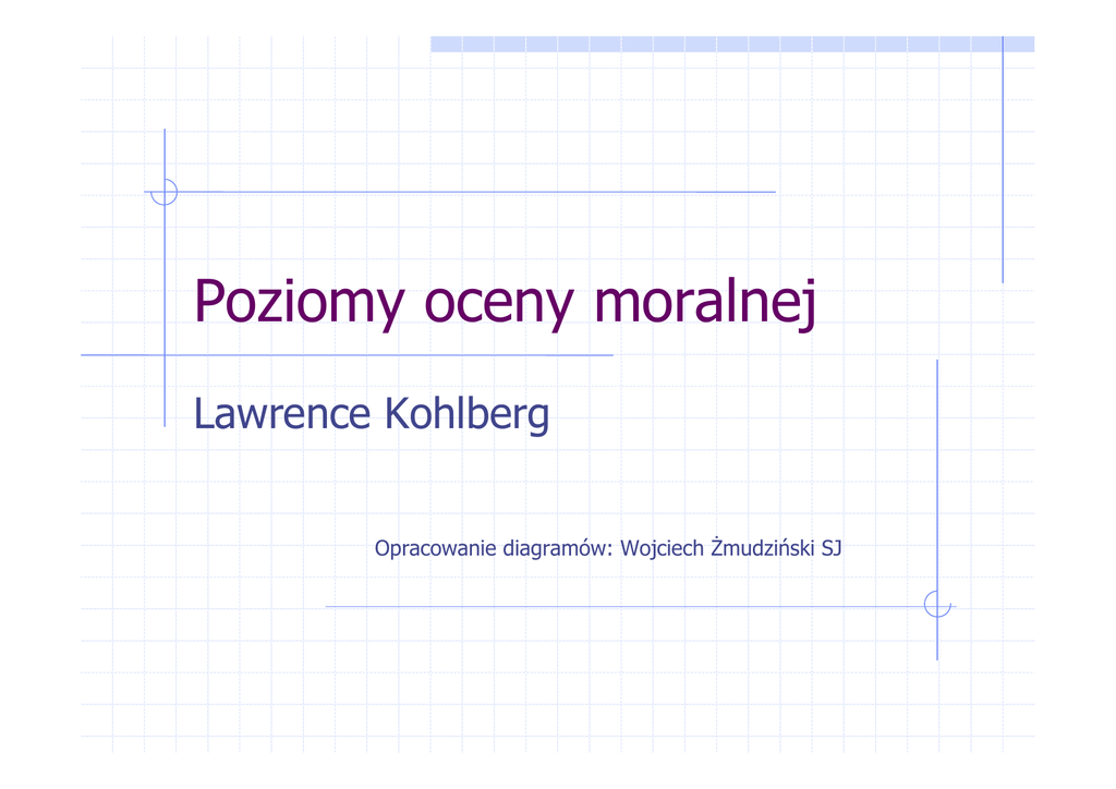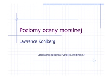 Poziomy oceny moralnej Lawrence Kohlberg Opracowanie diagramów: Wojciech Żmudziński SJ 1 Kara i posłuszeństwo. 2 Interesowna wymiana 3 Konformizm w stosunku do oczekiwań innych. 4 Prawo i ład społeczny. 5 Kontrakt społeczny 6 Uniwersalne pryncypia etyczne Poziom prekonwencjonalny Poziom konwencjonalny Poziom postkonwencjonalny Poziomy rozwoju moralnego Widzi siebie jako podporządkowanego innym siłom Posłuszeństwo temu, kto ma władzę Działania oceniane są po ich fizycznych konsekwencjach JA Strach przed karą dominuje motywacje Zatroskany o siebie Poziom 1 - prekonwencjonalny Nie obchodzą mnie potrzeby drugiego, chyba że przyniesie mi to jakąś korzyść. JA INNY Podstawowym motywem jest zaspokojenie moich własnych potrzeb. Poziom 2 - prekonwencjonalny Zorientowanie na grupę ludzi, i podporządkowanie się jej normom. JA Grupa Motywem jest bycie „fajnym”, akceptowanym. Poziom 3 - konwencjonalny Strona afektywna odgrywa dużą rolę. Zorientowanie na porządek społeczny. JA SPOŁECZEŃSTWO Honor i powinność, utrzymanie zasad panujących w społeczeństwie. Poziom 4 - konwencjonalny Społeczna umowa / kontrakt Zmiany w prawie dokonywane dla większego dobra większości ludzi. JA SPOŁECZEŃSTWO Demokratyczne stanowienie o prawach, standardach, możliwościach zmiany... Poziom 5 - postkonwencjonalny Uniwersalne pryncypia etyczne O tym, czy coś jest właściwe, decyduje sumienie. JA SPOŁECZEŃSTWO W ocenie pojawia się język wartości Poziom 6 - postkonwencjonalny 1 Kara i posłuszeństwo. 2 Interesowna wymiana 3 Konformizm w stosunku do oczekiwań innych. 4 Prawo i ład społeczny. 5 Kontrakt społeczny 6 Uniwersalne pryncypia etyczne Poziom prekonwencjonalny Poziom konwencjonalny Poziom postkonwencjonalny Poziomy rozwoju moralnego