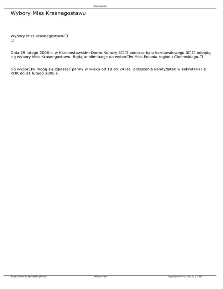 Krasnystaw Wybory Miss Krasnegostawu Wybory Miss Krasnegostawu Dnia 25 lutego 2006 r. w Krasnostawskim Domu Kultury – podczas balu karnawałowego – odbędą się wybory Miss Krasnegostawu. Będą to eliminacje do wyborÃłw Miss Polonia regionu Chełmskiego. Do wyborÃłw mogą się zgłaszać panny w wieku od 18 do 24 lat. Zgłoszenia kandydatek w sekretariacie KDK do 21 lutego 2006 r. http://www.krasnystaw.pl/new Kreator PDF Utworzono 4-03-2017, 11:49