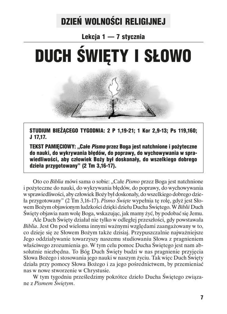DZIEŃ WOLNOŚCI RELIGIJNEJ Lekcja 1 — 7 stycznia DUCH ŚWIĘTY I SŁOWO STUDIUM BIEŻĄCEGO TYGODNIA: 2 P 1,19-21; 1 Kor 2,9-13; Ps 119,160; J 17,17. TEKST PAMIĘCIOWY: „Całe Pismo przez Boga jest natchnione i pożyteczne do nauki, do wykrywania błędów, do poprawy, do wychowywania w sprawiedliwości, aby człowiek Boży był doskonały, do wszelkiego dobrego dzieła przygotowany” (2 Tm 3,16-17). Oto co Biblia mówi sama o sobie: „Całe Pismo przez Boga jest natchnione i pożyteczne do nauki, do wykrywania błędów, do poprawy, do wychowywania w sprawiedliwości, aby człowiek Boży był doskonały, do wszelkiego dobrego dzieła przygotowany” (2 Tm 3,16-17). Pismo Święte wypełnia tę rolę, gdyż jest Słowem Bożym objawionym ludzkości dzięki dziełu Ducha Świętego. W Biblii Duch Święty objawia nam wolę Boga, wskazując, jak mamy żyć, by podobać się Jemu. Ale Duch Święty działał nie tylko w odległej przeszłości, gdy powstawała Biblia. Jest On pod wieloma innymi ważnymi względami zaangażowany w to, co dzieje się ze Słowem Bożym także dzisiaj. Przypuszczalnie najważniejsze Jego oddziaływanie towarzyszy naszemu studiowaniu Słowa z pragnieniem właściwego zrozumienia go. W tym celu pomoc Ducha Świętego jest nam absolutnie niezbędna. To Bóg Duch Święty budzi w nas pragnienie przyjęcia Słowa Bożego i stosowania jego nauki w naszym życiu. Tak więc Duch Święty działa przy pomocy Słowa Bożego i za jego pośrednictwem, by przemieniać nas w nowe stworzenie w Chrystusie. W tym tygodniu prześledzimy pokrótce dzieło Ducha Świętego związane z Pismem Świętym. 7 Duch Święty i objawienie NIEDZIELA — 1 stycznia Jak Bóg zapewnił upadłej ludzkości wierny przekaz swojej woli? Uczynił to przy pomocy dwóch zasadniczych, powiązanych ze sobą działań Ducha Świętego — objawienia i natchnienia. W procesie objawienia ludzie są zależni od pomocy Kogoś z zewnątrz, spoza nich samych, kto objawi nam to, czego my, jako stworzone (i upadłe) istoty, nie możemy wiedzieć sami z siebie. To znaczy, że Duch Święty uczy nas prawd, których musimy się nauczyć (zob. np. Dn 2,19-23). W przeciwnym razie nigdy nie poznalibyśmy ich przy pomocy naturalnych sposobów. Objawienie to proces, w którym Bóg daje poznać nam, ludziom, siebie samego i swoją wolę. Zasadnicze pojęcie związane ze słowem objawienie to odsłonięcie (czy odkrycie) — ukazanie czegoś, co w przeciwnym razie pozostałoby ukryte. Potrzebujemy takiego objawienia, gdyż, jako ograniczone i upadłe istoty odłączone od Boga z powodu grzechu, sami z siebie mamy bardzo niewielkie możliwości poznawania rzeczywistości. W kwestii poznania woli Boga zależymy całkowicie od Niego. Tak więc Boże objawienie jest nam niezbędne, gdyż nie znamy Boga, a z naturalnego świata, który nas otacza, możemy się o Nim dowiedzieć stosunkowo niewiele. Przeczytaj 2 P 1,19-21. Co ten fragment listu mówi o pochodzeniu proroczego przesłania biblijnego? Jak Boże pochodzenie przesłania Biblii świadczy o jej autorytecie? ................................................................................................................................................................................................................................................................... ................................................................................................................................................................................................................................................................... ................................................................................................................................................................................................................................................................... Według apostoła Piotra prorocze przesłanie Starego Testamentu nie pochodzi od ludzi. Prorocy byli kierowani przez Ducha Świętego w taki sposób, iż treść ich przesłania pochodziła od Boga. Ci ludzie nie stworzyli samodzielnie tego przesłania. Byli jedynie przekazicielami przesłania, a nie jego źródłami. Piotr z całym naciskiem podkreślił, że źródłem proroctw było natchnienie Ducha Świętego, a więc, choć spisane przez ludzi, „proroctwo nie przychodziło nigdy z woli ludzkiej” (2 P 1,21). To właśnie owo boskie pochodzenie nadaje Biblii jej najwyższą wiarygodność. Bóg posłużył się ludźmi, by przekazać światu swoje Słowo. Jak Duch Święty może się posłużyć nami, by uczynić coś podobnego dzisiaj — nie przez pisanie kolejnych ksiąg Pisma Świętego, ale przez głoszenie tego, co zostało już napisane? 8 Duch Święty i natchnienie PONIEDZIAŁEK — 2 stycznia Natchnienie to słowo opisujące wpływ Boga przez działanie Ducha Świętego w procesie przekazywania Jego przesłania za pośrednictwem ludzi. Dzieło Ducha Świętego w procesie natchnienia jest podstawą zasadniczej spójności całego Pisma Świętego co do prawdy. Jako Duch Prawdy (zob. J 14,17; 15,26; 16,13) Duch Święty prowadzi nas do wszelkiej prawdy. Przeczytaj 2 P 1,21; Pwt 18,18; Mi 3,8; 1 Kor 2,9-13. Co wersety te mówią nam o autorach ksiąg biblijnych i zaangażowaniu Boga w powstanie Biblii? ................................................................................................................................................................................................................................................................... ................................................................................................................................................................................................................................................................... Fakt, iż autorzy ksiąg biblijnych byli „natchnieni Duchem Świętym” (2 P 1,21), stanowi mocne potwierdzenie dzieła Ducha Świętego w procesie natchnienia. W 1