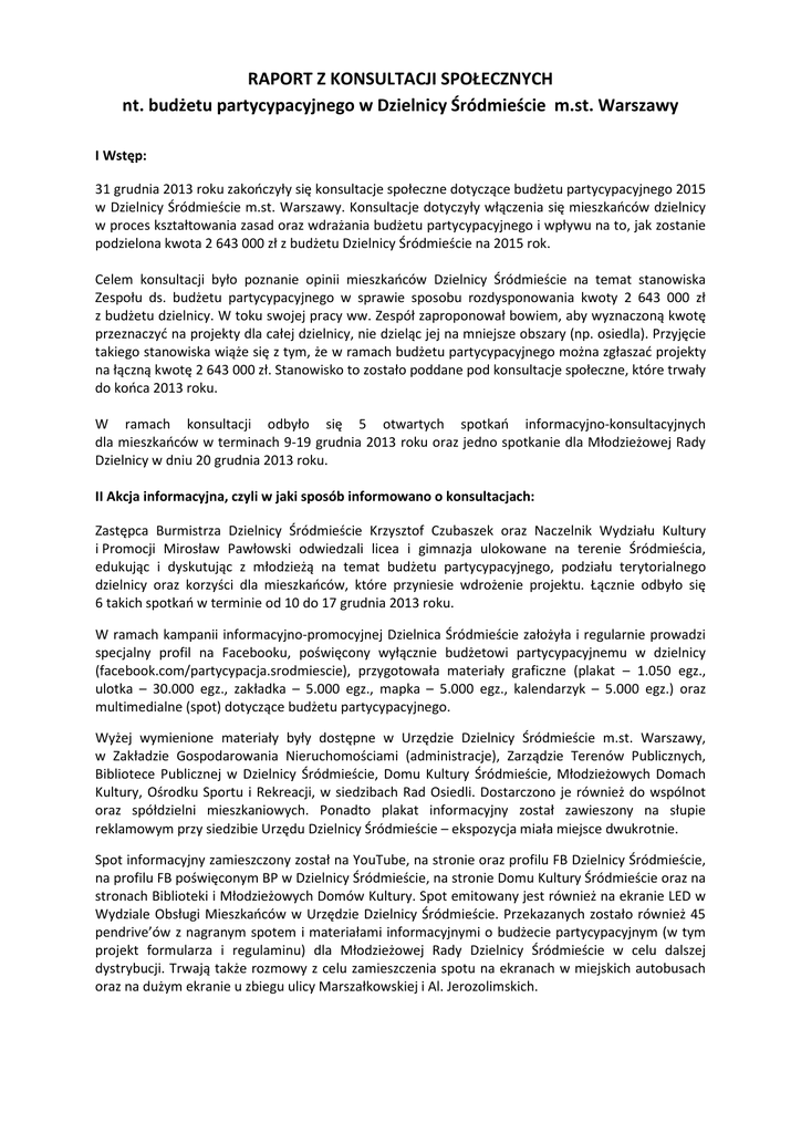 RAPORT Z KONSULTACJI SPOŁECZNYCH nt. budżetu partycypacyjnego w Dzielnicy Śródmieście m.st. Warszawy I Wstęp: 31 grudnia 2013 roku zakończyły się konsultacje społeczne dotyczące budżetu partycypacyjnego 2015 w Dzielnicy Śródmieście m.st. Warszawy. Konsultacje dotyczyły włączenia się mieszkańców dzielnicy w proces kształtowania zasad oraz wdrażania budżetu partycypacyjnego i wpływu na to, jak zostanie podzielona kwota 2 643 000 zł z budżetu Dzielnicy Śródmieście na 2015 rok. Celem konsultacji było poznanie opinii mieszkańców Dzielnicy Śródmieście na temat stanowiska Zespołu ds. budżetu partycypacyjnego w sprawie sposobu rozdysponowania kwoty 2 643 000 zł z budżetu dzielnicy. W toku swojej pracy ww. Zespół zaproponował bowiem, aby wyznaczoną kwotę przeznaczyć na projekty dla całej dzielnicy, nie dzieląc jej na mniejsze obszary (np. osiedla). Przyjęcie takiego stanowiska wiąże się z tym, że w ramach budżetu partycypacyjnego można zgłaszać projekty na łączną kwotę 2 643 000 zł. Stanowisko to zostało poddane pod konsultacje społeczne, które trwały do końca 2013 roku. W ramach konsultacji odbyło się 5 otwartych spotkań informacyjno-konsultacyjnych dla mieszkańców w terminach 9-19 grudnia 2013 roku oraz jedno spotkanie dla Młodzieżowej Rady Dzielnicy w dniu 20 grudnia 2013 roku. II Akcja informacyjna, czyli w jaki sposób informowano o konsultacjach: Zastępca Burmistrza Dzielnicy Śródmieście Krzysztof Czubaszek oraz Naczelnik Wydziału Kultury i Promocji Mirosław Pawłowski odwiedzali licea i gimnazja ulokowane na terenie Śródmieścia, edukując i dyskutując z młodzieżą na temat budżetu partycypacyjnego, podziału terytorialnego dzielnicy oraz korzyści dla mieszkańców, które przyniesie wdrożenie projektu. Łącznie odbyło się 6 takich spotkań w terminie od 10 do 17 grudnia 2013 roku. W ramach kampanii informacyjno-promocyjnej Dzielnica Śródmieście założyła i regularnie prowadzi specjalny profil na Facebooku, poświęcony wyłącznie budżetowi partycypacyjnemu w dzielnicy (facebook.com/partycypacja.srodmiescie), przygotowała materiały graficzne (plakat – 1.050 egz., ulotka – 30.000 egz., zakładka – 5.000 egz., mapka – 5.000 egz., kalendarzyk – 5.000 egz.) oraz multimedialne (spot) dotyczące budżetu partycypacyjnego. Wyżej wymienione materiały były dostępne w Urzędzie Dzielnicy Śródmieście m.st. Warszawy, w Zakładzie Gospodarowania Nieruchomościami (administracje), Zarządzie Terenów Publicznych, Bibliotece Publicznej w Dzielnicy Śródmieście, Domu Kultury Śródmieście, Młodzieżowych Domach Kultury, Ośrodku Sportu i Rekreacji, w siedzibach Rad Osiedli. Dostarczono je również do wspólnot oraz spółdzielni mieszkaniowych. Ponadto plakat informacyjny został zawieszony na słupie reklamowym przy siedzibie Urzędu Dzielnicy Śródmieście – ekspozycja miała miejsce dwukrotnie. Spot informacyjny zamieszczony został na YouTube, na stronie oraz profilu FB Dzielnicy Śródmieście, na profilu FB poświęconym BP w Dzielnicy Śródmieście, na stronie Domu Kultury Śródmieście oraz na stronach Biblioteki i Młodzieżowych Domów Kultury. Spot emitowany jest również na ekranie LED w Wydziale Obsługi Mieszkańców w Urzędzie Dzielnicy Śródmieście. Przekazanych zostało również 45 pendrive’ów z nagranym spotem i materiałami informacyjnymi o budżecie partycypacyjnym (w tym projekt formularza i regulaminu) dla Młodzieżowej Rady Dzielnicy Śródmieście w celu dalszej dystrybucji. Trwają także rozmowy z celu zamieszczenia spotu na ekranach w miejskich autobusach oraz na dużym ekranie u zbiegu ulicy Marszałkowskiej i Al. Jerozolimskich. Ukazało się ogłoszenie prasowe w gazecie „Południe” w dniu 5 grudnia 2013 roku, informujące o spotkaniach konsultacyjnych w Dzielnicy Śródmieście oraz w gazetach lokalnych: Rady Osiedla Koszyki „Na Koszykach” w numerze 7, liczba egz. Ok. 500 sztuk i Rady Osiedla Krucza „Kuryer” nr 4, liczba egz. ok. 450. Informacje publikowane były na stronach i portalach społecznościach o budżecie partycypacyjnym: http://www.rdc.pl/informacje/srodmiescie-tworzy-budzet-obywatelski-mieszkancy-wydadza-26-mlnzl/ http://www.rdc.pl/informacje/krzysztof-czubaszek-teraz-do-decyzji-beda-dopuszczeni-mieszkancyposluchaj/ http://krzysztofmroz.blog.onet.pl/2013/12/10/budzet-partycypacyjny-w-poszczegolnych-dzielnicachwarszawy/ http://partycypacjaobywatelska.pl/wiadomosc/zdaniem-seniora-spotkanie-o-budzeciepartycypacyjnym-w-warszawie-15-16-stycznia/ http://www.politykawarszawska.pl/index.php/article/370 http://oknonawarszawe.pl/blog/archives/tag/budzet-partycypacyjny-konsultacje-spolecznewarszawa http://www.toportal.pl/info12425,1 http://www.magazyngmina.pl/index.php?option=com_k2&view=item&id=483:pomyslymieszkancow-za-budzetowe-pieniadze http://www.krytykapolityczna.pl/artykuly/miasto/20131003/budzet-partycypacyjny-jak-sie-robi-wwarszawie http://wiadomosci.ngo.pl/wiadomosci/896278.html http://warszawa.ngo.pl/wiadomosc/951020.html http://wiadomosci.ngo.pl/wiadomosci/918791.html http://konsultacje.um.warszawa.pl/budzet-konsultacje-srodmiescie http://warszawa.gazeta.pl/warszawa/1,34889,15211002,Budzet_obywatelski__wez_udzial_w_podzi ale_25_mln_zlotych.html http://warszawa.gazeta.pl/warszawa/1,34889,14692503,Przyjdz_na_debate_z_Gronkiewicz_Waltz__ Warszawa_Obywatelska.html http://warszawa.gazeta.pl/warszawa/1,34889,14706177,Hanna_Gronkiewicz_Waltz__mam_papier_ _mam_dlugopis.html http://warszawa.naszemiasto.pl/artykul/2112664,trwaja-konsultacje-na-temat-budzetustolicy,id,t.html III Działania podjęte w ramach konsultacji: Na spotkaniach konsultacyjnych zbierane były opinie na temat budżetu partycypacyjnego od mieszkańców i zapisywane przez członków zespołu do spraw BP. Opinie zbierane były także za pomocą ankiety dostępnej na spotkaniach i w siedzibie Urzędu Dzielnicy Śródmieście. Istniała też możliwość pisan