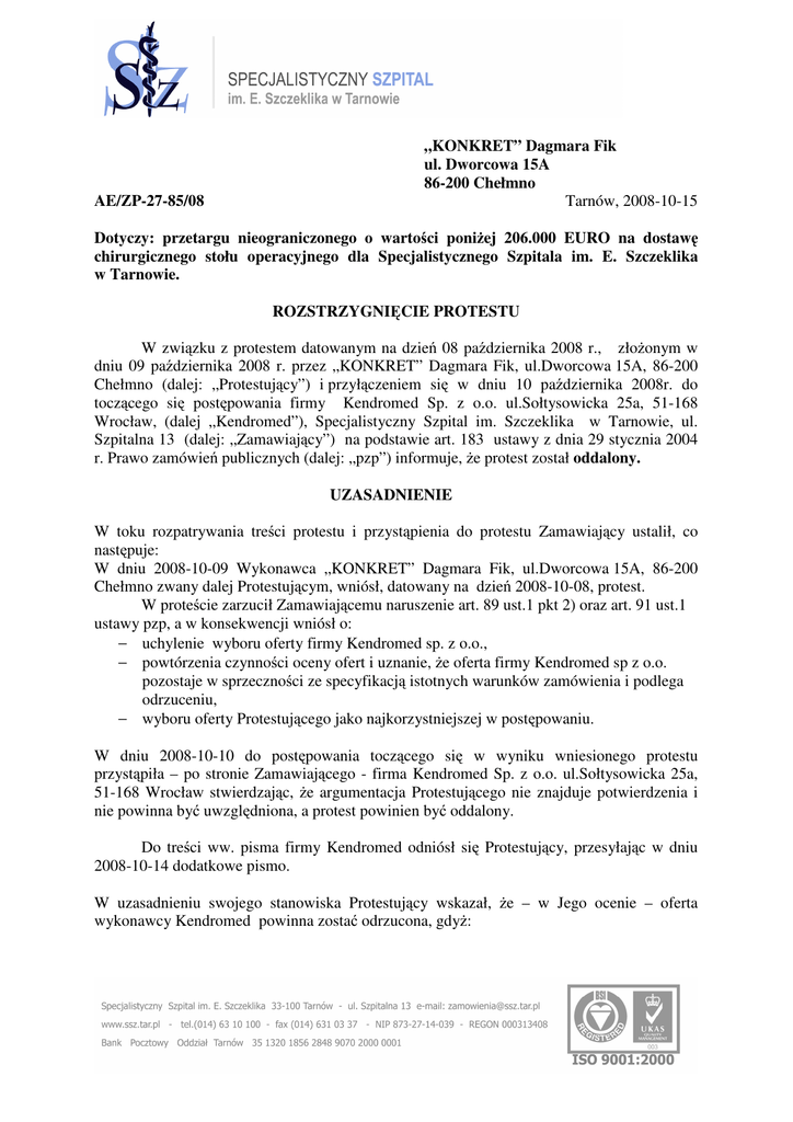 AE/ZP-27-85/08 „KONKRET” Dagmara Fik ul. Dworcowa 15A 86-200 Chełmno Tarnów, 2008-10-15 Dotyczy: przetargu nieograniczonego o wartości poniżej 206.000 EURO na dostawę chirurgicznego stołu operacyjnego dla Specjalistycznego Szpitala im. E. Szczeklika w Tarnowie. ROZSTRZYGNIĘCIE PROTESTU W związku z protestem datowanym na dzień 08 października 2008 r., złożonym w dniu 09 października 2008 r. przez „KONKRET” Dagmara Fik, ul.Dworcowa 15A, 86-200 Chełmno (dalej: „Protestujący”) i przyłączeniem się w dniu 10 października 2008r. do toczącego się postępowania firmy Kendromed Sp. z o.o. ul.Sołtysowicka 25a, 51-168 Wrocław, (dalej „Kendromed”), Specjalistyczny Szpital im. Szczeklika w Tarnowie, ul. Szpitalna 13 (dalej: „Zamawiający”) na podstawie art. 183 ustawy z dnia 29 stycznia 2004 r. Prawo zamówień publicznych (dalej: „pzp”) informuje, że protest został oddalony. UZASADNIENIE W toku rozpatrywania treści protestu i przystąpienia do protestu Zamawiający ustalił, co następuje: W dniu 2008-10-09 Wykonawca „KONKRET” Dagmara Fik, ul.Dworcowa 15A, 86-200 Chełmno zwany dalej Protestującym, wniósł, datowany na dzień 2008-10-08, protest. W proteście zarzucił Zamawiającemu naruszenie art. 89 ust.1 pkt 2) oraz art. 91 ust.1 ustawy pzp, a w konsekwencji wniósł o: − uchylenie wyboru oferty firmy Kendromed sp. z o.o., − powtórzenia czynności oceny ofert i uznanie, że oferta firmy Kendromed sp z o.o. pozostaje w sprzeczności ze specyfikacją istotnych warunków zamówienia i podlega odrzuceniu, − wyboru oferty Protestującego jako najkorzystniejszej w postępowaniu. W dniu 2008-10-10 do postępowania toczącego się w wyniku wniesionego protestu przystąpiła – po stronie Zamawiającego - firma Kendromed Sp. z o.o. ul.Sołtysowicka 25a, 51-168 Wrocław stwierdzając, że argumentacja Protestującego nie znajduje potwierdzenia i nie powinna być uwzględniona, a protest powinien być oddalony. Do treści ww. pisma firmy Kendromed odniósł się Protestujący, przesyłając w dniu 2008-10-14 dodatkowe pismo. W uzasadnieniu swojego stanowiska Protestujący wskazał, że – w Jego ocenie – oferta wykonawcy Kendromed powinna zostać odrzucona, gdyż: 1. Oferowany stół posiada przechyły boczne jedynie w zakresie 20 stopni, a nie 25 stopni jak tego wymagał Zamawiający, co znajduje potwierdzenie w materiałach dostępnych na internetowej stronie producenta stołu. 2.Według materiałów dostępnych na stronach internetowych oraz w katalogach firmowych maksymalna nośność stołu wynosi 150kg, a Zamawiający wymagał, by nośność stołu wynosiła co najmniej 150 kg, a w konsekwencji w hipotetycznych, opisanych w proteście sytuacjach może dochodzić do uszkodzeń stołu, za które Dostawca nie będzie ponosił odpowiedzialności z tytułu gwarancji. 3.Firma Kendromed zaoferowała stół z typowym blatem 5-segmentowym, ale poprzez możliwość dzielenia segmentów nazwała go 6-segmentowym. W konsekwencji, zdaniem Protestującego, wybrana oferta powinna zostać odrzucona. Przystępujący do postępowania Kendromed stwierdził m.in, że oferowany stół operacyjny model 504 225 spełnia wszystkie wymogi określone w SIWZ i wyjaśnieniach do SIWZ. Podniósł, że zgodnie z linią orzecznictwa utrwaloną przez KIO informacje zawarte na stronie internetowej producenta sprzętu lub zawarte w katalogach nie stanowią wystarczającego dowodu na potwierdzenie, że oferowany sprzęt nie spełnia wymagań określonych przez Zamawiających w SIWZ (wyrok KIO/UZP/529/08). Podkreślił, że Zamawiający nie wymagał stołu umożliwiającego podwójne wypiętrzenie. Podniósł, że dołączone do oferty materiały informacyjne i fotografia spełniały wymogi SIWZ. W dodatkowym piśmie Protestujący wyjaśnił, jak – Jego zdaniem – należy ustalać liczbę segmentów i stwierdził, że producent oferowanego przez Kendromed stołu w żaden sposób nie potwierdził spełnienia parametru przechyłu bocznego 25°, a – zdaniem Protestującego – wykonawca nie może deklarować zmiany parametrów za producenta, lecz powinien przedstawić oświadczenie producenta, że zaoferowany przedmiot zamówienia będzie zgodny z SIWZ. Zamawiający stwierdził, co następuje. Należy zauważyć, że Protestujący przedłożył kopię pełnomocnictwa, które nie upoważnia jednoznacznie do składania protestu; zgodnie z ugruntowanym i bogatym orzecznictwem Sądów Okręgowych przyjmuje się, że czynności dotyczące zamówień publicznych polegające na wnoszeniu środków ochrony prawnej przekraczają zakres zwykłego zarządu. Dla ich skutecznego dokonania konieczne jest, zgodnie z art.98 k.c. co najmniej pełnomocnictwo rodzajowe (np.wyrok SO w Warszawie V Ca 1820/02). Zamawiający, ze względu na cel przedłożonego pełnomocnictwa, biorąc pod uwagę wyroki SO w Warszawie w sprawach V Ca 30/03 i V Ca 1403/05 uznał, że pełnomocnictwo to jest wystarczające, rozpatrzył protest merytorycznie i ocenił poniżej kolejne zarzuty Protestującego. Pierwszy zarzut jest całkowicie chybiony. W ofercie firmy Kendromed na str. 7 pkt.13 zadeklarowano, że przechyły boczne są możliwe w zakresie ± 25º (deklaracja ta znajduje odzwierciedlenie także na str. 14 oferty i została potwierdzona w przystąpieniu do protestu). Zgodnie z ugruntowaną linią orzeczniczą (publikacje w „Rzeczpospolitej” z dn. 2008-06-24, 2008-02-19 i przywołane tam wyroki) strona www sama w sobie nie stanowi dowodu, że oferowany sprzęt nie spełnia wymagań stawianych przez Zamawiającego. Także drugi zarzut nie zasługuje na uwzględnienie, bowiem Zamawiający wymagał stołu o minimalnej nośności 150 kg, a taką nośność – jak przyznaje sam Protestujący – oferowany stół posiada. Również zarzut trzeci nie może być uwzględniony. Zamawiający, w toku badania i oceny ofert całkowicie wyjaśnił występujące w ofercie firmy Kendromed niedokładności. W sz