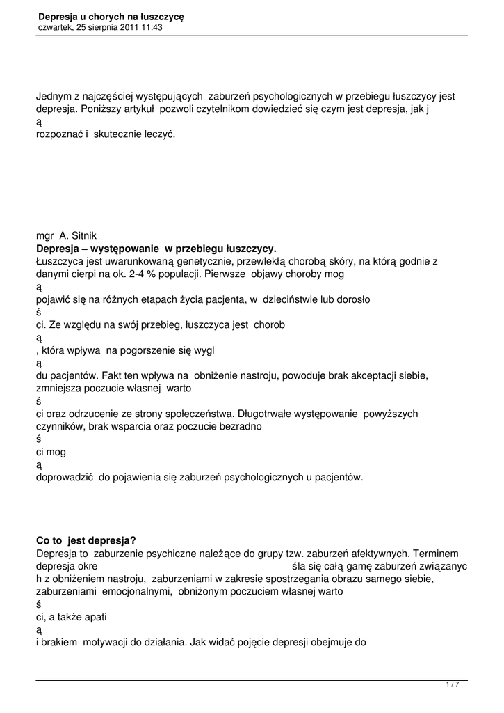 Depresja u chorych na łuszczycę czwartek, 25 sierpnia 2011 11:43 Jednym z najczęściej występujących zaburzeń psychologicznych w przebiegu łuszczycy jest depresja. Poniższy artykuł pozwoli czytelnikom dowiedzieć się czym jest depresja, jak j ą rozpoznać i skutecznie leczyć. mgr A. Sitnik Depresja – występowanie w przebiegu łuszczycy. Łuszczyca jest uwarunkowaną genetycznie, przewlekłą chorobą skóry, na którą godnie z danymi cierpi na ok. 2-4 % populacji. Pierwsze objawy choroby mog ą pojawić się na różnych etapach życia pacjenta, w dzieciństwie lub dorosło ś ci. Ze względu na swój przebieg, łuszczyca jest chorob ą , która wpływa na pogorszenie się wygl ą du pacjentów. Fakt ten wpływa na obniżenie nastroju, powoduje brak akceptacji siebie, zmniejsza poczucie własnej warto ś ci oraz odrzucenie ze strony społeczeństwa. Długotrwałe występowanie powyższych czynników, brak wsparcia oraz poczucie bezradno ś ci mog ą doprowadzić do pojawienia się zaburzeń psychologicznych u pacjentów. Co to jest depresja? Depresja to zaburzenie psychiczne należące do grupy tzw. zaburzeń afektywnych. Terminem depresja okre śla się całą gamę zaburzeń związanyc h z obniżeniem nastroju, zaburzeniami w zakresie spostrzegania obrazu samego siebie, zaburzeniami emocjonalnymi, obniżonym poczuciem własnej warto ś ci, a także apati ą i brakiem motywacji do działania. Jak widać pojęcie depresji obejmuje do 1/7 Depresja u chorych na łuszczycę czwartek, 25 sierpnia 2011 11:43 ś ć szerokie spektrum zaburzeń, różni ą cych się między sob ą przyczyn ą występowania, przebiegiem oraz możliwo ś ci ą leczenia. Jednak niezależnie od przyczyny pojawienia się zaburzeń depresyjnych, niew ą tpliwie wymagaj ą one leczenia i interwencji specjalisty. Przyczyny występowania depresji Trudno jednoznacznie odpowiedzieć na pytanie co jest przyczyną pojawiania się depresji. Jest to kwestia do ść złożona, gdyż czynników wpływaj ą cych na wyst ą pienie oraz utrzymywanie się objawów depresyjnych może być wiele. Dla ułatwienia zrozumienia tego zagadnienia, w literaturze przedmiotu wyróżnia się trzy podstawowe rodzaje depresji: • Depresja endogenna – to stany depresyjne pojawiające się w przebiegu chorób afektywnych oraz zaburzeń schizoaktywnych. Do głównych objawów tego rodzaju depresji należ ą : nagłe i bezpodstawne obniżenie nastroju, brak motywacji do działania, smutek, przygnębienie, wahania nastrojów, bóle głowy, utrata apetytu, lęk oraz brak chęci do życia • Depresje psychogenne - są to stany depresyjne, które pojawiają się w związku z występowaniem niekorzystnych czynników natury psychologicznej np. konflikty wewnętrzne lub też wpływaj ące na psychikę czynniki zewnętrze np. żałoba, strata, trudno ś ci w adaptacji. Głównymi objawami tego rodzaju depresji s ą : rozdrażnienie, zniecierpliwienie, płacz i rezygnacja, konflikty z otoczenie, poczucie krzywdy, obwiniane otoczenia. • Depresje objawowe - są to stany depresyjne pojawiające się w schorzeniach somatycznych, zwi ązane są z przyjmowaniem leków oraz innych substancji, uzależnieniami ( ź 2/7 Depresja u chorych na łuszczycę czwartek, 25 sierpnia 2011 11:43 ródło: www.leczdepresje.pl ) Jak rozpoznać depresję? Każdy z nas doświadczył w swoim życiu uczucia smutku, przygnębienia czy też braku motywacji. Często w takich sytuacjach używamy terminu „depresja” na okre enie naszego aktualnego stanu psychicznego. Należy jednak pamiętać, iż depresja jest zaburzeniem psychicznym i aby zdiagnozować jej występowanie u danego pacjenta musz ą zostać uwzględnione następuj ą ce aspekty dotycz ą ce: • • • • śl nasilenia objawów czasu ich występowania wpływu objawów na poziom funkcjonowania w życiu codziennym człowieka skuteczność farmakoterapii Pewnej diagnozy w zakresie występowania depresji może dokonać jedynie specjalista psychiatra lub psycholog. Diagnoza tego rodzaju zaburzenia odbywa się w oparciu o klasyfikację i występowanie objawów według klasyfikacji Amerykańskiego Towarzystwa Psychiatrycznego DMS IV (Diagnostic and Statistical Manual of Mental Disorders) lub Międzynarodowej Klasyfikacji Chorób czyli ICD 10. Oczywistym jest, iż przebieg depresji u każdego człowieka może być inny, objawy mogą występować z mniejszym lub większym nasileniem. Dlatego, przyjmuje się, że aby zdiagnozować u danego pacjenta zaburzenia depresyjne musz ą zostać spełnione następuj ą ce warunki: • obniżenie nastroju, niechęć do podejmowania aktywności oraz brak zainteresowania podjęciem jakiegokolwiek działania musz ą się utrzymywać przez co najmniej dwa pełne tygodnie • musi wystąpić co najmniej pięć z poniższych, charakterystycznych dla depresji objawów” • spadek bądź wzrost masy ciała • spadek lub brak zainteresowania seksem • wrażenie ciągłego zmęczenia • przygnębienie i obniżenie nastroju panujące przez większość dnia 3/7 Depresja u chorych na łuszczycę czwartek, 25 sierpnia 2011 11:43 • • • • • utrata zainteresowania czynnościami które do tej pory sprawiały przyjemność trudności z zasypianiem, bezsenność, lub nadmierna senność, chęć przesypiania całych dni poczucie niskiej wartości, winy, beznadziei trudności z koncentracją, zapamiętywaniem niechęć do życia, myśli samobójcze, podejmowanie prób samobójczych Depresja u osób chorych na łuszczycę. Dotychczasowe wynik badań pokazują dwukierunkowy charakter zaburzeń psychicznych występuj ących w przewlekłych chorobach skóry jaką jest łuszczyca. Z jednej strony choroba wpływa na psychikę pacjenta, z drugiej strony psychika pacjenta wpływa na przebieg oraz zaostrzenie się choroby. Zaburzenia depresyjne s ą jedn ą z trzech najczę ś ciej występuj ą cych grup zaburzeń psychicznych jakie można spotkać u pacjentów z łuszczyc ą . Bior 